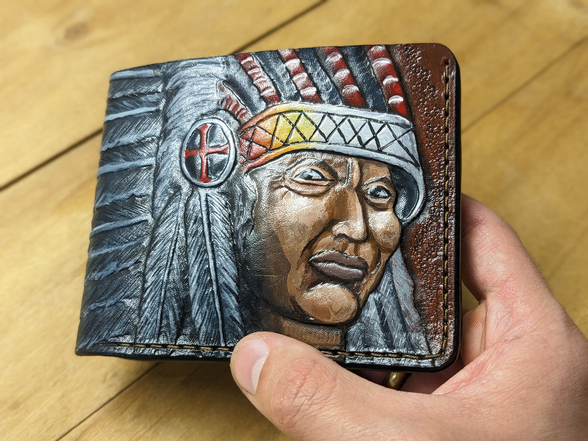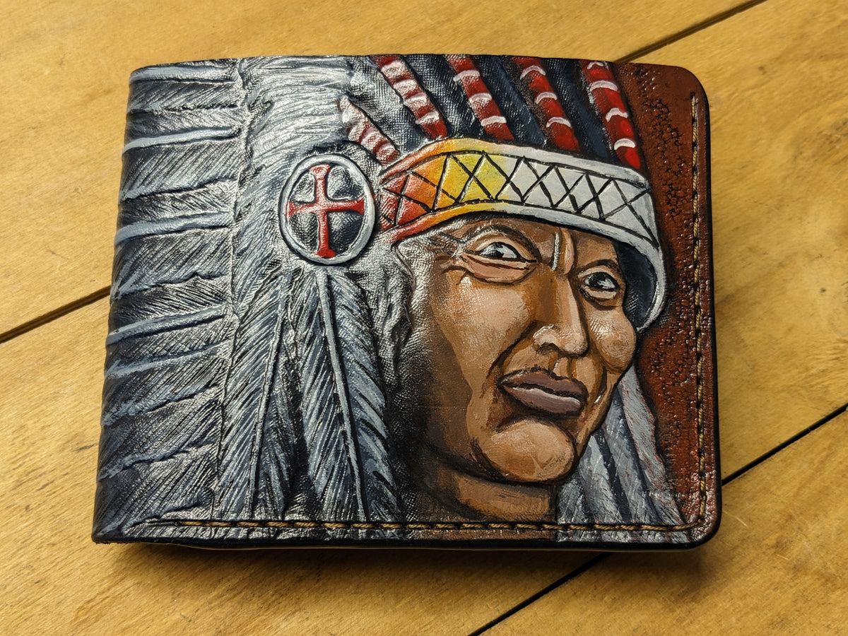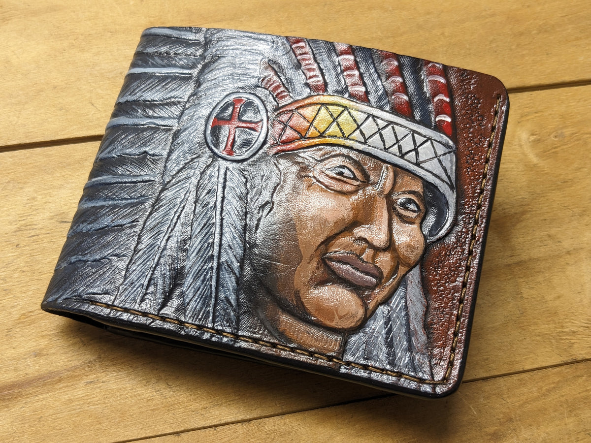 Honor tradition and craftsmanship with this handmade bifold leather wallet featuring a detailed embossed design of a Native American warrior chief in a ceremonial headdress. Inspired by Native heritage and spiritual symbolism, this RFID-protected wallet combines artistry and utility. It's an ideal gift for history buffs, cultural art lovers, and anyone who respects the spirit of the warrior and indigenous culture.