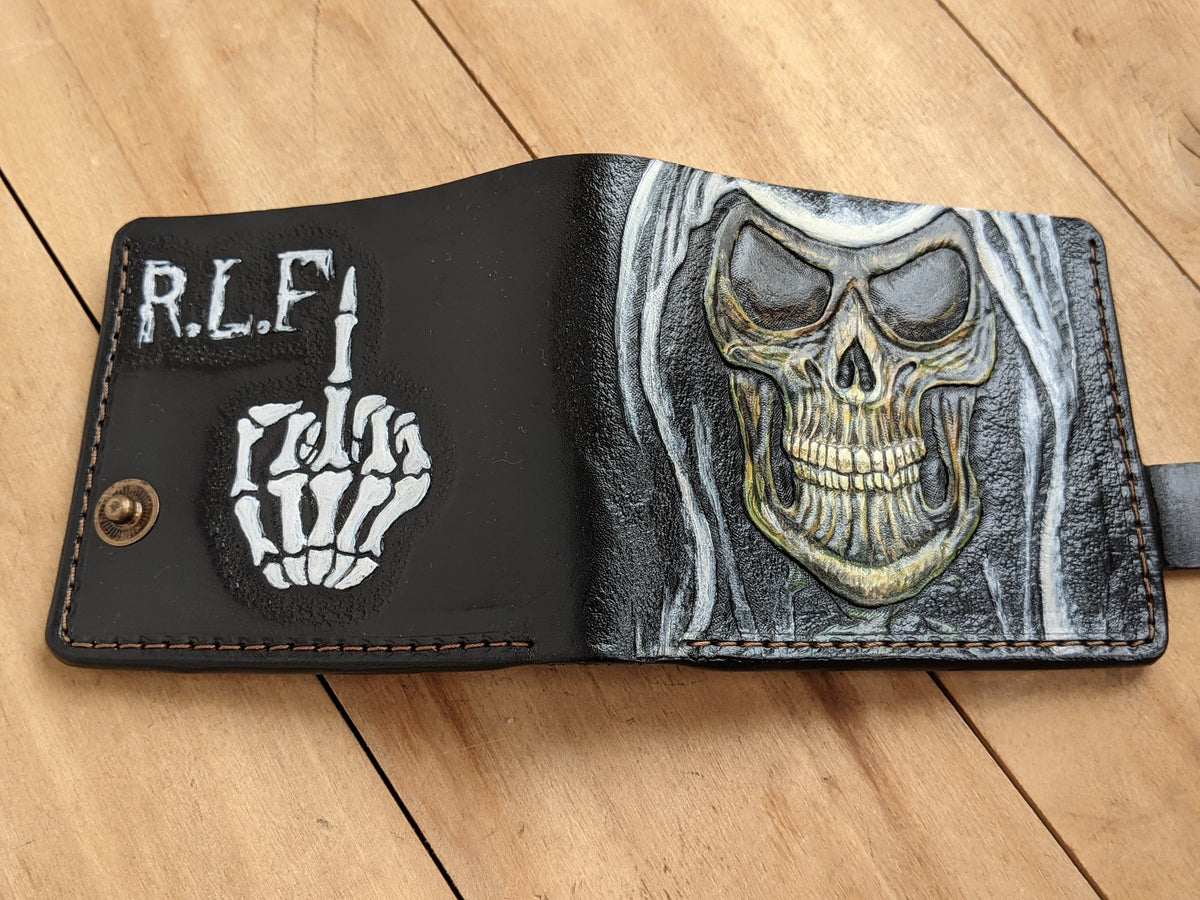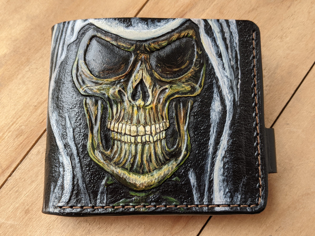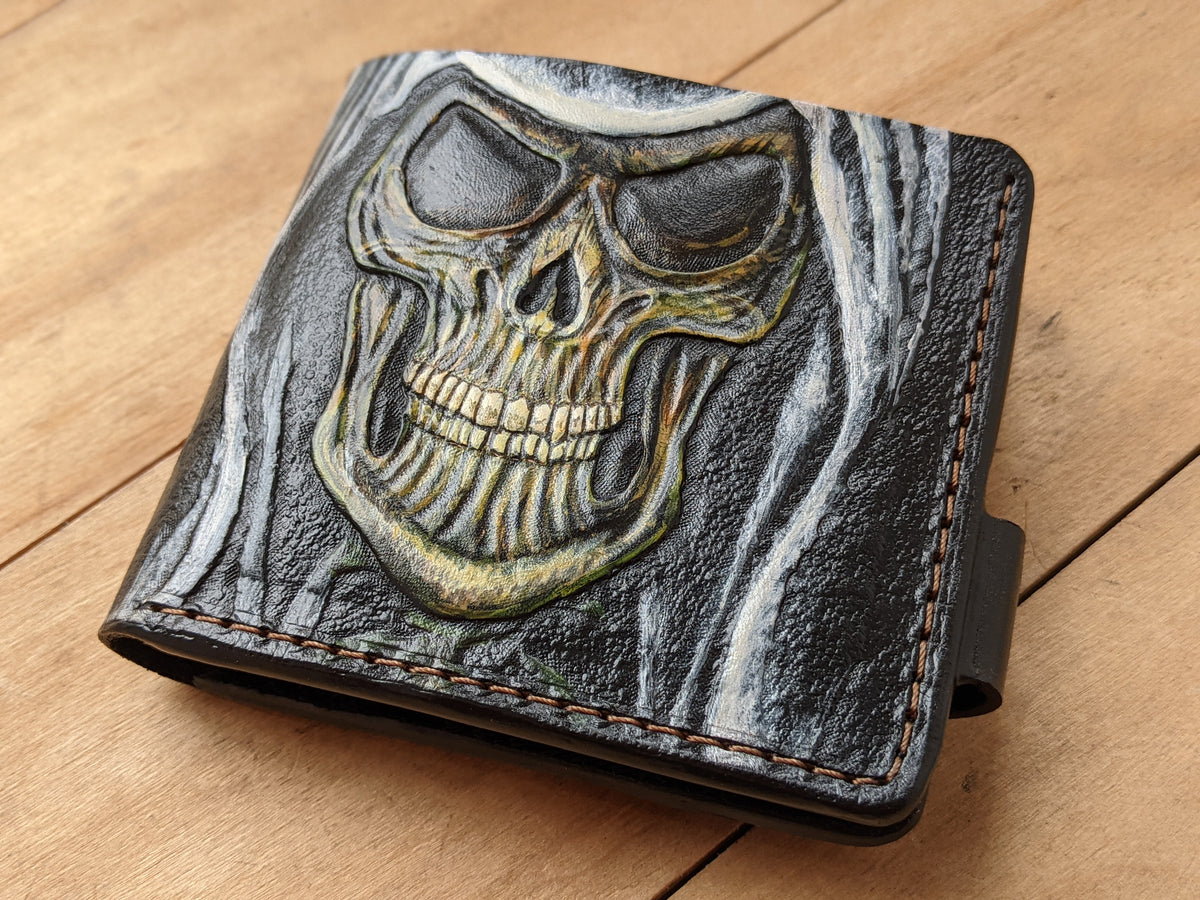 Our exquisite handmade leather wallet, crafted from high-quality vegetable-tanned leather. This unique wallet features stunning hand-tooled and hand-painted designs, making it a true work of art.