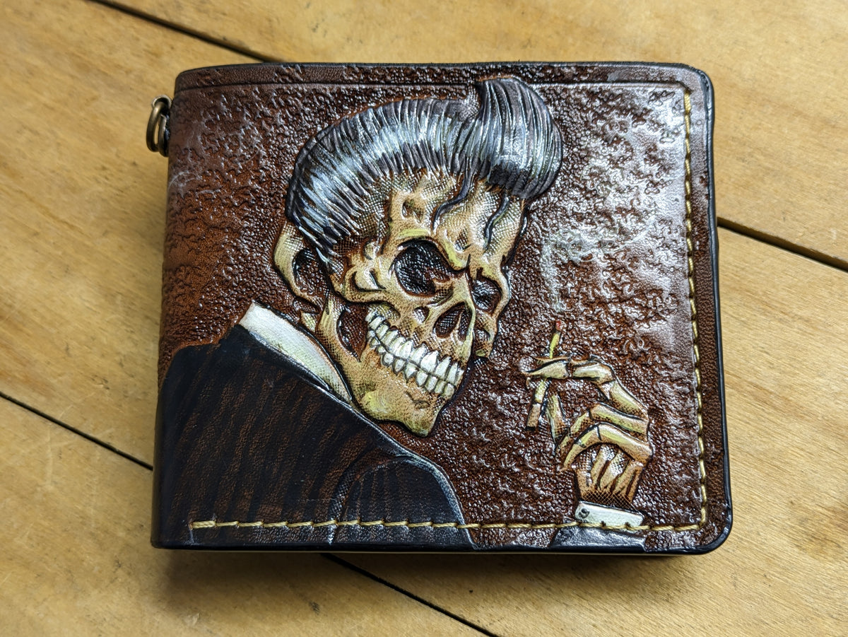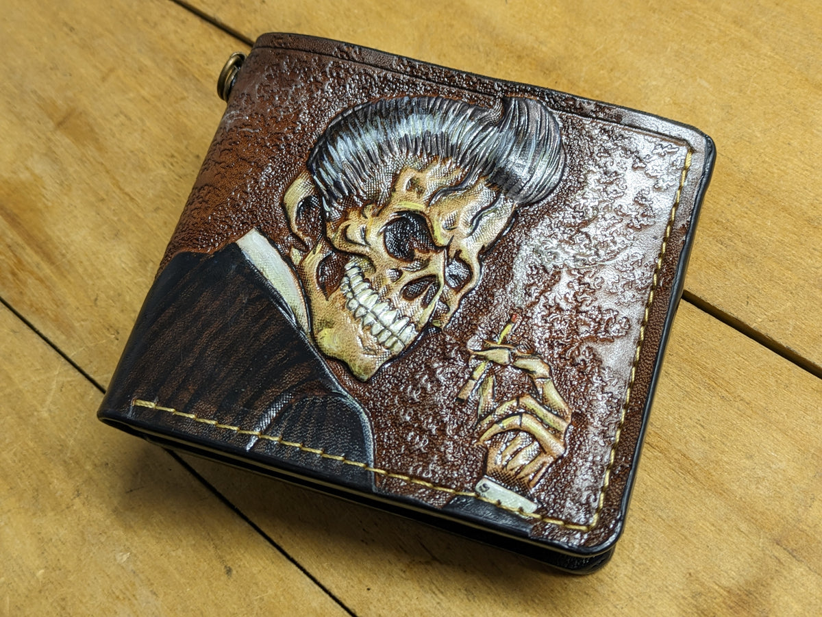 Channel vintage cool with this handmade bifold leather wallet, showcasing a sharply styled gangster skull with a classic pompadour haircut and a smoking cigar. This design fuses retro rockabilly charm with mafia-inspired edge, perfect for those who appreciate timeless attitude and leather-crafted durability. Whether you're a fan of 1950s flair, street style, or just love bold statement pieces, this wallet makes a standout everyday carry or a unique gift for rebels with style.