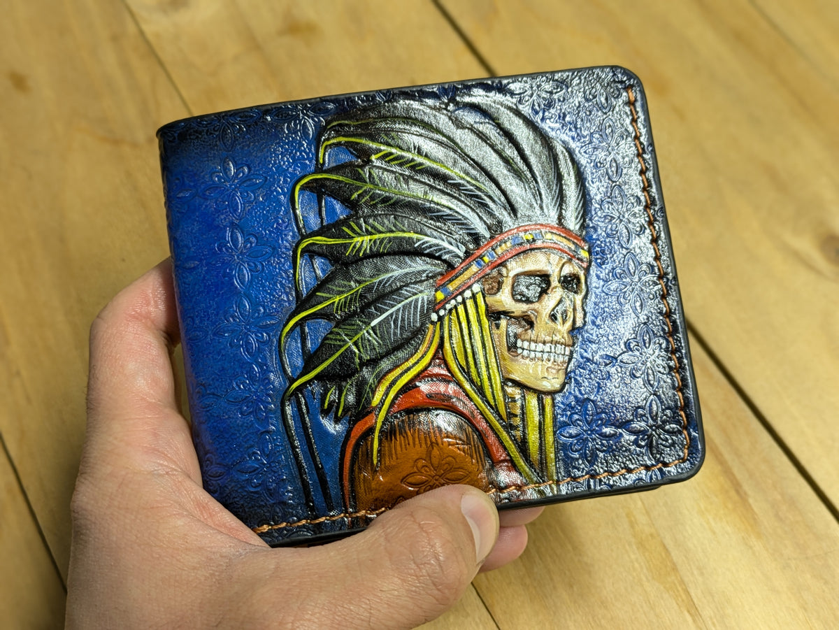 Honor the spirit of the warrior with this handmade bifold leather wallet, featuring an intricately embossed design of an Apache skeleton and a Native American chief skull wearing a traditional feathered headdress. This wallet blends bold symbolism with rugged craftsmanship, celebrating indigenous strength, cultural legacy, and frontier style. Made from genuine leather and built to last, it’s a meaningful accessory for those who value power, tradition, and statement-making design. Ideal as a gift for Western lifestyle enthusiasts, history buffs, and collectors of Native American-inspired art.