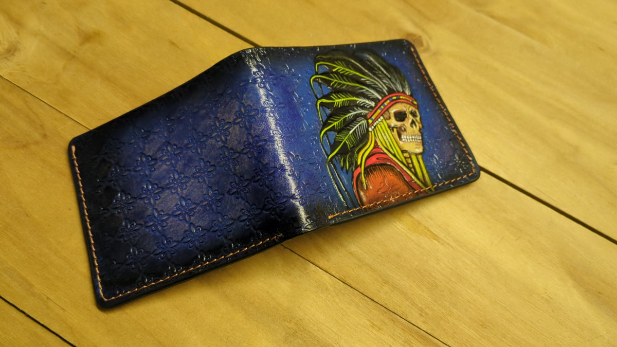 Our exquisite handmade leather wallet, crafted from high-quality vegetable-tanned leather. This unique wallet features stunning hand-tooled and hand-painted designs, making it a true work of art.