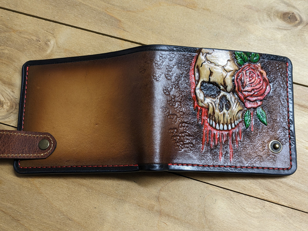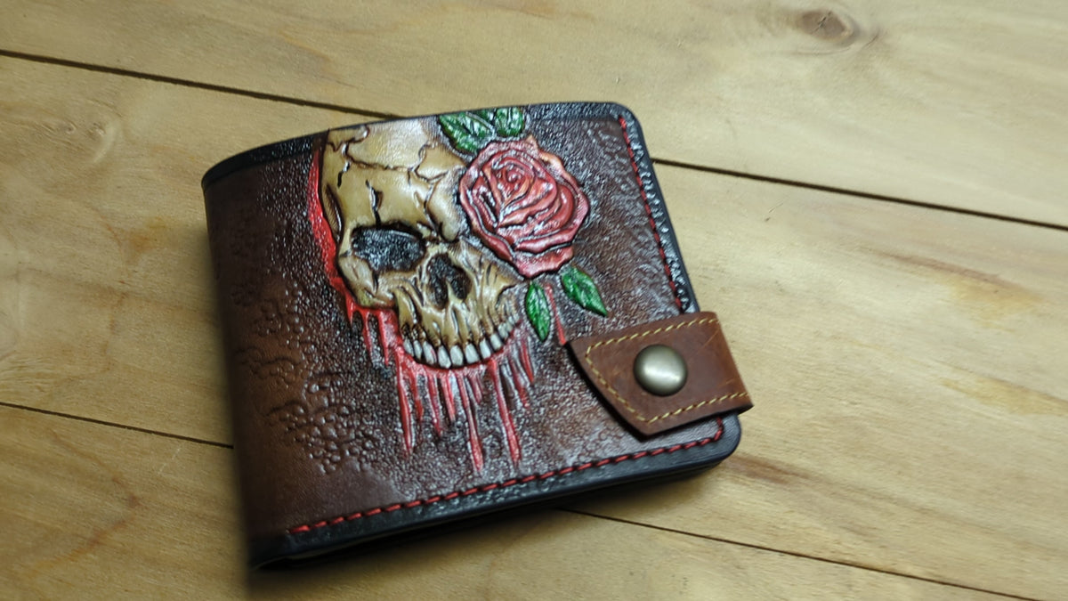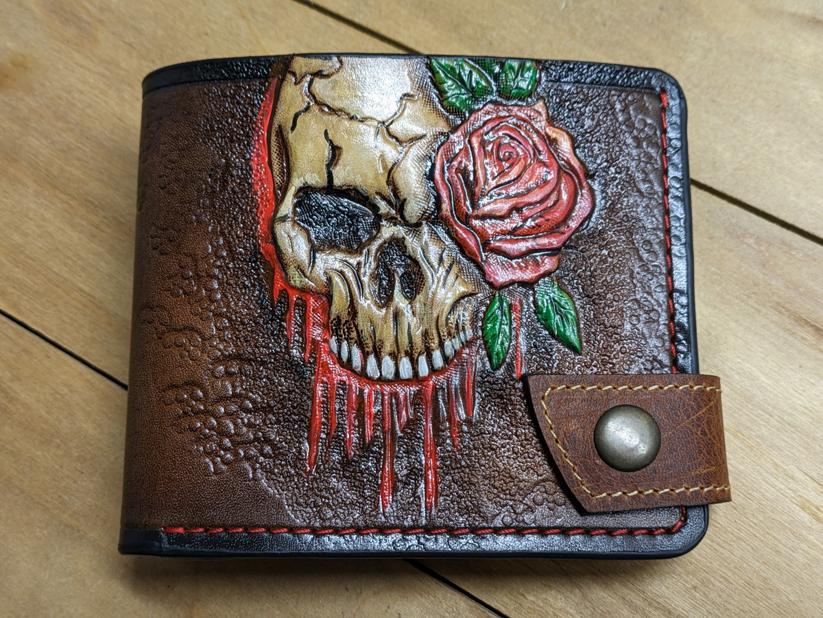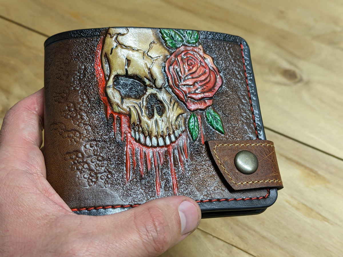 This handmade bifold leather wallet captures the chilling beauty of decay and darkness with its detailed embossed design of a melting skull, zombie skeleton, and vivid red rose. A striking blend of horror and gothic symbolism, it’s perfect for those who appreciate the macabre, undead aesthetics, and bold statement accessories. Crafted from genuine leather with rugged durability, this wallet makes a standout gift for zombie fans, horror collectors, or anyone drawn to eerie elegance.