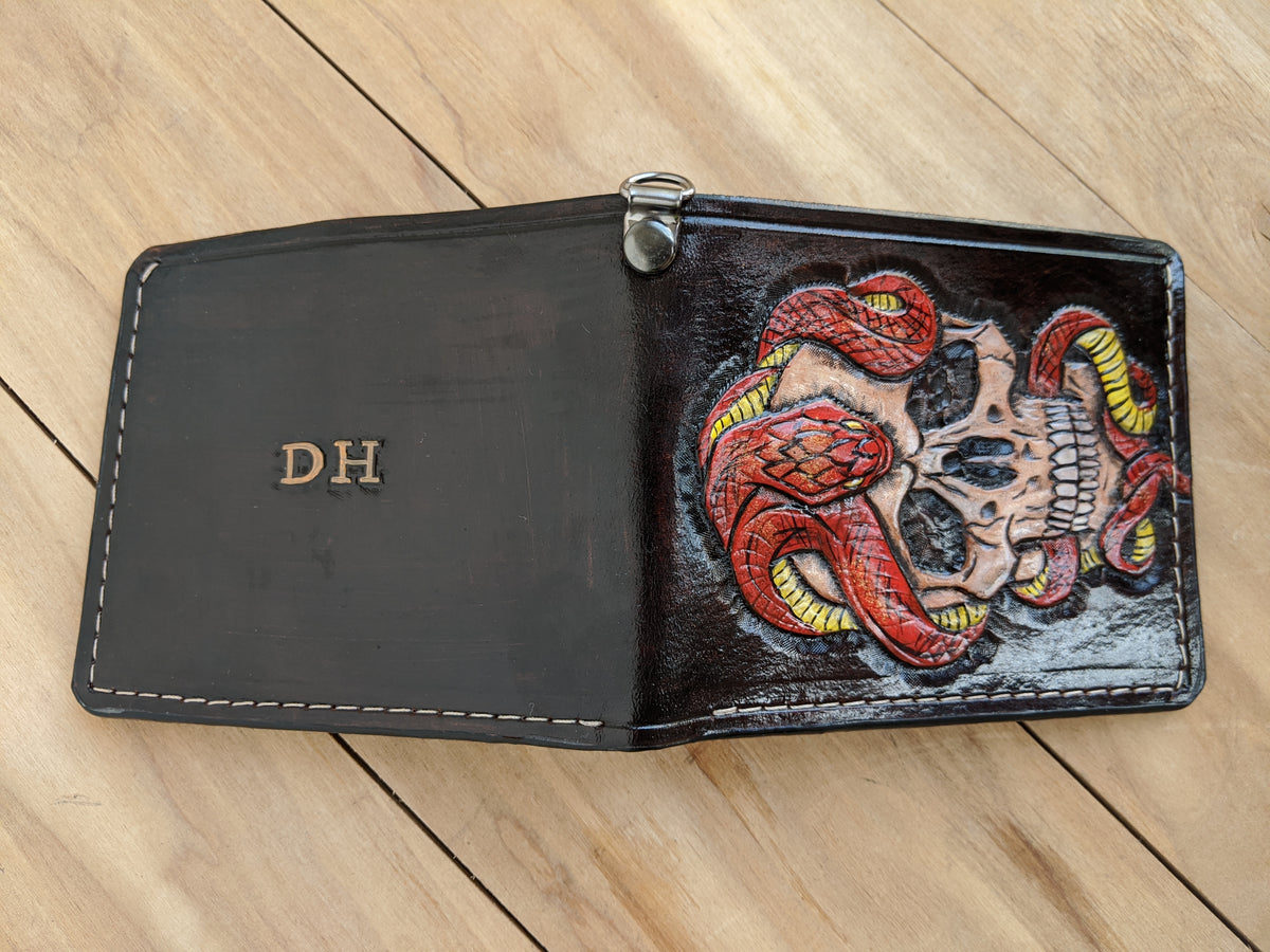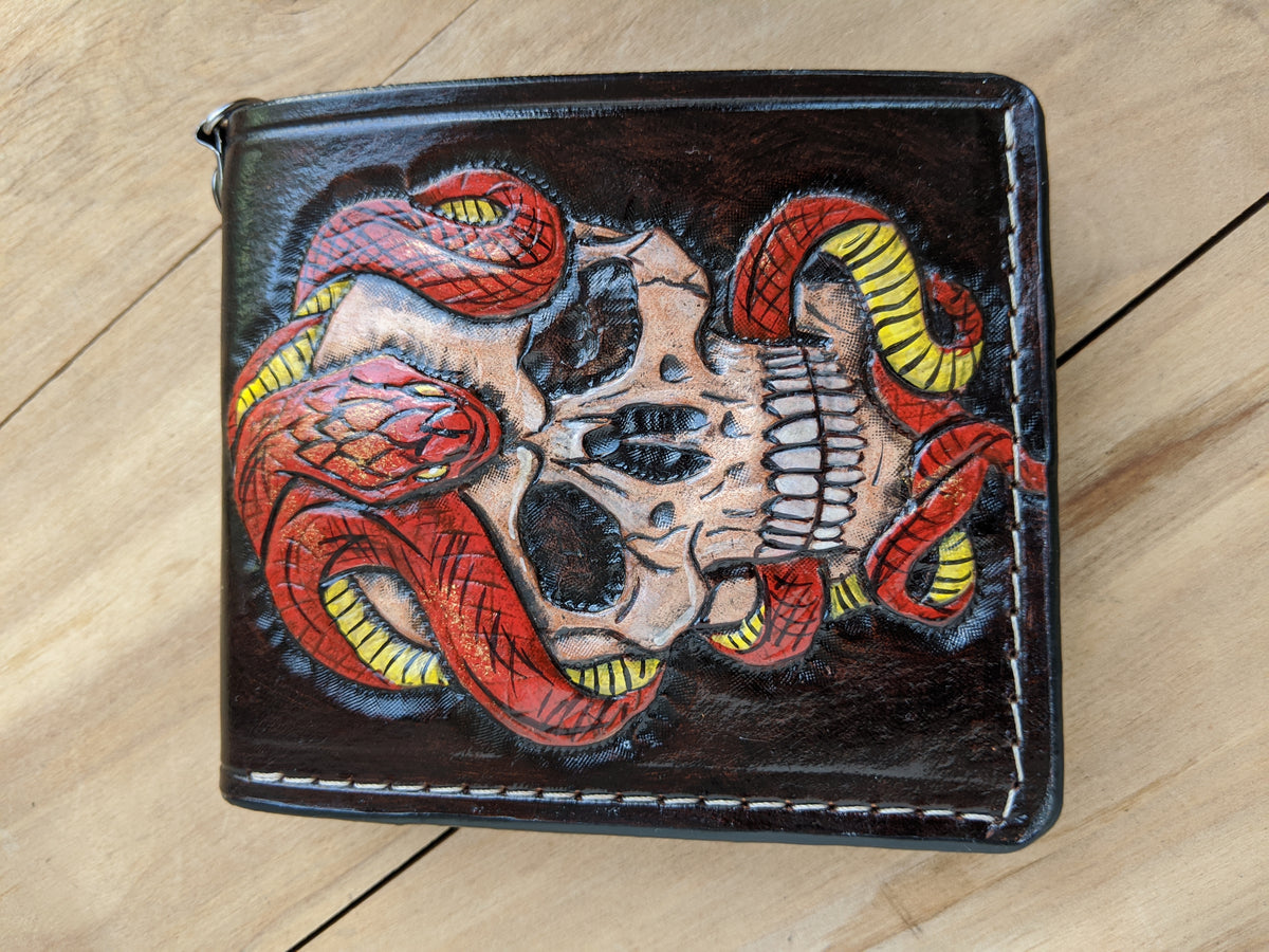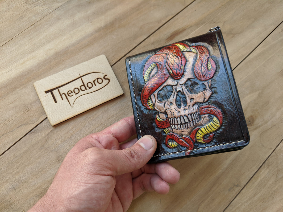 Handmade leather wallet with embossed cobra snake, skull, and python skeleton design. This fierce bifold captures the raw power and mystique of serpents—symbols of danger, transformation, and primal energy. Meticulously crafted from genuine leather, it’s a bold statement piece for reptile lovers, tattoo art fans, and those drawn to dark, nature-inspired themes. Perfect as a gift for snake enthusiasts and lovers of edgy, animal-themed accessories.