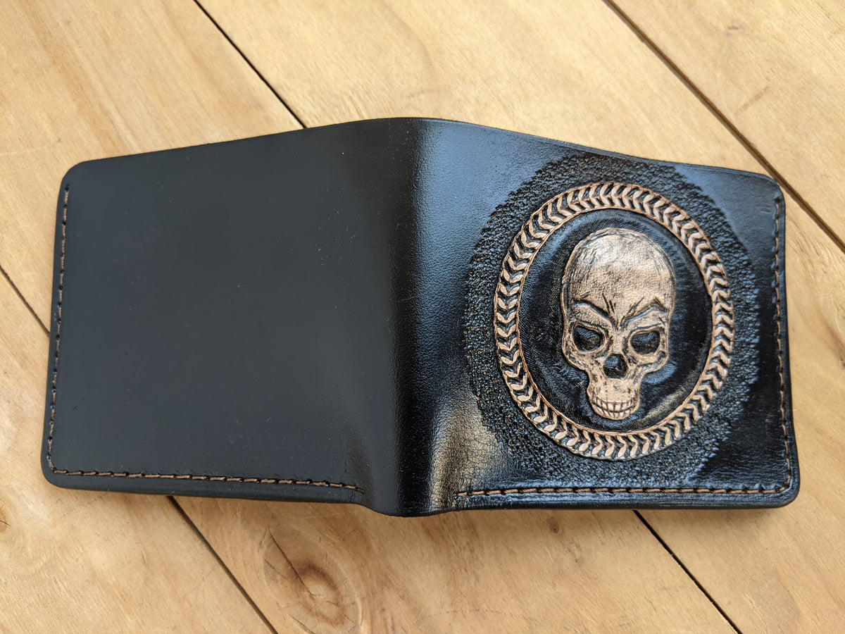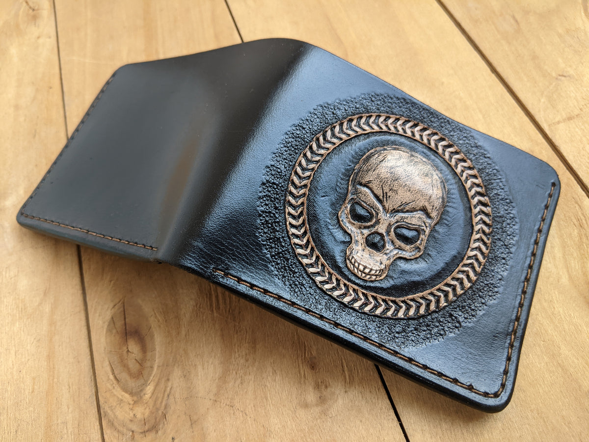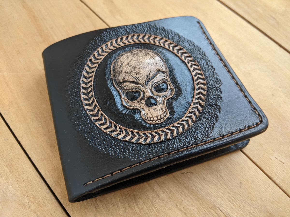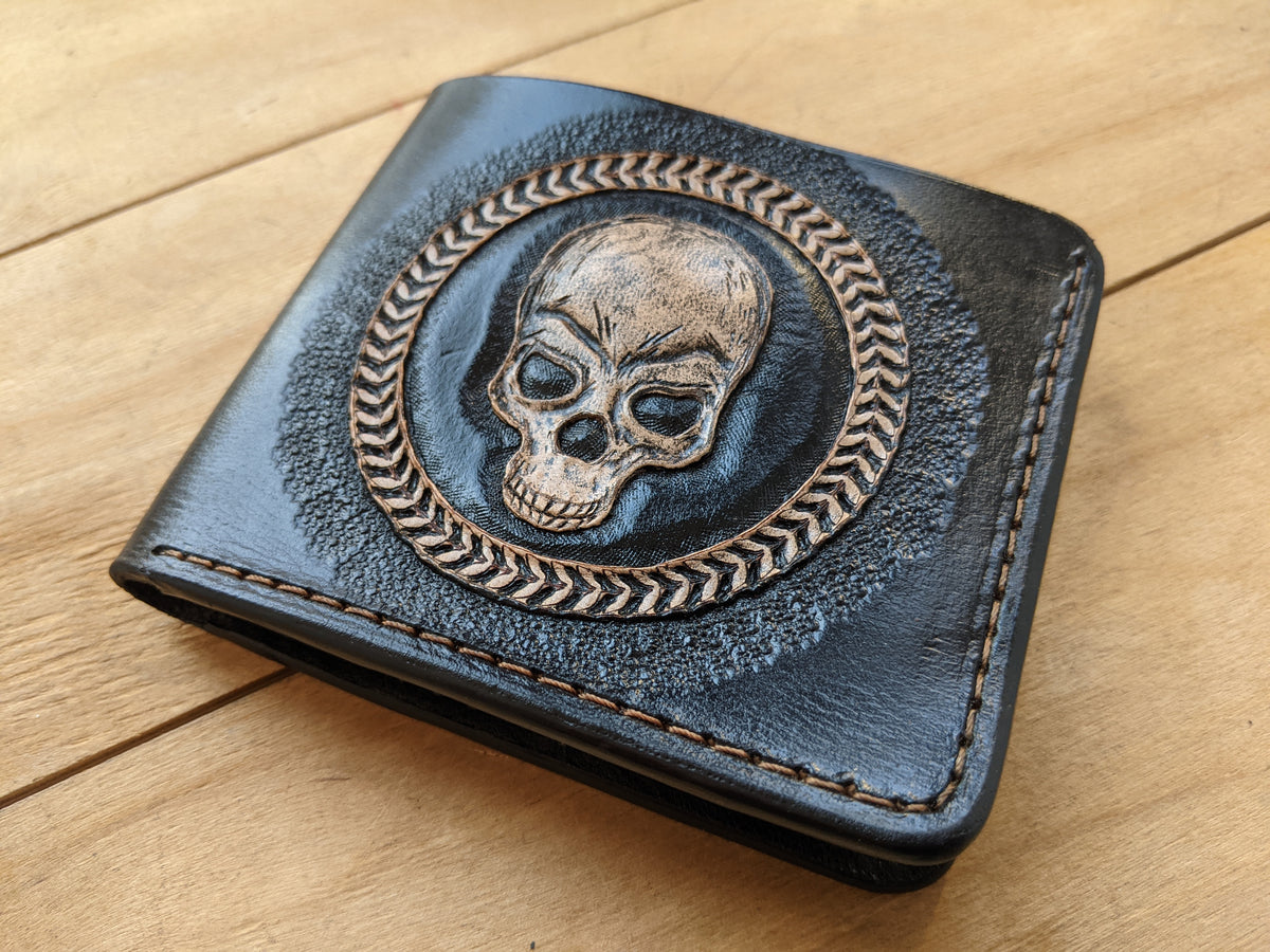 Handmade leather wallet with embossed skull and skeleton artwork. This classic bifold design brings together gothic style and rugged craftsmanship in a bold, timeless piece. With detailed bone and skull engraving, it's perfect for fans of dark art, alternative fashion, or those who simply love skull-themed accessories. A standout gift for horror lovers, goths, and collectors of edgy leather gear.