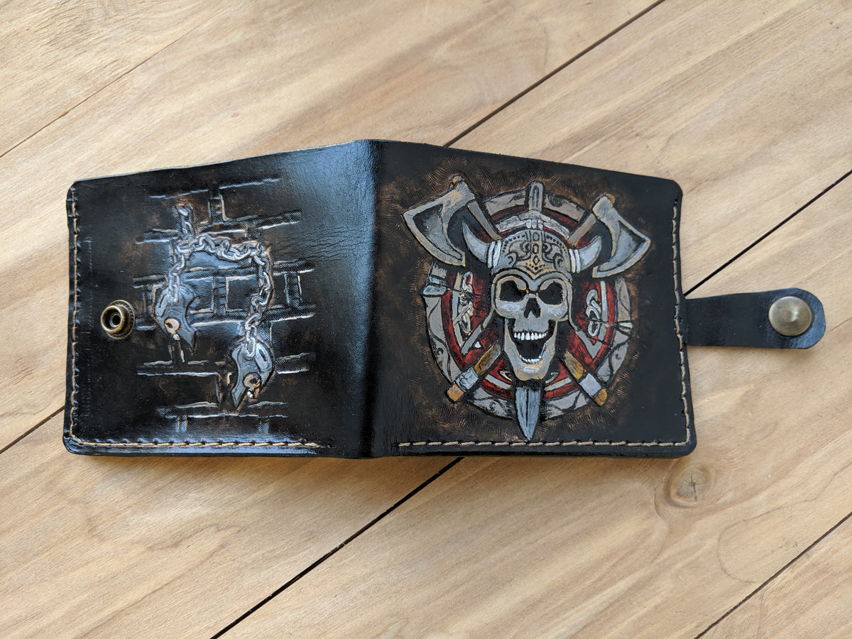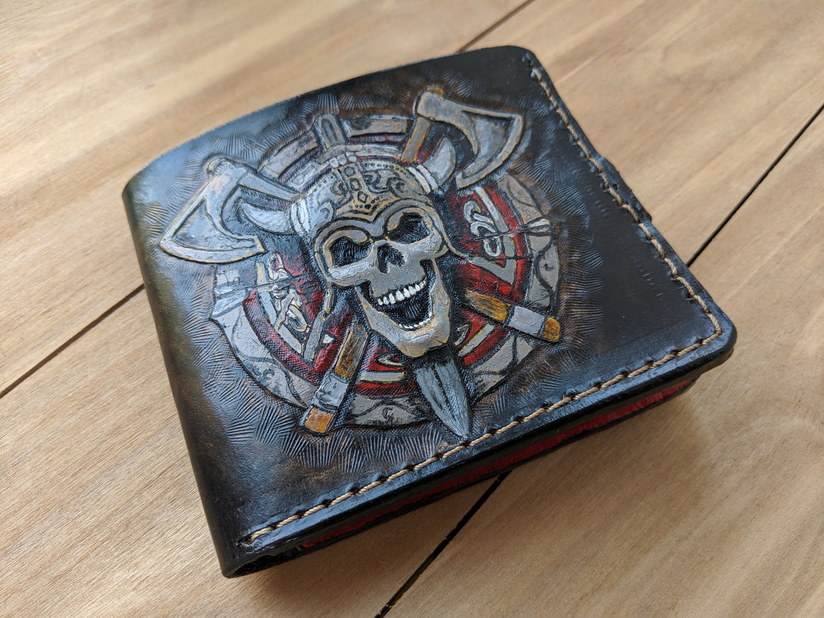 Handmade leather wallet with embossed Viking warrior skull and skeleton design. Featuring Norse-inspired detailing, this rugged bifold captures the spirit of battle, bravery, and ancient warrior legacy. Crafted from genuine leather, it blends gothic boldness with Viking mythology—ideal for fans of Norse culture, skull art, and fearless style. A powerful gift for modern-day warriors, history buffs, and lovers of Viking-themed gear.