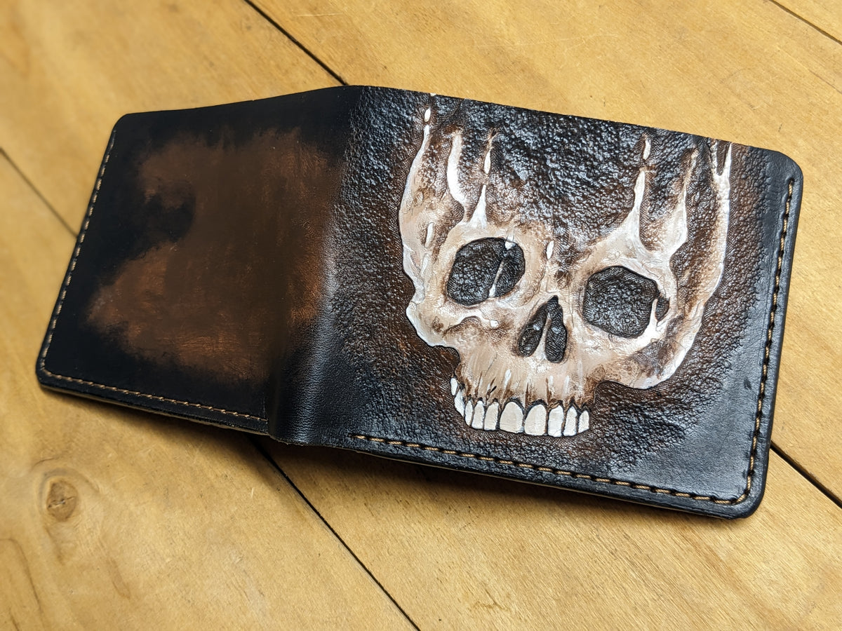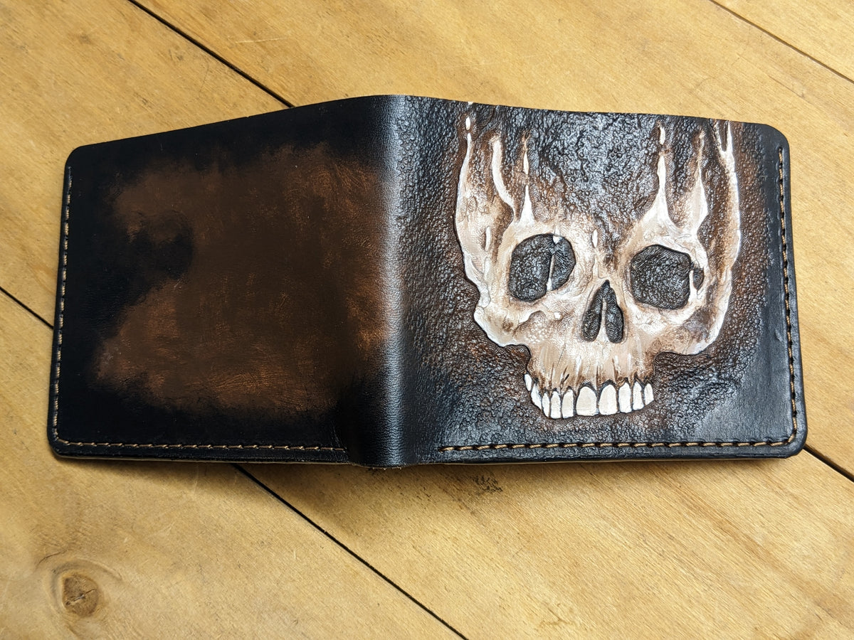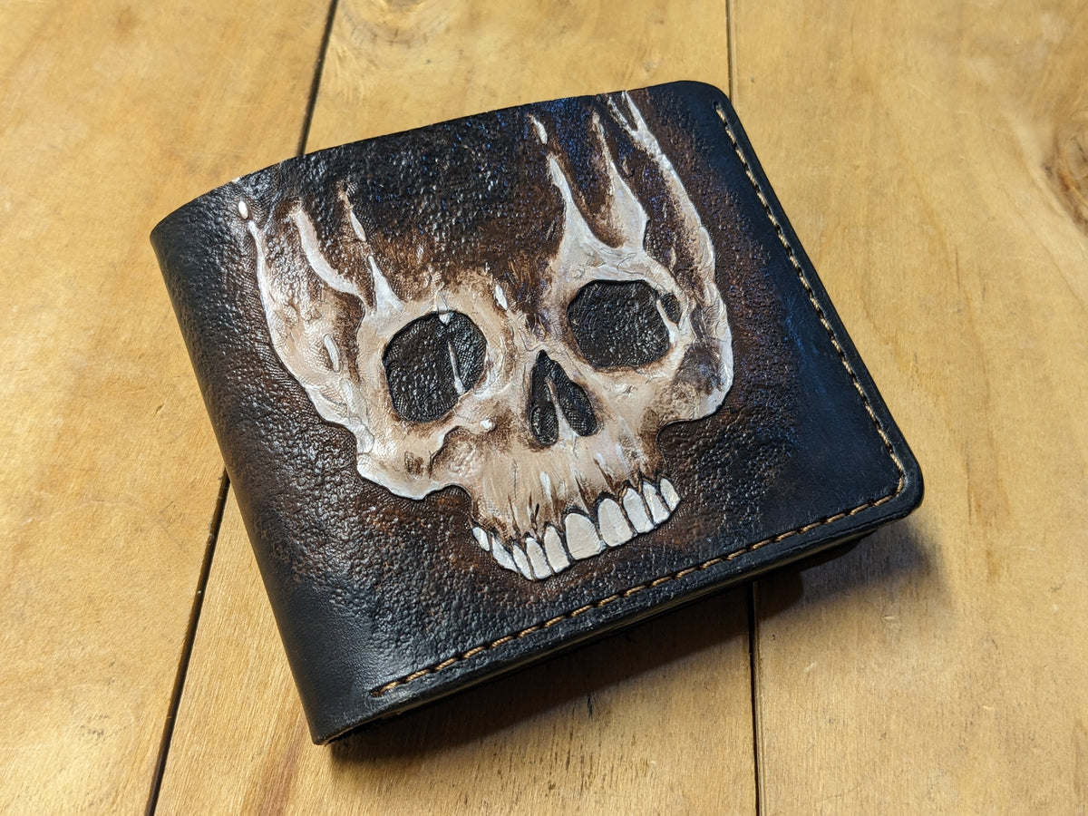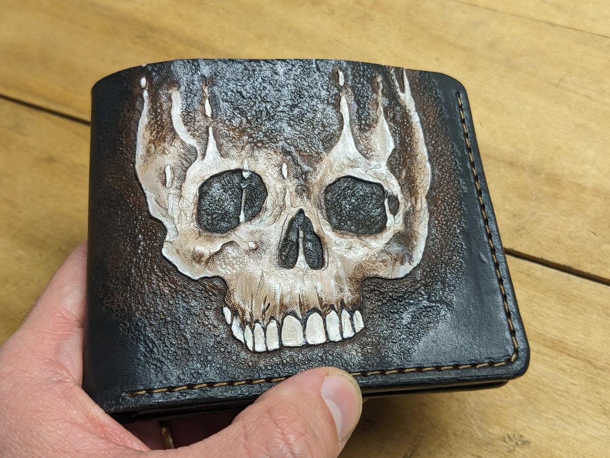 Handmade leather wallet with a chilling embossed design featuring a melting zombie skull and skeletal figure. This horror-themed bifold fuses undead grit with gothic style, making it perfect for fans of zombies, dark art, and macabre fashion. Crafted from genuine leather with detailed embossing, it’s a rugged and eye-catching accessory for Halloween lovers, horror collectors, and those who carry a taste for the eerie. A killer gift for the undead-obsessed.