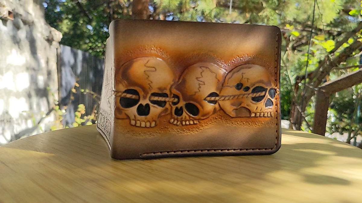 Handmade leather wallet featuring an embossed trio of Western skulls and a skeleton wielding a whip. This rugged bifold captures the rebellious spirit of the Wild West, blending outlaw attitude with dark, gritty style. Crafted from durable genuine leather, it’s perfect for fans of Western horror, skull art, and frontier legends. A unique gift for cowboys, collectors, and lovers of bold Western-themed accessories.
