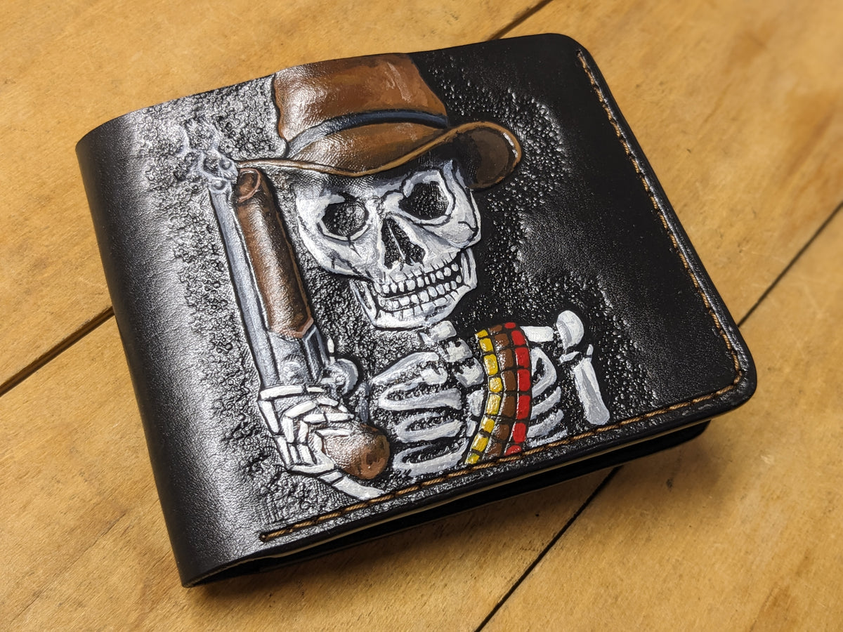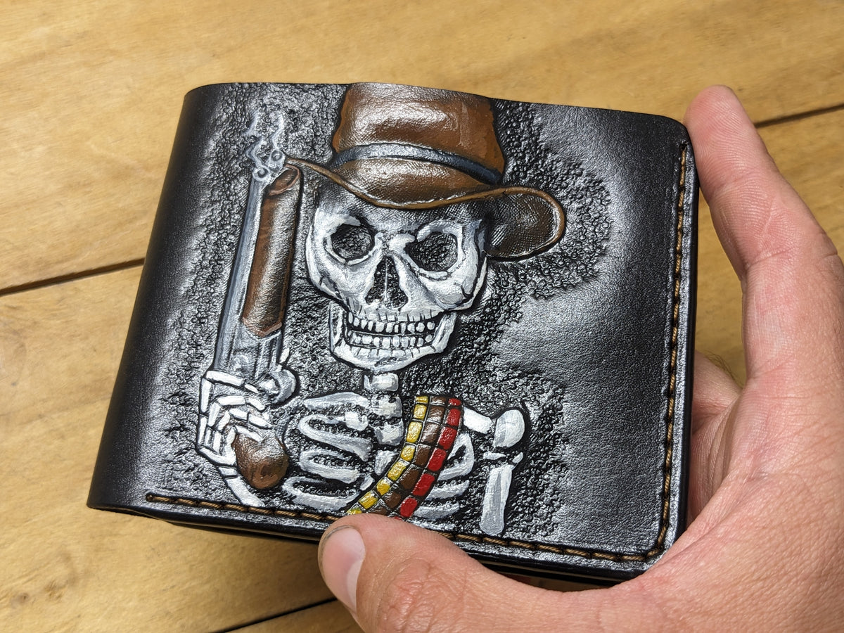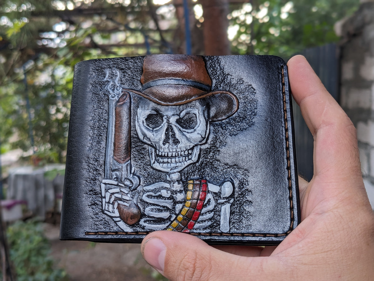 Handmade leather wallet featuring an embossed Western cowboy skull holding a rifle, alongside a lupara gun-wielding skeleton. This rugged bifold captures the fierce, lawless spirit of the Old West with gritty detail and outlaw energy. Crafted from genuine leather, it’s designed for those who embrace frontier style, cowboy legends, and bold skull art. A powerful gift for Western enthusiasts, gunslinger fans, and lovers of dark Americana.