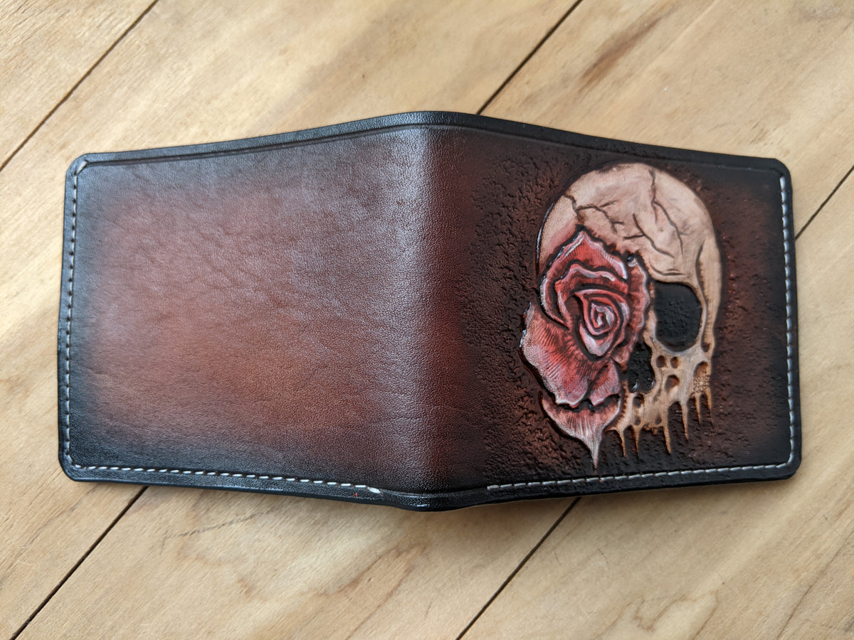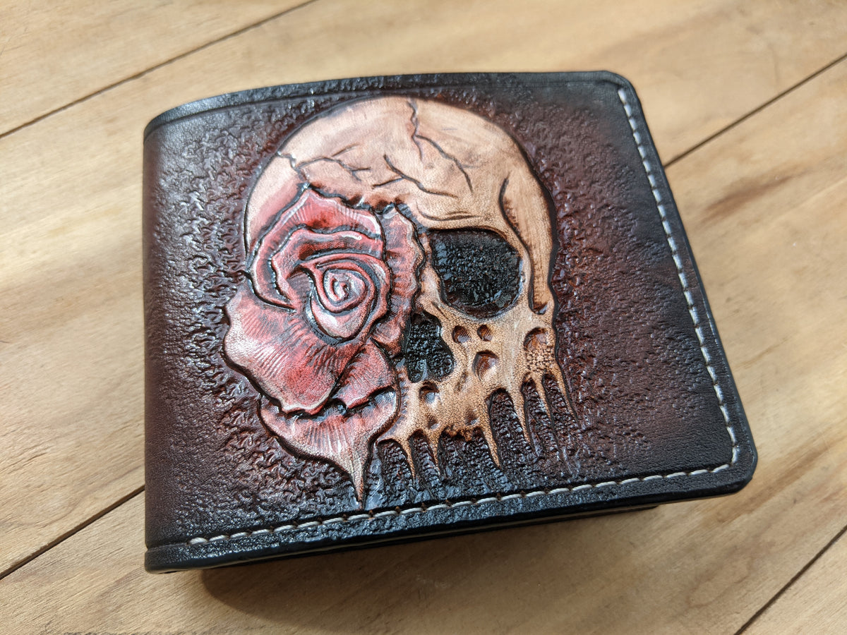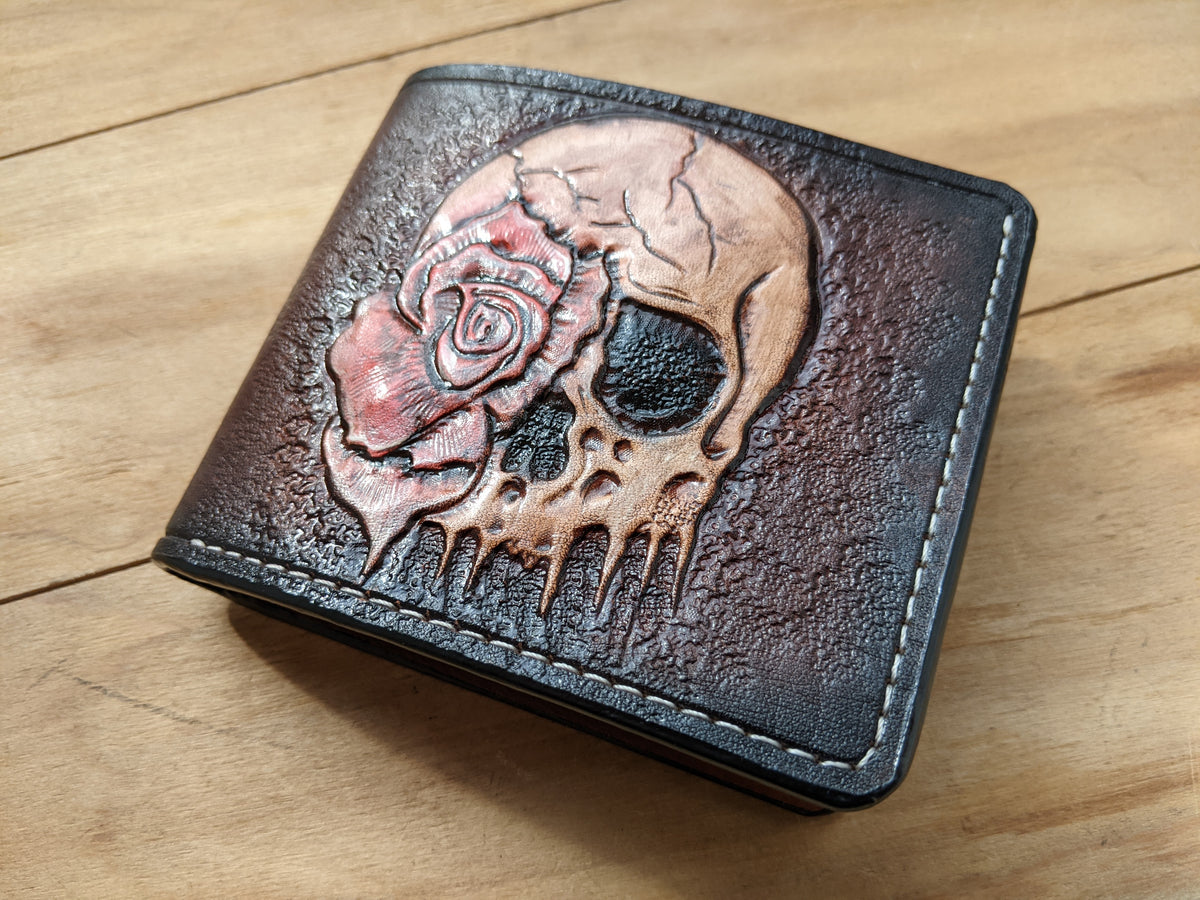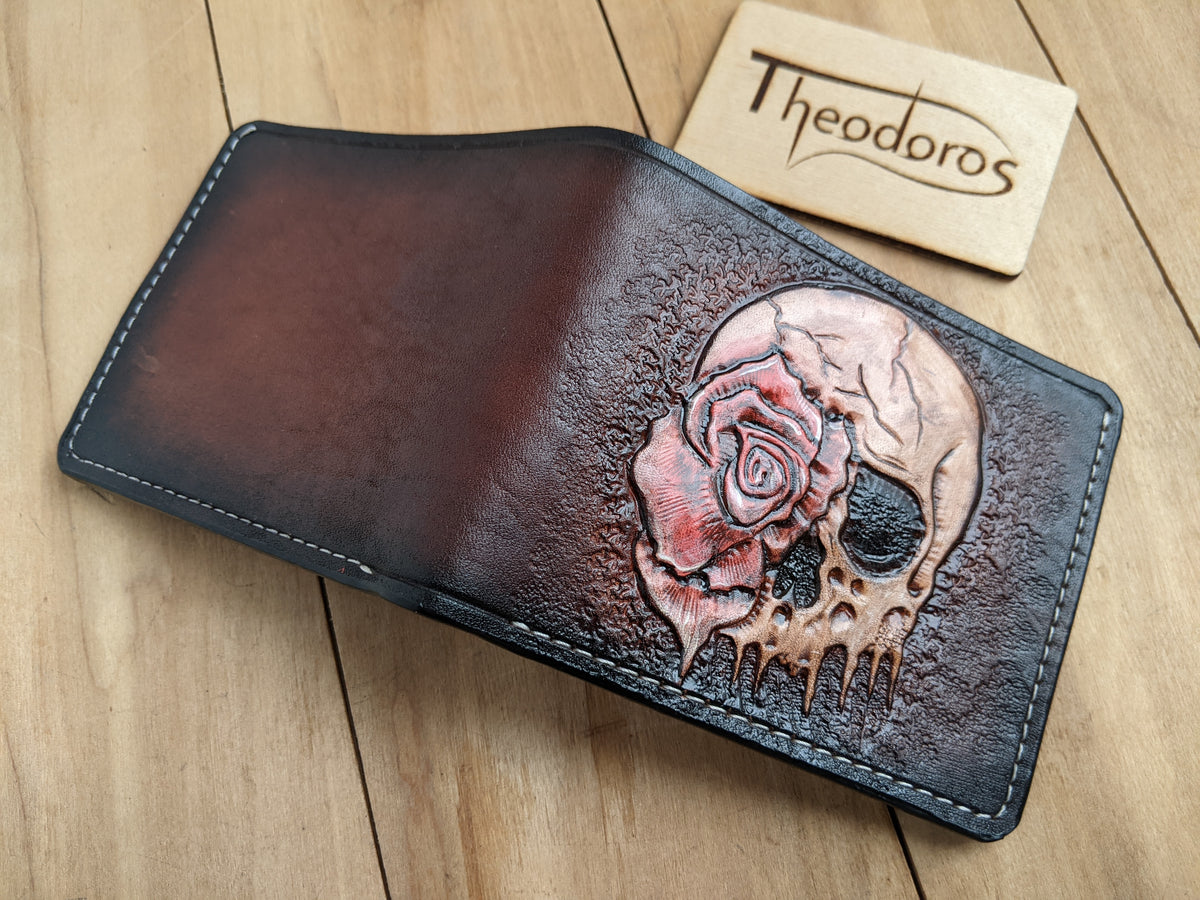 Handmade leather wallet featuring a haunting embossed design of a melting zombie skull, red rose flower, and skeletal figure. This gothic bifold fuses horror and beauty, symbolizing decay, love, and the fleeting nature of life. Expertly crafted from genuine leather, it's a bold accessory for fans of horror, zombie art, and macabre floral themes. A unique and edgy gift for Halloween lovers, gothic romantics, and collectors of dark, artistic designs.