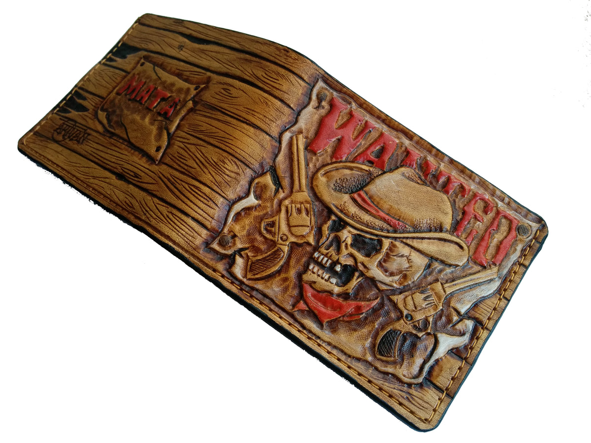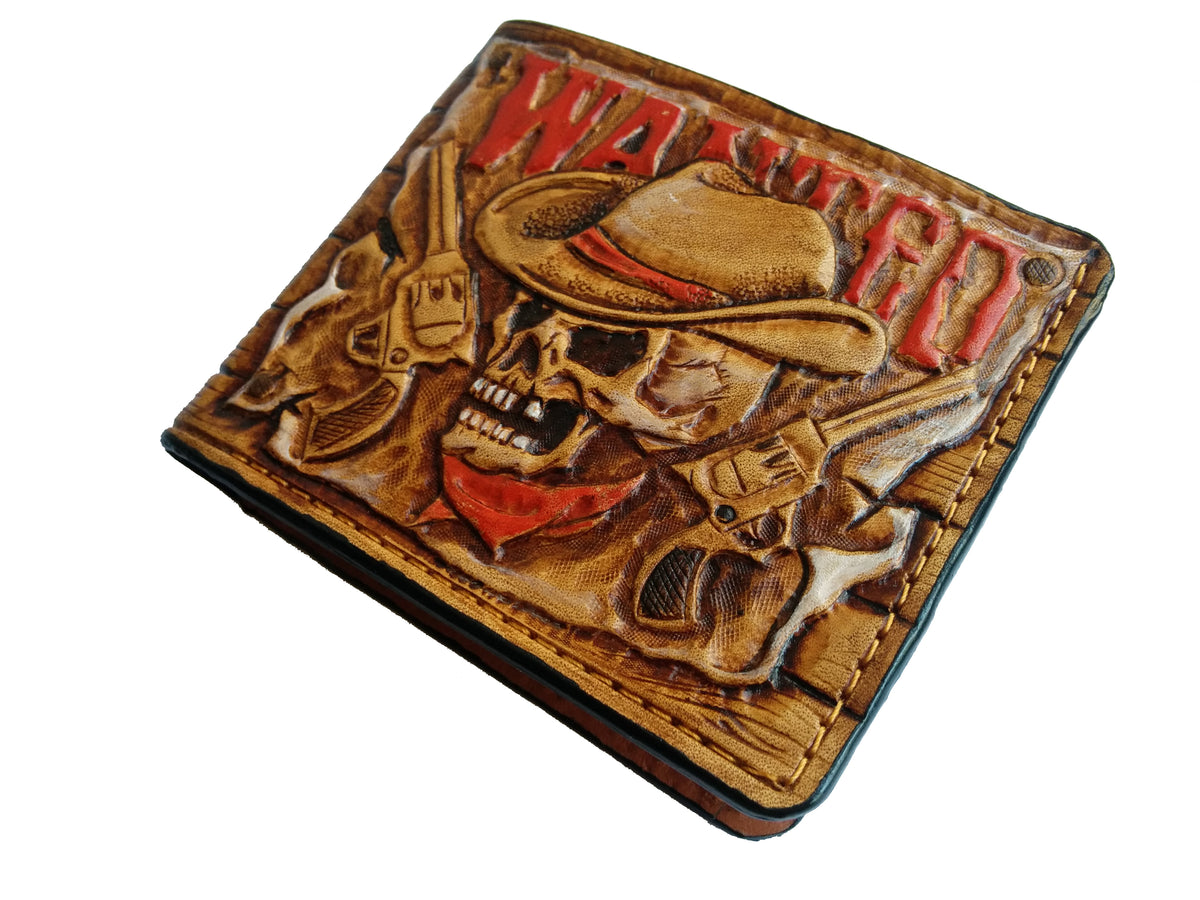 Bring outlaw energy to your pocket with this handmade leather wallet, embossed with a vintage “Wanted Poster” design featuring a cowboy skull and skeletal Western motif. Inspired by Wild West legends and classic Americana, this rugged bifold wallet blends edgy style with durable craftsmanship. A perfect gift for cowboys, collectors, and fans of frontier lore.