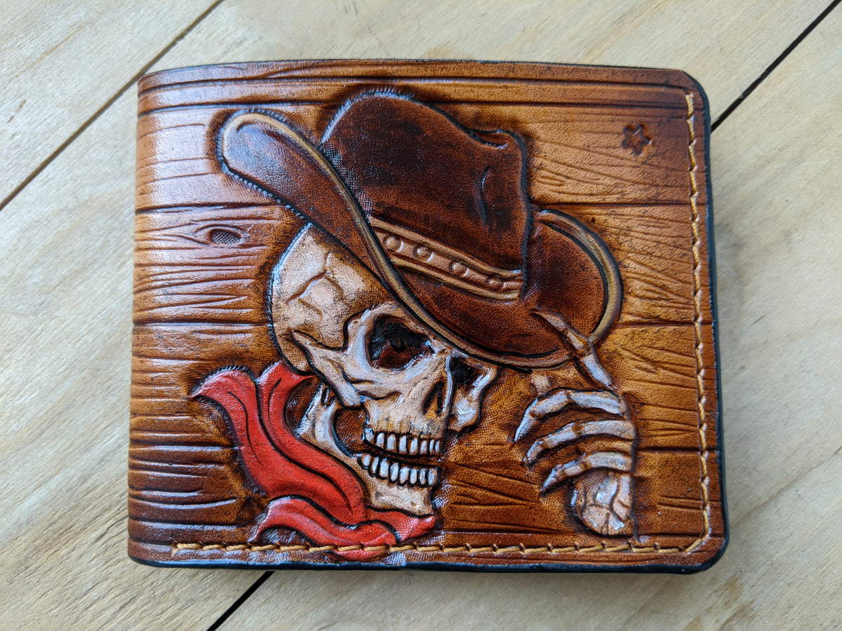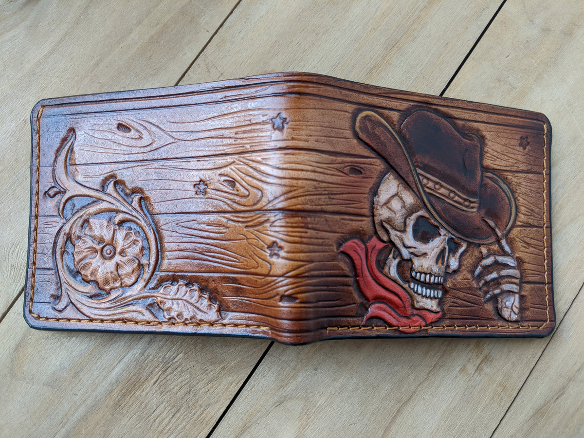 Saddle up with this handmade leather wallet featuring an embossed cowboy skull blended with classic Sheridan-style floral tooling. Combining Western grit with elegant craftsmanship, this bifold wallet is a tribute to the spirit of the American frontier. Made from genuine leather, it’s a rugged yet refined accessory—ideal for cowboys, ranchers, and lovers of Western artistry.