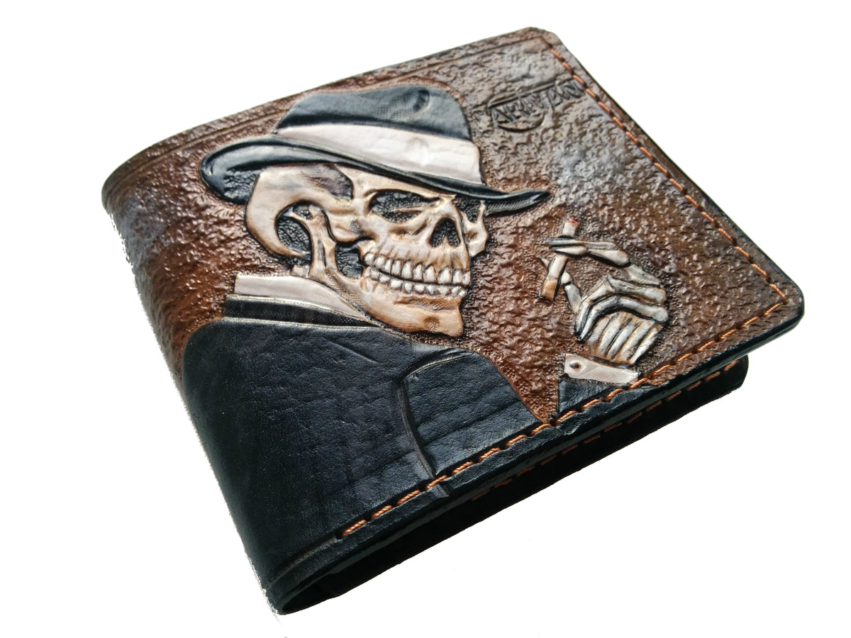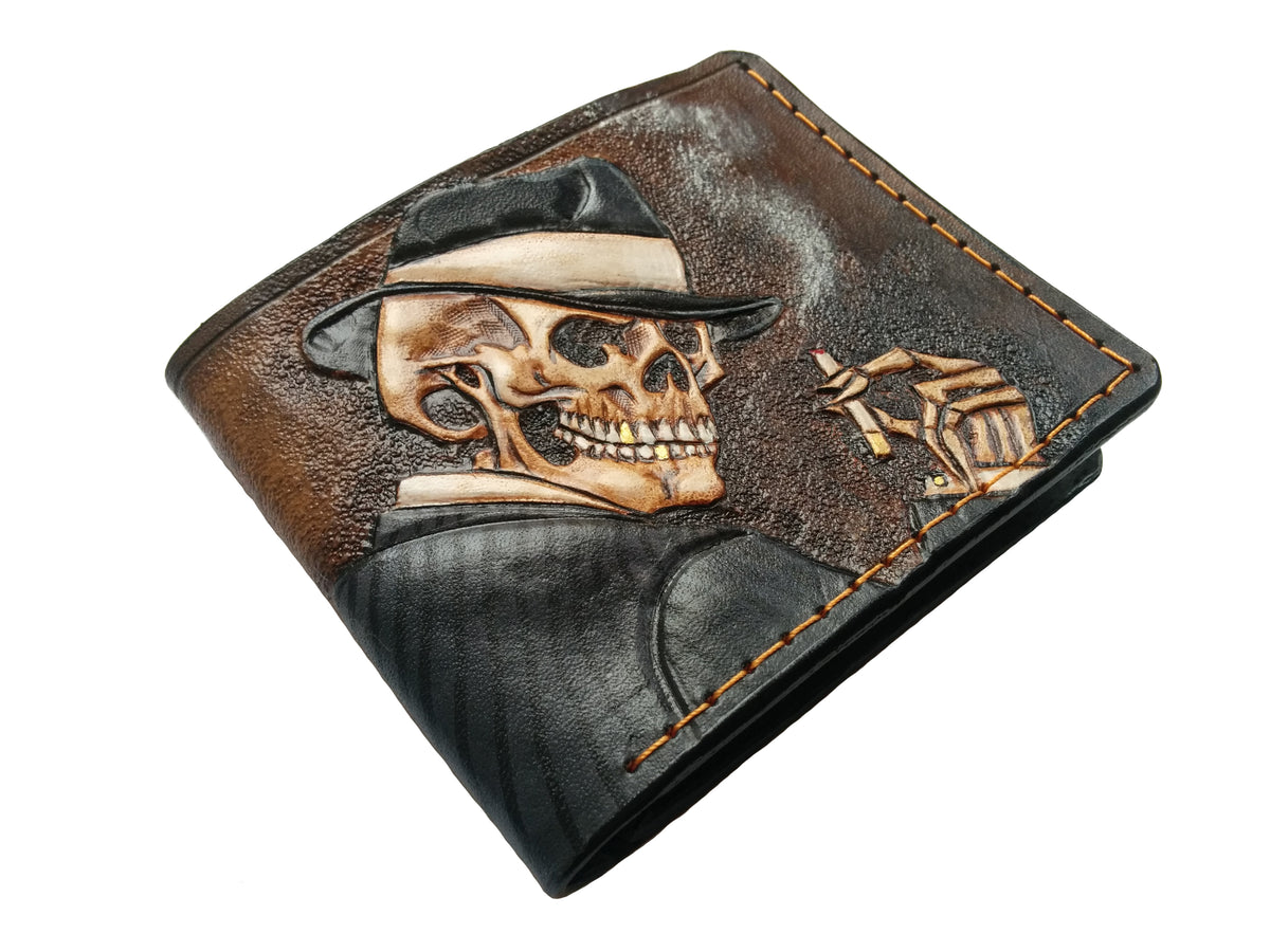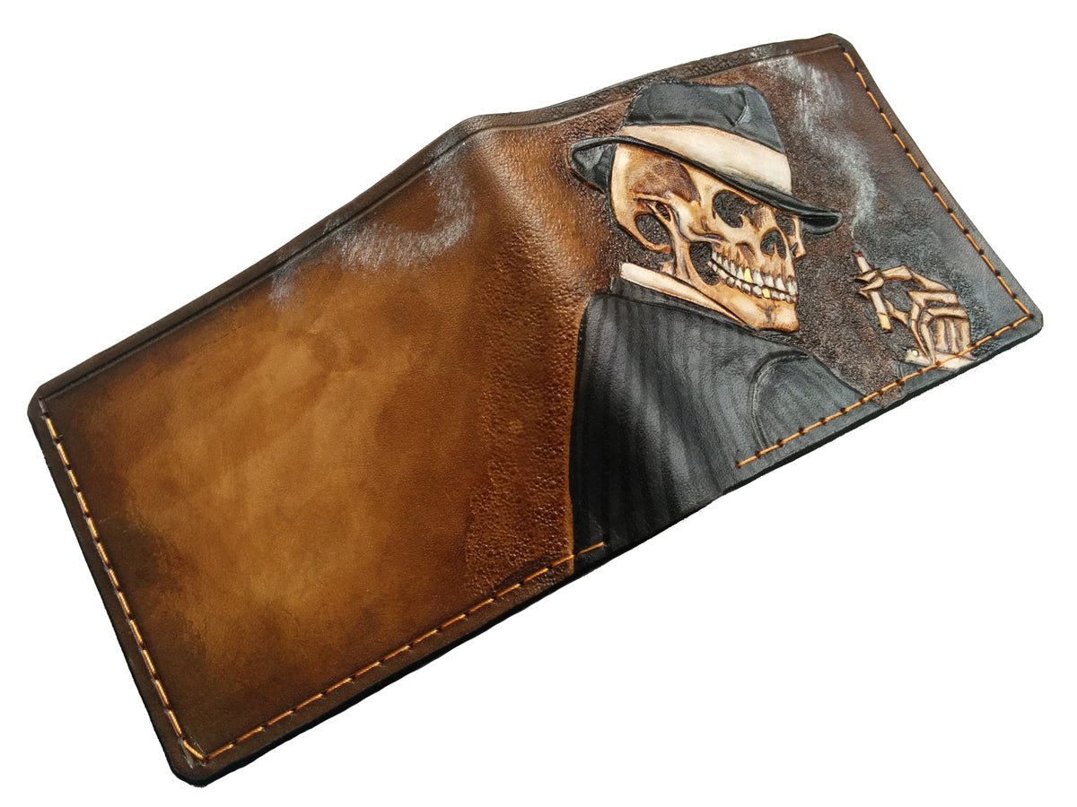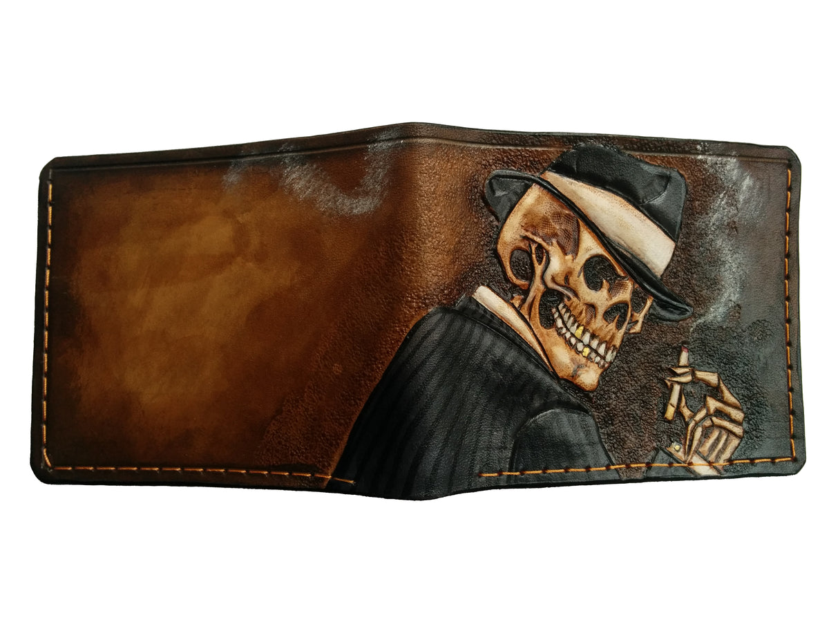 Step into the underworld with this handmade leather wallet, featuring an embossed mafia gangster skull with a fedora and smoking cigar, alongside a detailed mobster skeleton design. Inspired by vintage crime lords and classic noir style, this bifold wallet delivers attitude and authenticity. Crafted from genuine leather, it’s the perfect gift for mafia fans, streetwear lovers, and anyone drawn to bold, outlaw aesthetics.