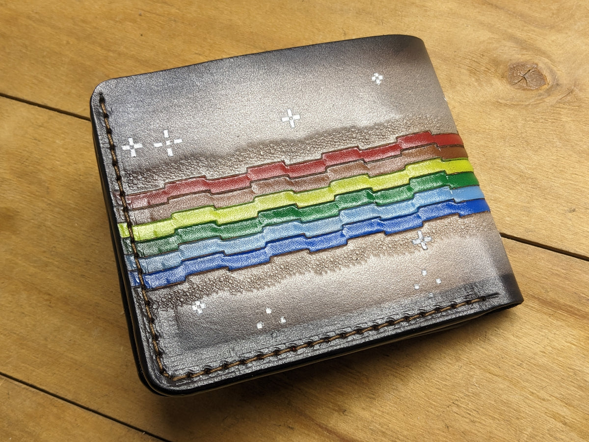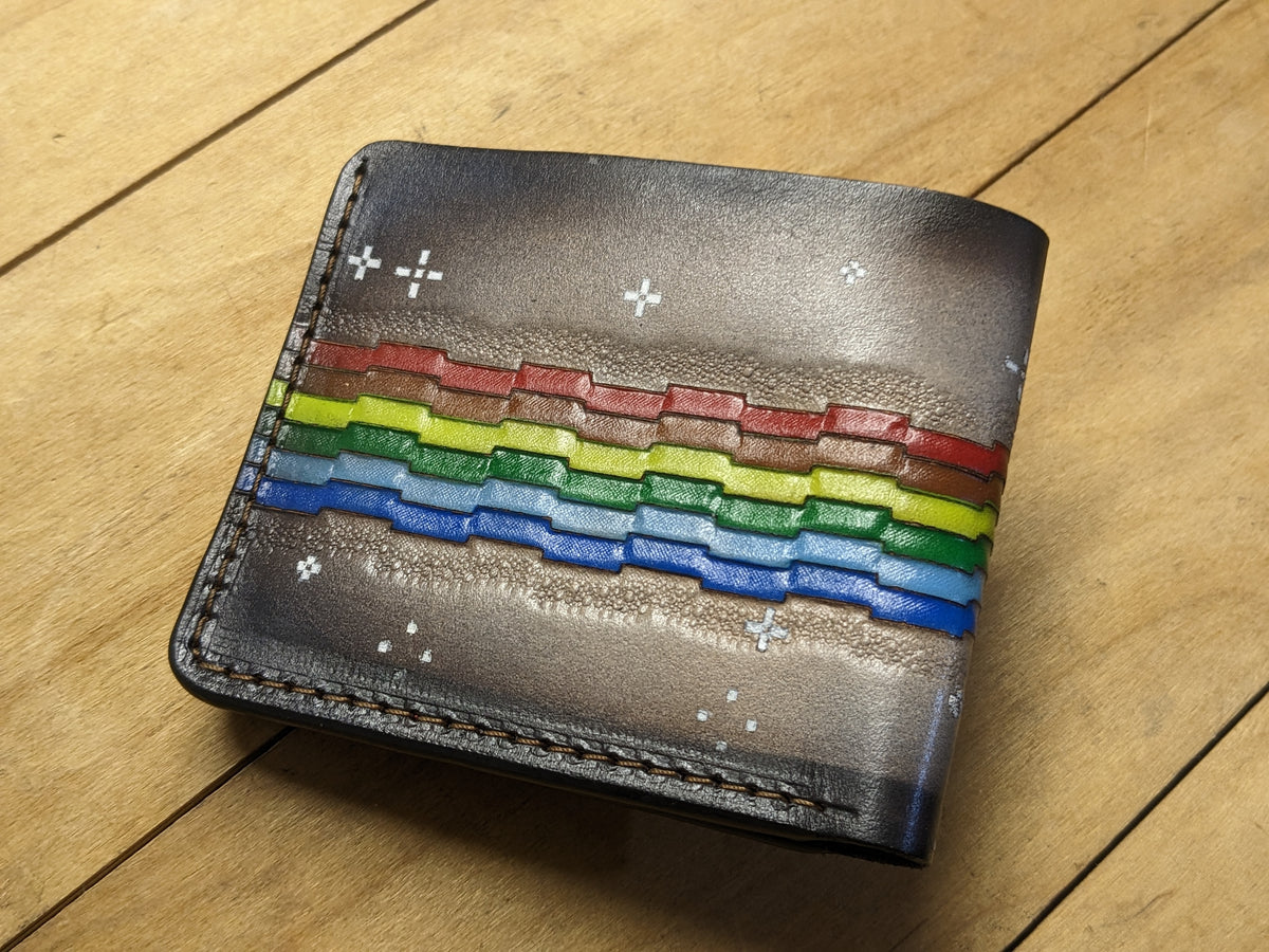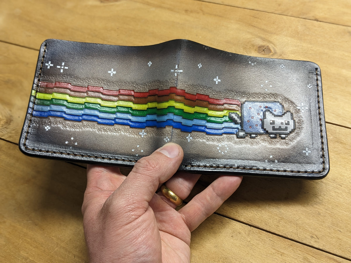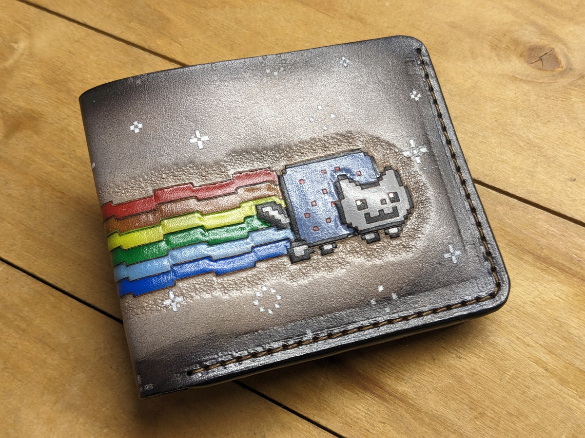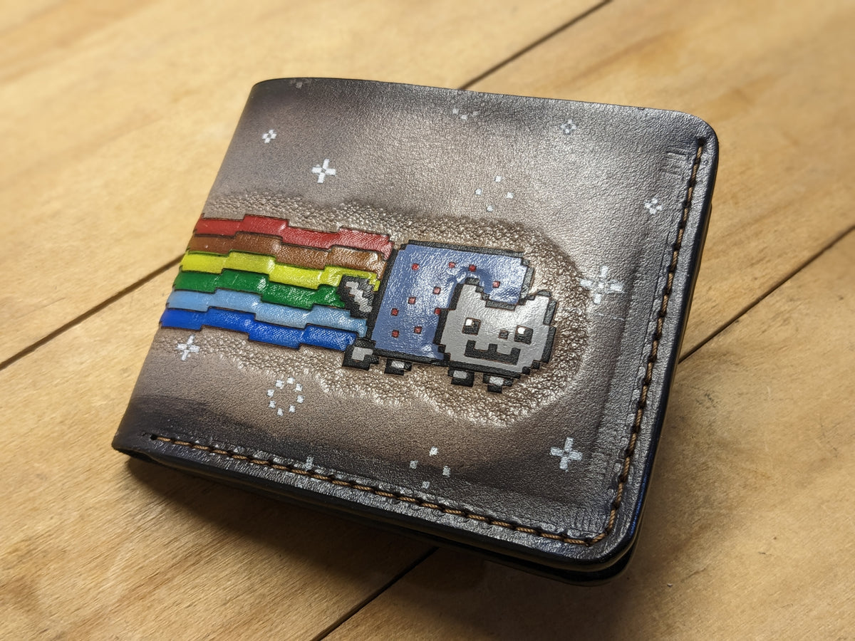 Handmade leather wallet featuring a custom-embossed Rainbow Nyan Cat NFT design — a nostalgic tribute to one of the most iconic internet memes. This personalized bifold transforms digital pop culture into real-world style, crafted from genuine leather with vibrant detail and meme-worthy flair. Perfect for NFT collectors, meme lovers, and fans of internet history, this wallet makes a playful yet premium gift that bridges art, humor, and personalization.