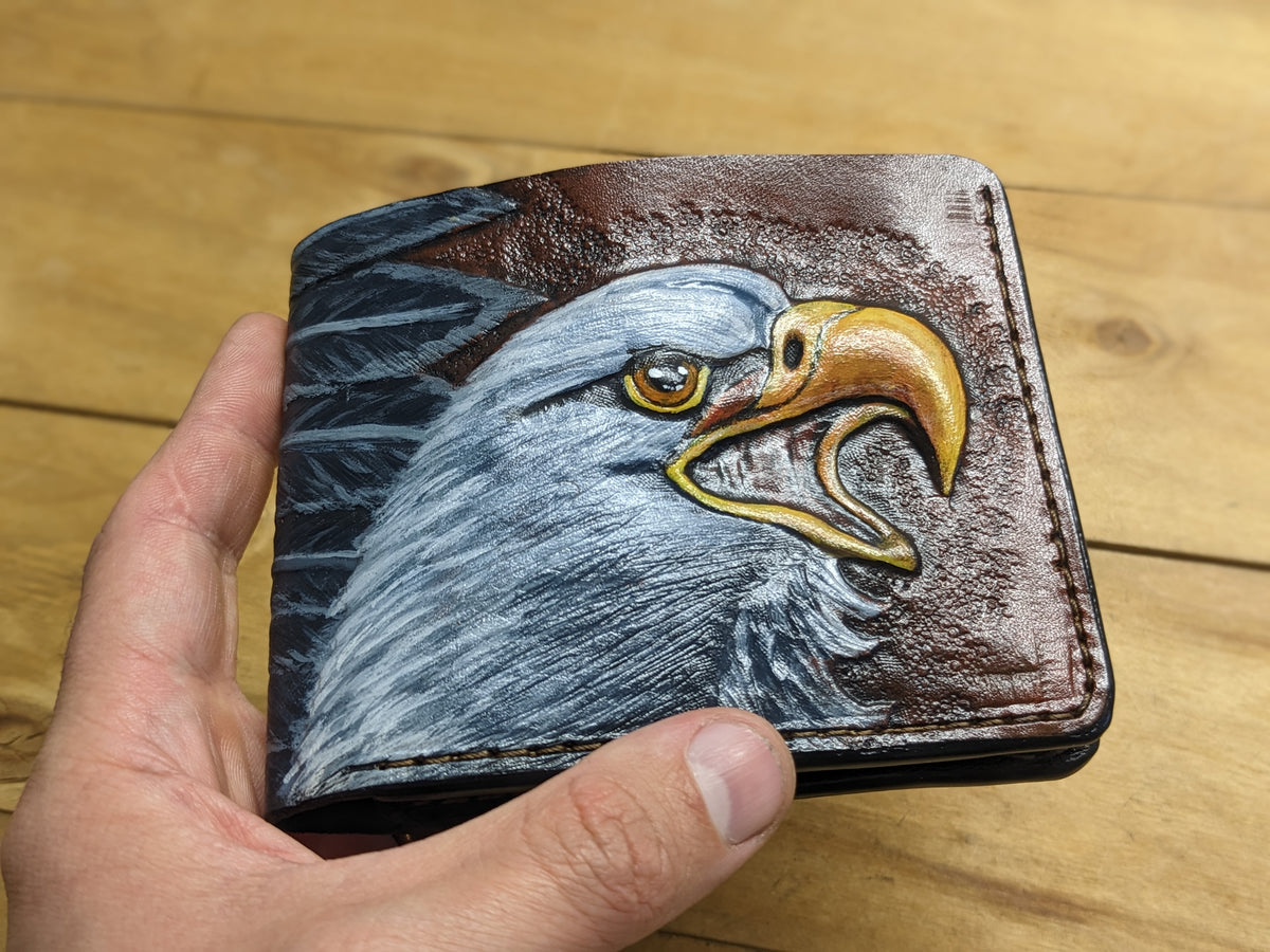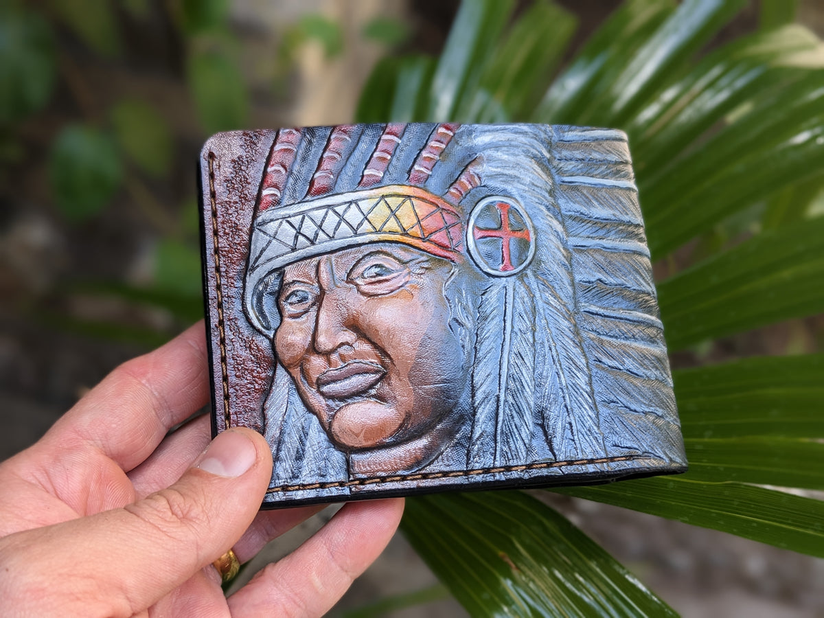 Our exquisite handmade Genuine leather wallet, crafted from high-quality Full Grain Vegetable Tanned Leather. This unique wallet features stunning hand-tooled and hand-painted designs, making it a true work of art.