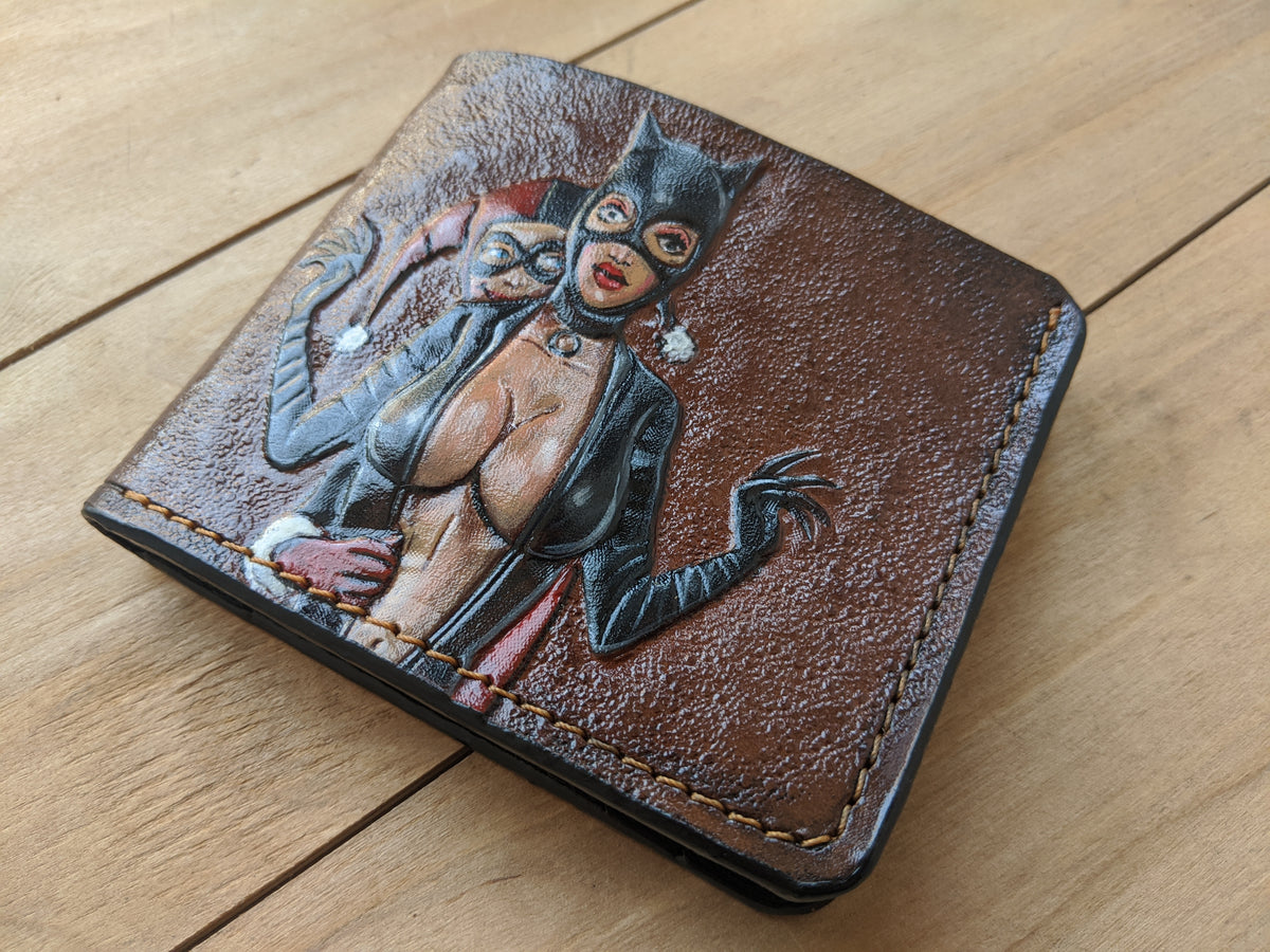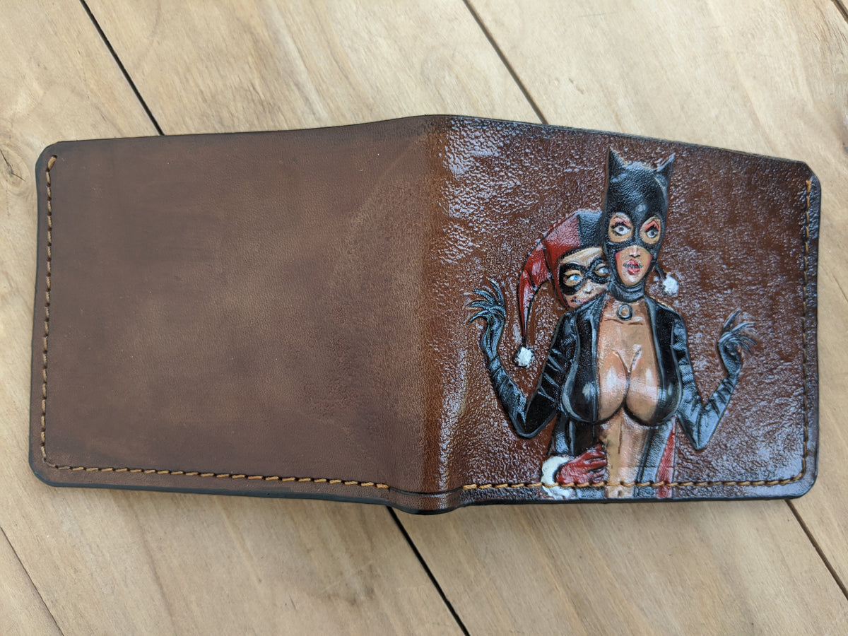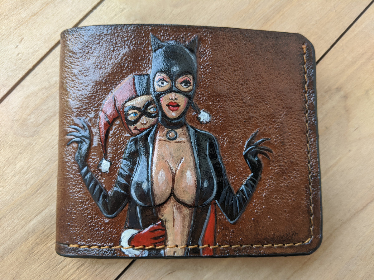Handmade leather wallet featuring embossed artwork of Harley Quinn, Catwoman, Joker, and Batman — iconic characters from the DC Comics universe. This stylish bifold captures the clash of chaos and justice with bold comic-style detailing, making it a perfect collectible for fans of Gotham’s heroes and villains. Crafted from genuine leather, it’s an ideal gift for DC lovers, comic collectors, or anyone who appreciates dark, dynamic character design.