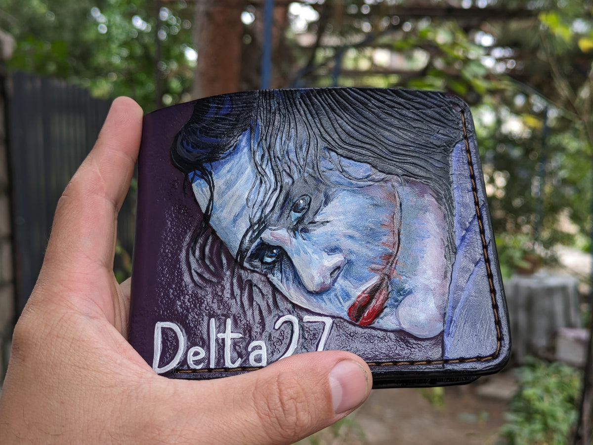 Handmade leather wallet featuring an embossed portrait of Heath Ledger’s Joker from The Dark Knight. This striking bifold captures the intense expression and chaotic energy of one of cinema’s most iconic villains. Crafted from genuine leather with meticulous detail, it’s a must-have for DC Comics fans, Joker enthusiasts, and collectors of legendary film characters. A bold and unforgettable gift that reflects darkness, brilliance, and cinematic legacy.
