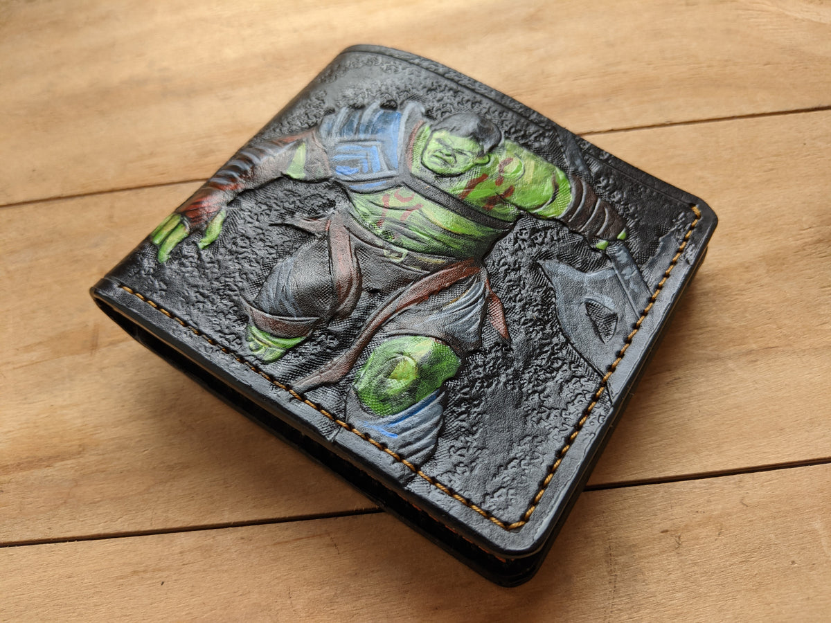 Handmade leather wallet featuring an embossed design of the Incredible Hulk, showcasing Bruce Banner’s powerful transformation into the iconic green superhero. Crafted from genuine leather, this bold bifold channels Marvel strength and comic book energy into a practical everyday accessory. Perfect for superhero fans, Marvel collectors, and those who admire the unstoppable rage and resilience of the Hulk. A smashing gift for any fan of the Avengers or Marvel universe.