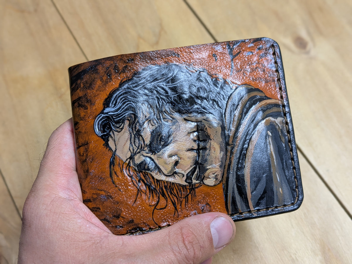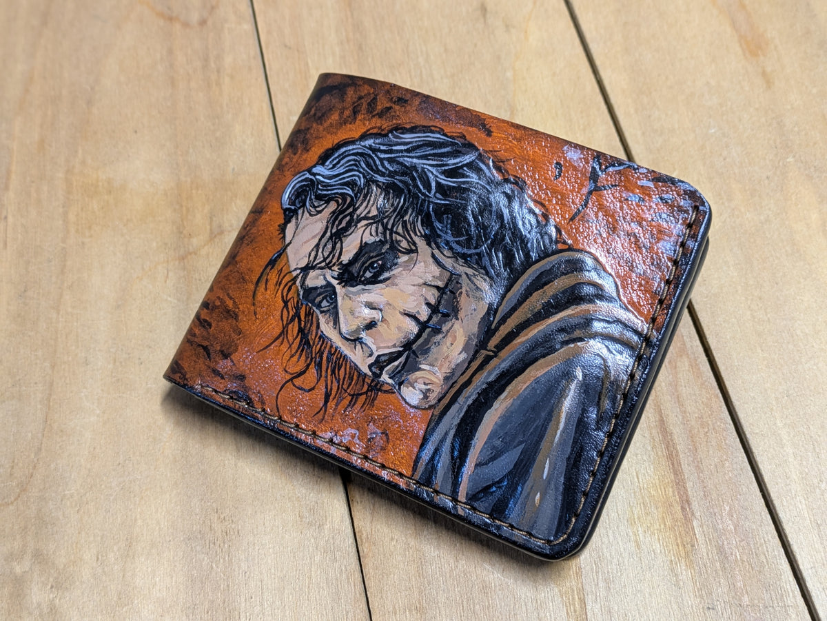 Handmade leather wallet featuring an embossed design of The Joker and the iconic Bat Signal, inspired by The Dark Knight universe. This detailed bifold captures the eternal clash between chaos and justice in Gotham City. Crafted from genuine leather with high-contrast embossing, it’s a bold accessory for fans of Batman, DC Comics, and gritty hero-villain symbolism. A striking gift for collectors and fans of the Joker-Batman rivalry.