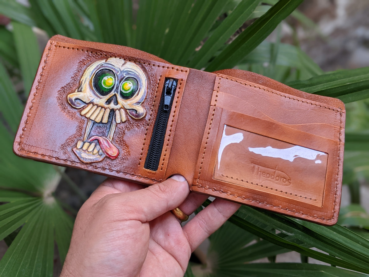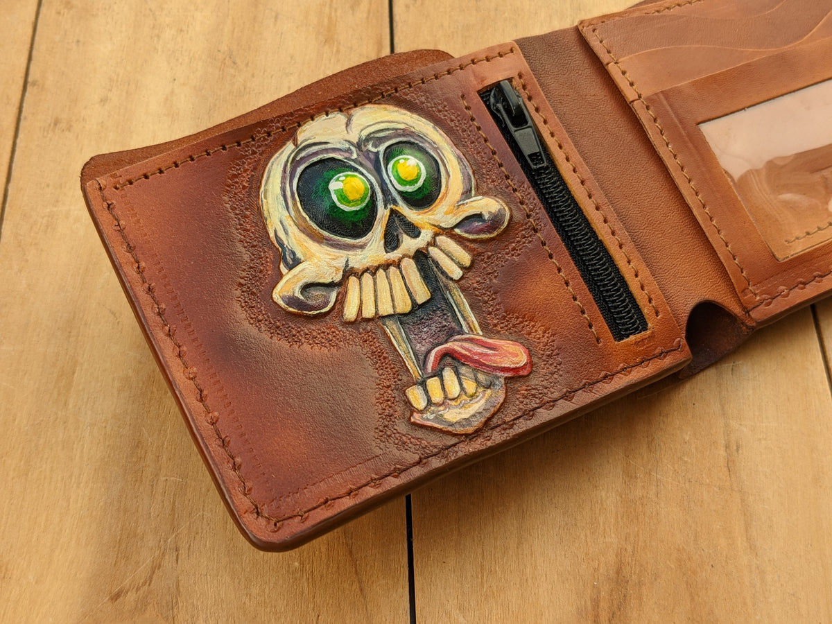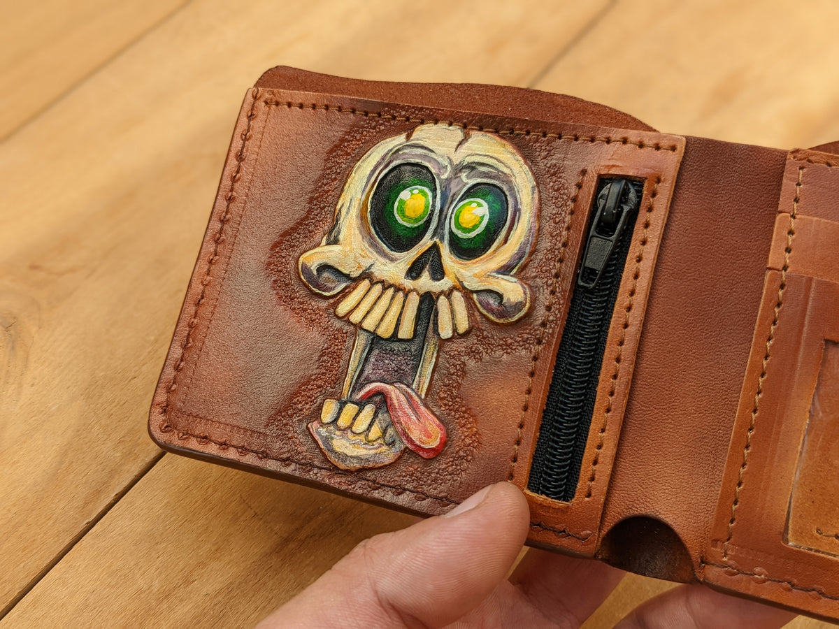 Handmade leather wallet featuring an embossed crazy and funny skull & skeleton design with a playful twist. This genuine leather bifold adds a touch of dark humor and quirky charm to your everyday carry. Whether you're a fan of skeleton art, love edgy accessories, or just enjoy standing out with a bold sense of humor, this wallet makes the perfect gift. Ideal for collectors, gothic style fans, or anyone with a wild side.