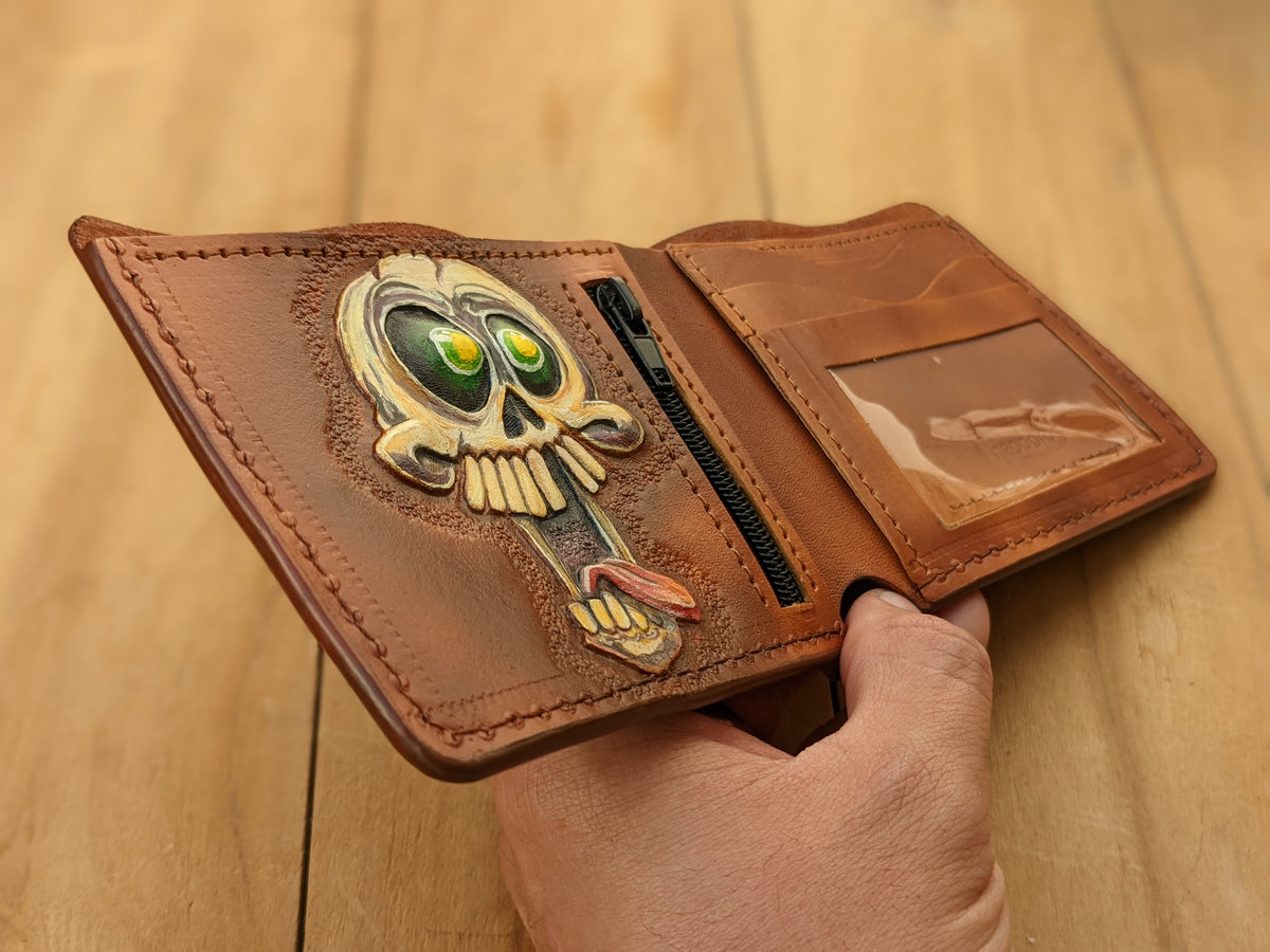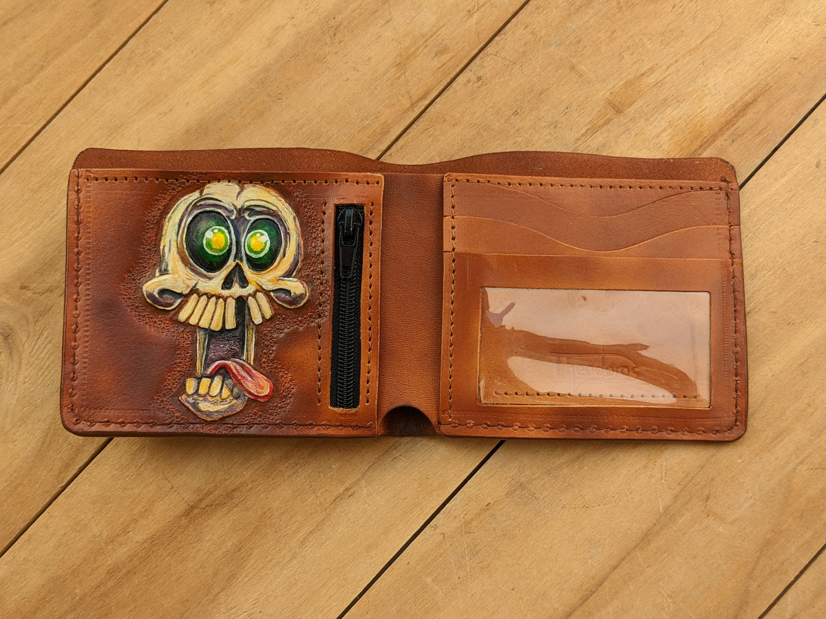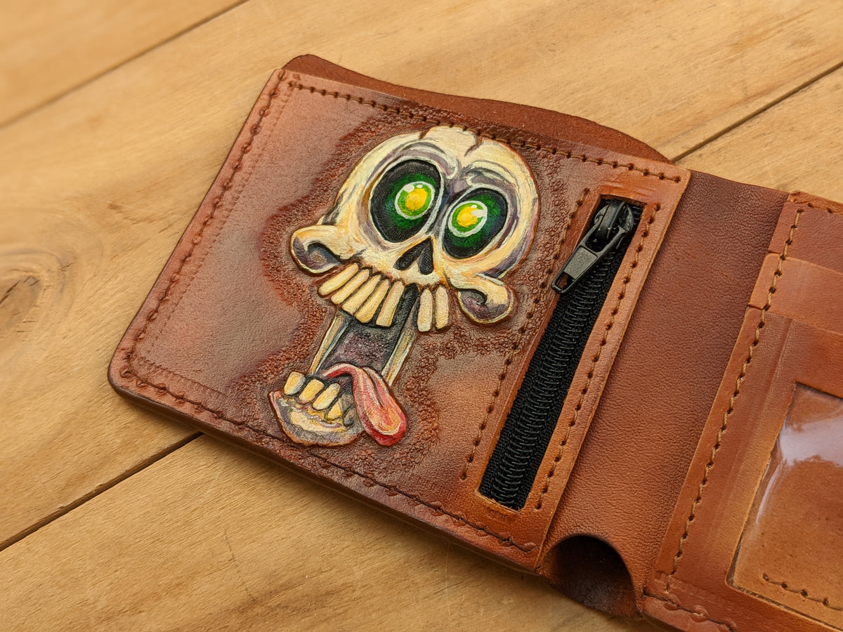Handmade leather wallet featuring an embossed crazy and funny skull & skeleton design with a playful twist. This genuine leather bifold adds a touch of dark humor and quirky charm to your everyday carry. Whether you're a fan of skeleton art, love edgy accessories, or just enjoy standing out with a bold sense of humor, this wallet makes the perfect gift. Ideal for collectors, gothic style fans, or anyone with a wild side.