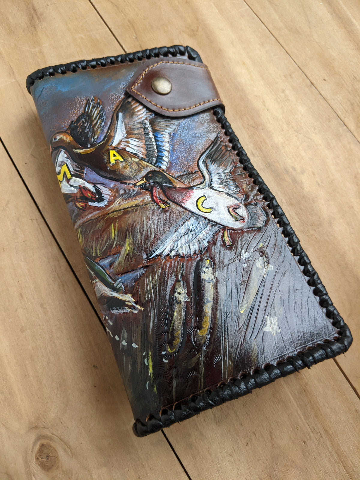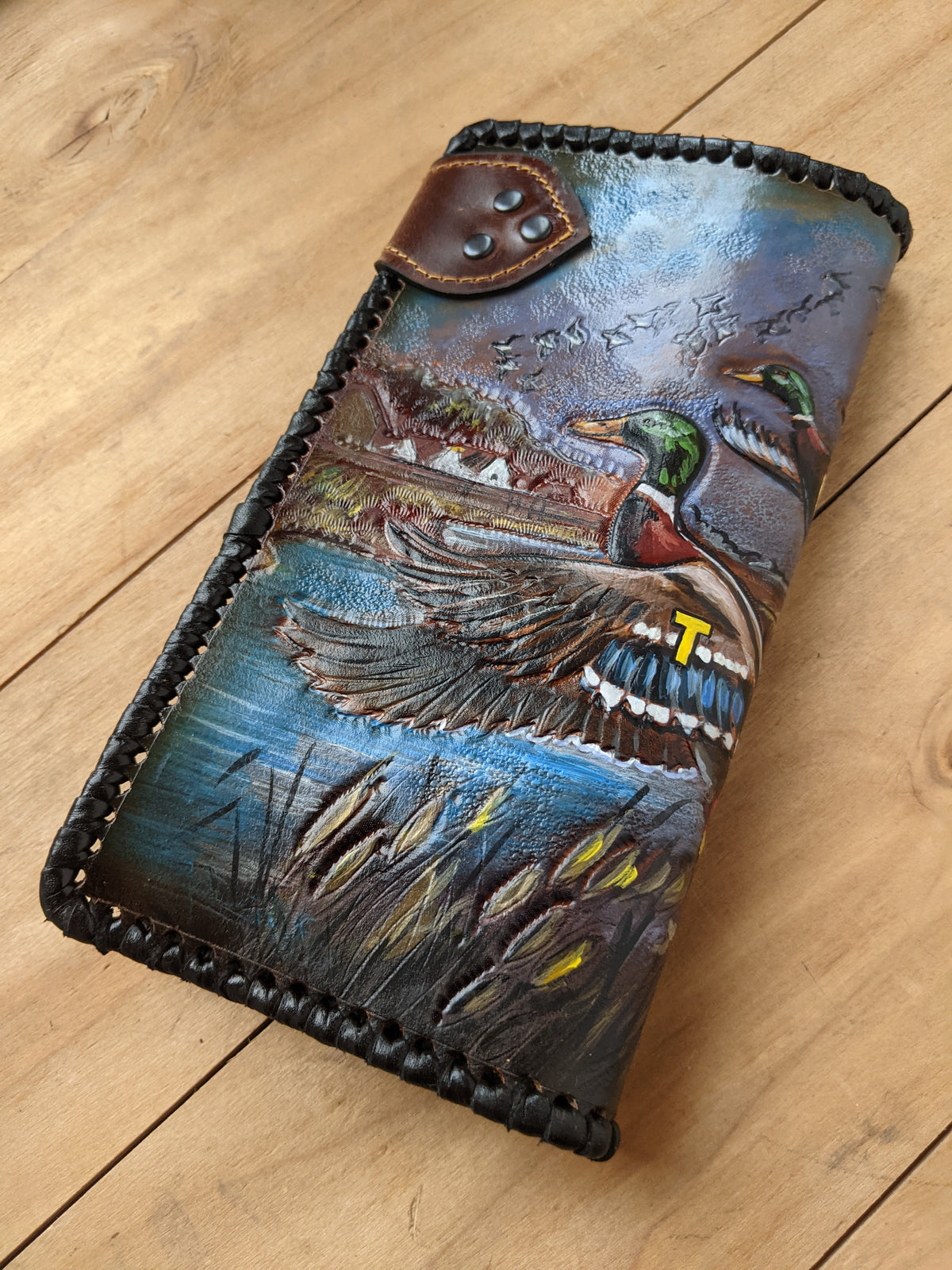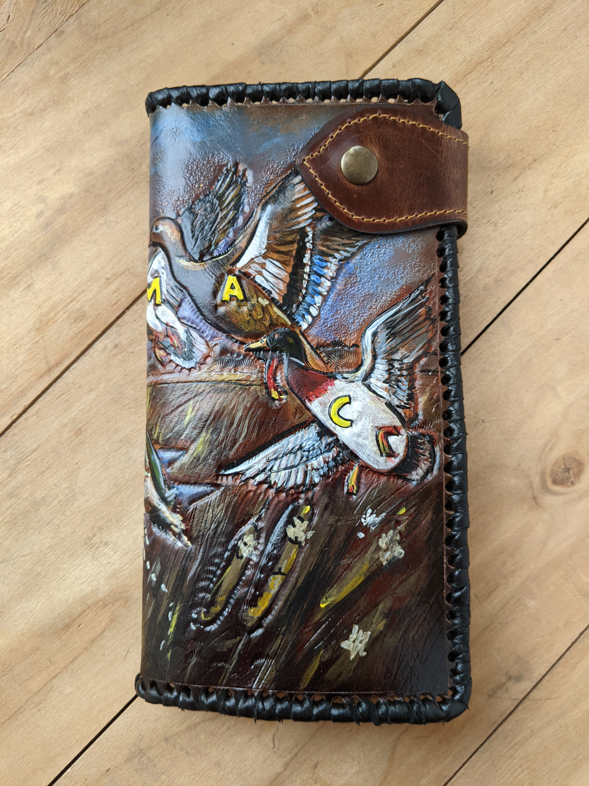 Handmade biker-style leather wallet featuring embossed designs of mallards, wild ducks, and geese in intricate detail. Crafted from genuine leather, this rugged long wallet blends nature-inspired artistry with durable craftsmanship—perfect for outdoor enthusiasts, hunters, and fans of waterfowl. Its spacious design suits bikers and travelers who appreciate both functionality and bold wildlife motifs. A distinctive gift for lovers of wild birds and countryside adventures.