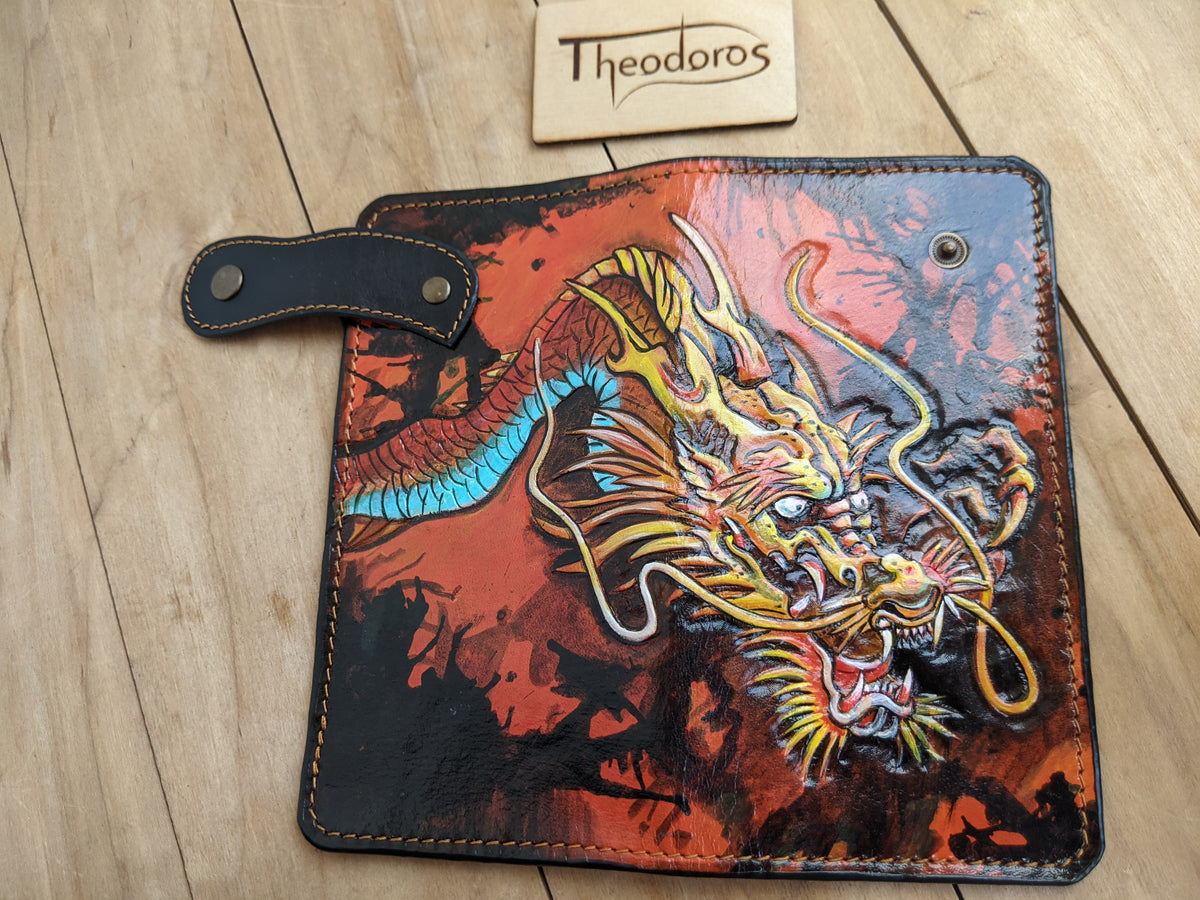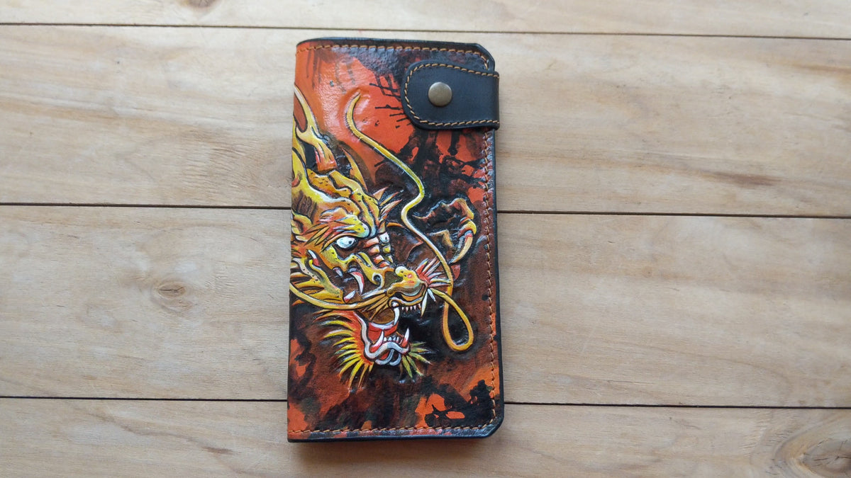 Handmade biker-style long leather wallet featuring an embossed image of the Chinese Dragon King (Loong)—a revered symbol of imperial power, protection, and prosperity. Crafted from genuine leather, this travel clutch wallet blends traditional Eastern artistry with rugged, functional design. Ideal for bikers, travelers, or anyone drawn to mythical symbolism and bold statement pieces, it makes a powerful gift for fans of Chinese culture and dragon mythology.
