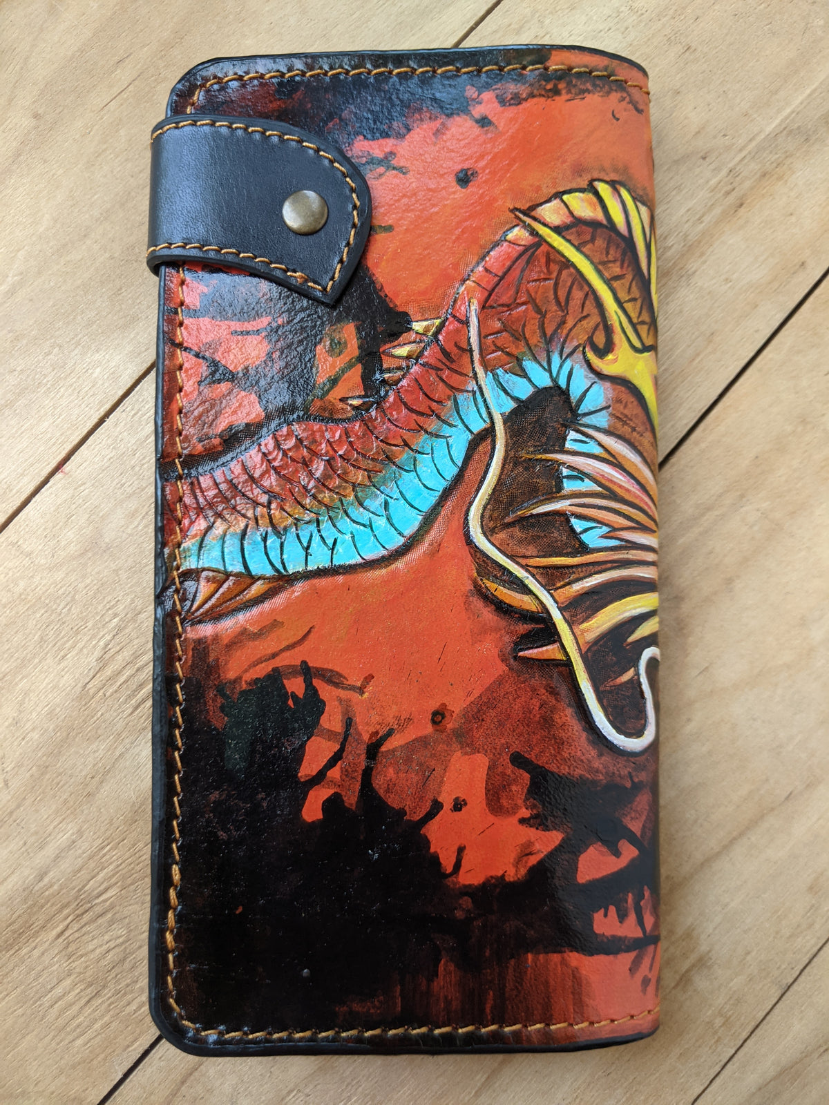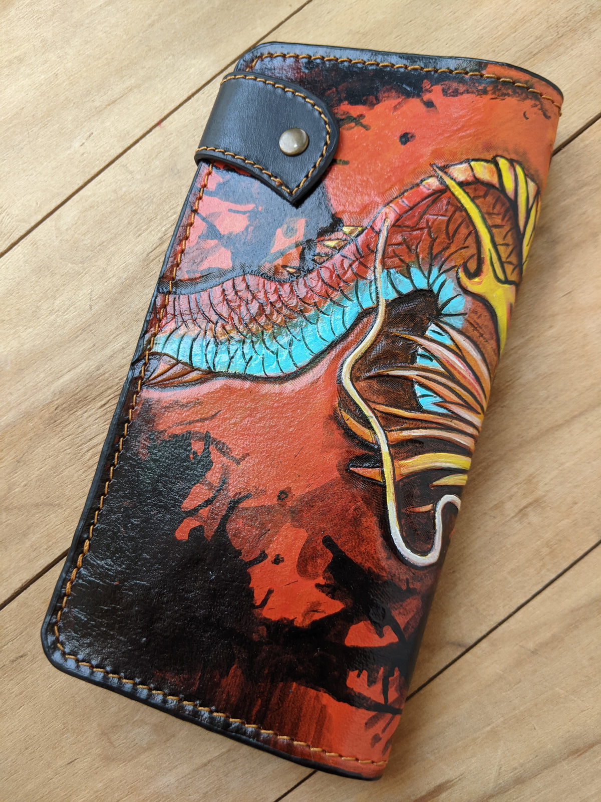 Introducing our exquisite handmade leather wallet, crafted from high-quality vegetable-tanned leather. This unique wallet features stunning hand-tooled and hand-painted designs, making it a true work of art.