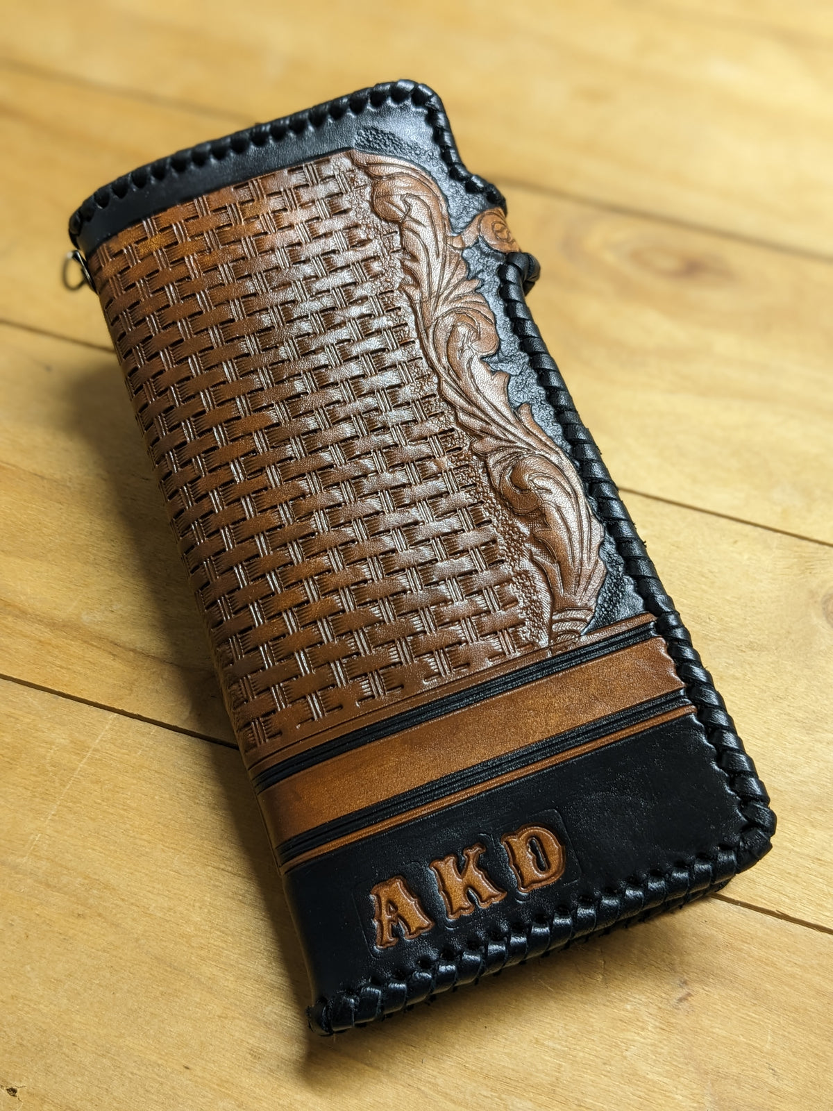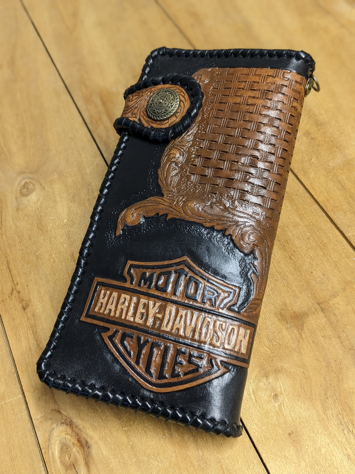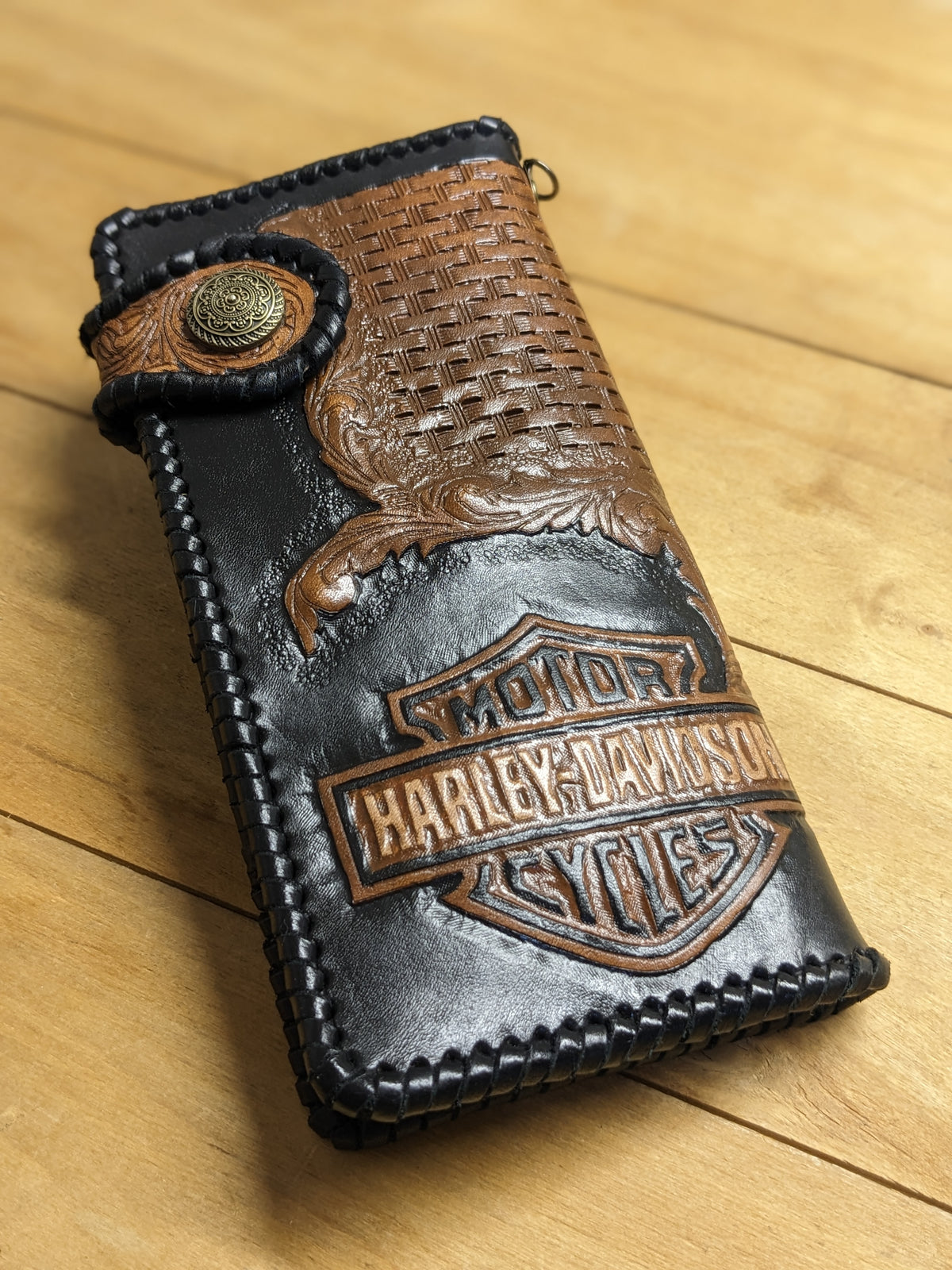 Handmade long leather biker wallet featuring an embossed Harley Davidson motorcycle combined with elegant Sheridan-style floral patterns. This unique travel clutch wallet blends the raw power of the open road with traditional Western leather tooling. Crafted from genuine leather with fine detailing, it’s perfect for riders who value craftsmanship, heritage, and bold biker identity. A standout gift for Harley fans, motorcycle collectors, and Western design enthusiasts.