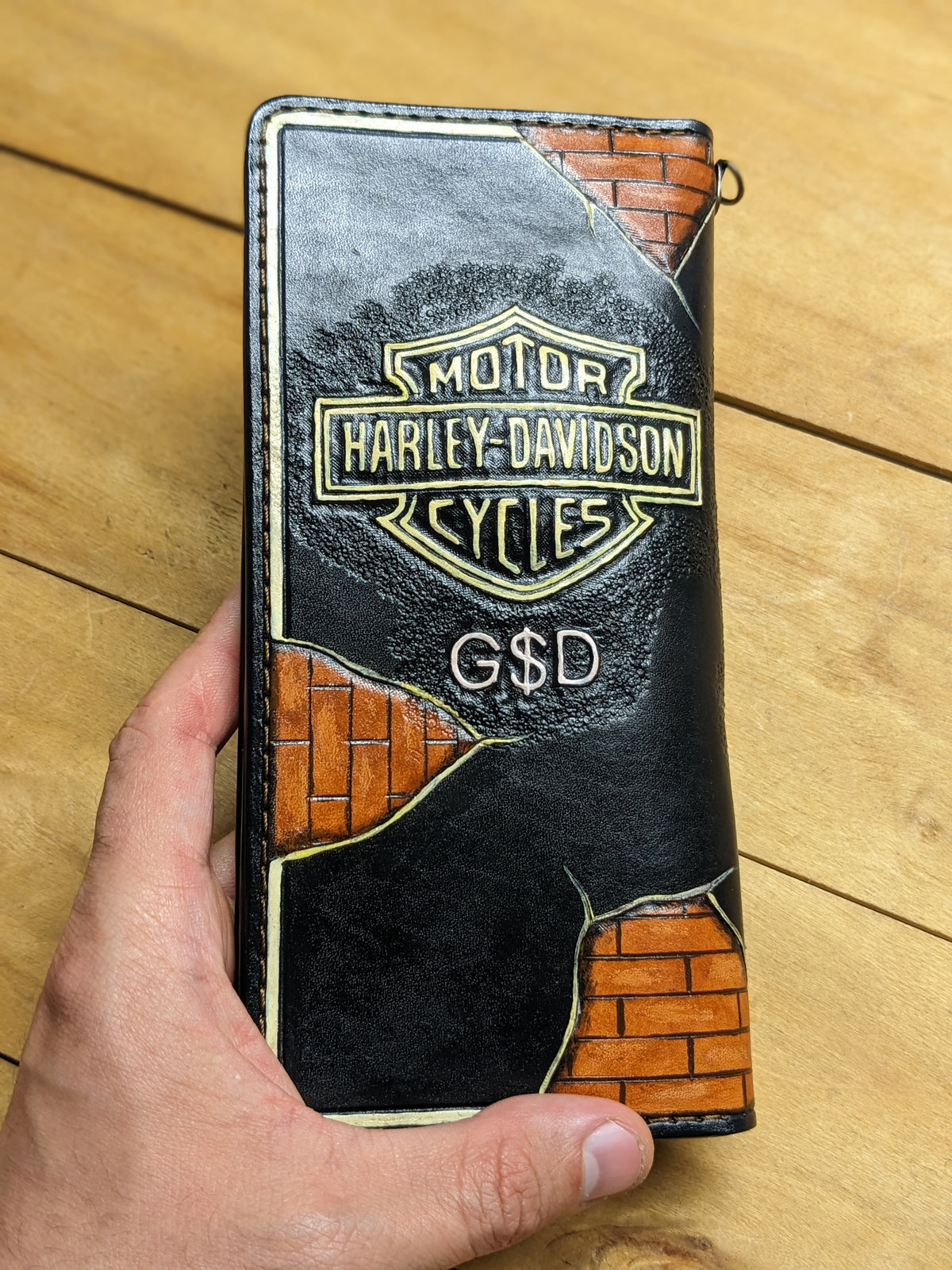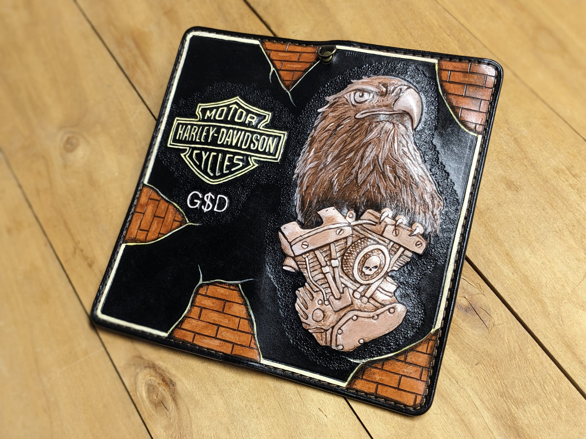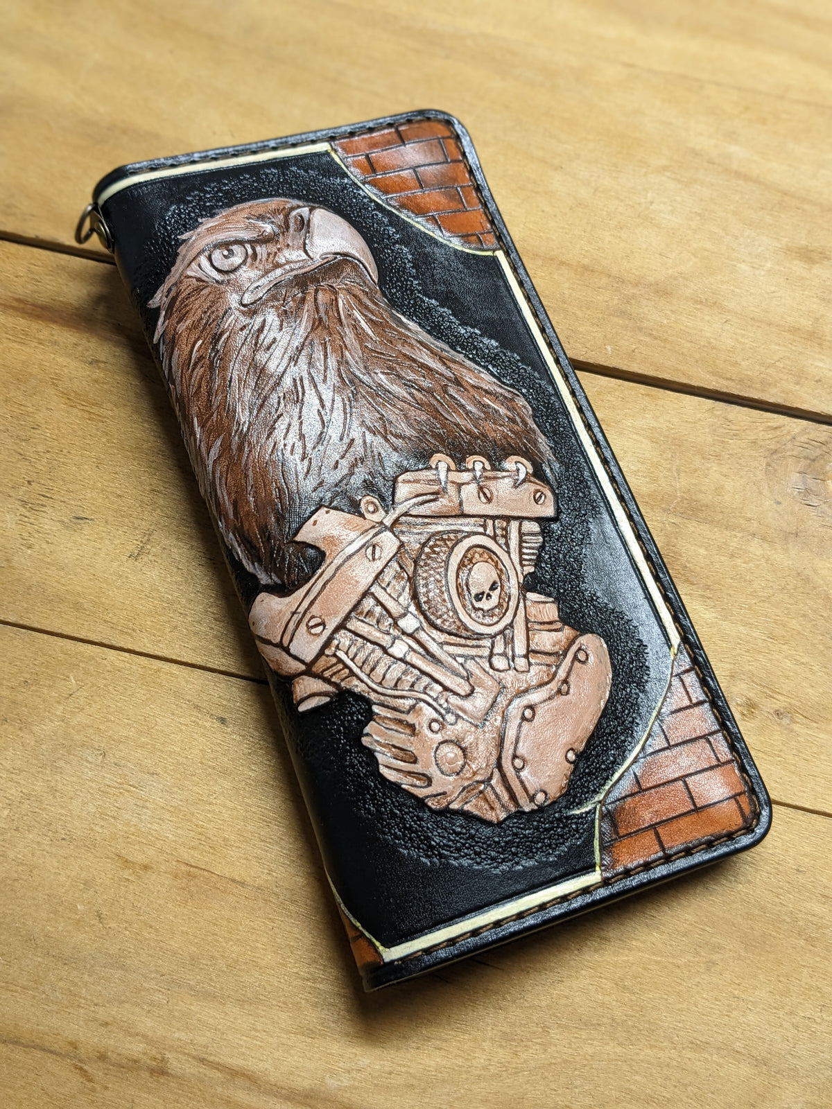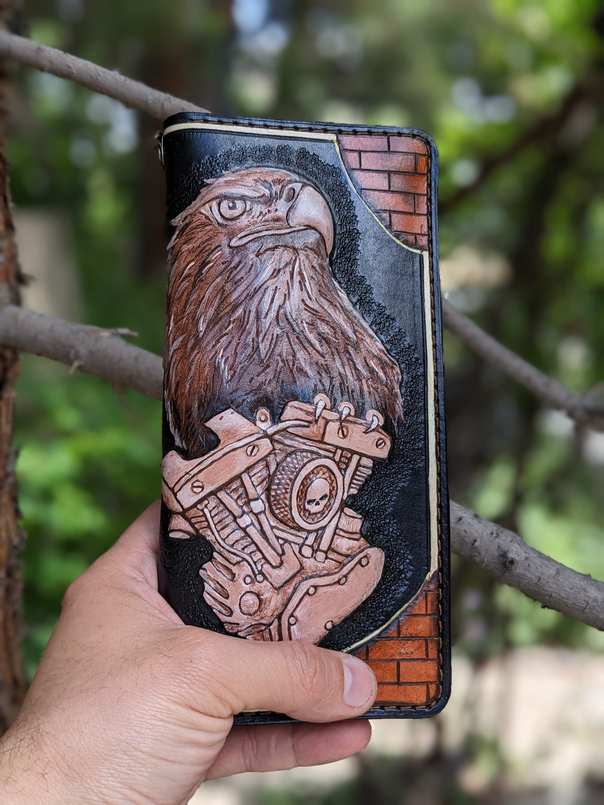 Handmade long leather biker wallet featuring an embossed Harley Davidson V-Twin engine and soaring bald eagle—two powerful American symbols of freedom and strength. Crafted from genuine leather, this travel clutch wallet combines mechanical muscle with patriotic spirit, making it the ultimate accessory for Harley riders and road warriors. A bold gift for bikers, veterans, and lovers of classic American motorcycle culture.