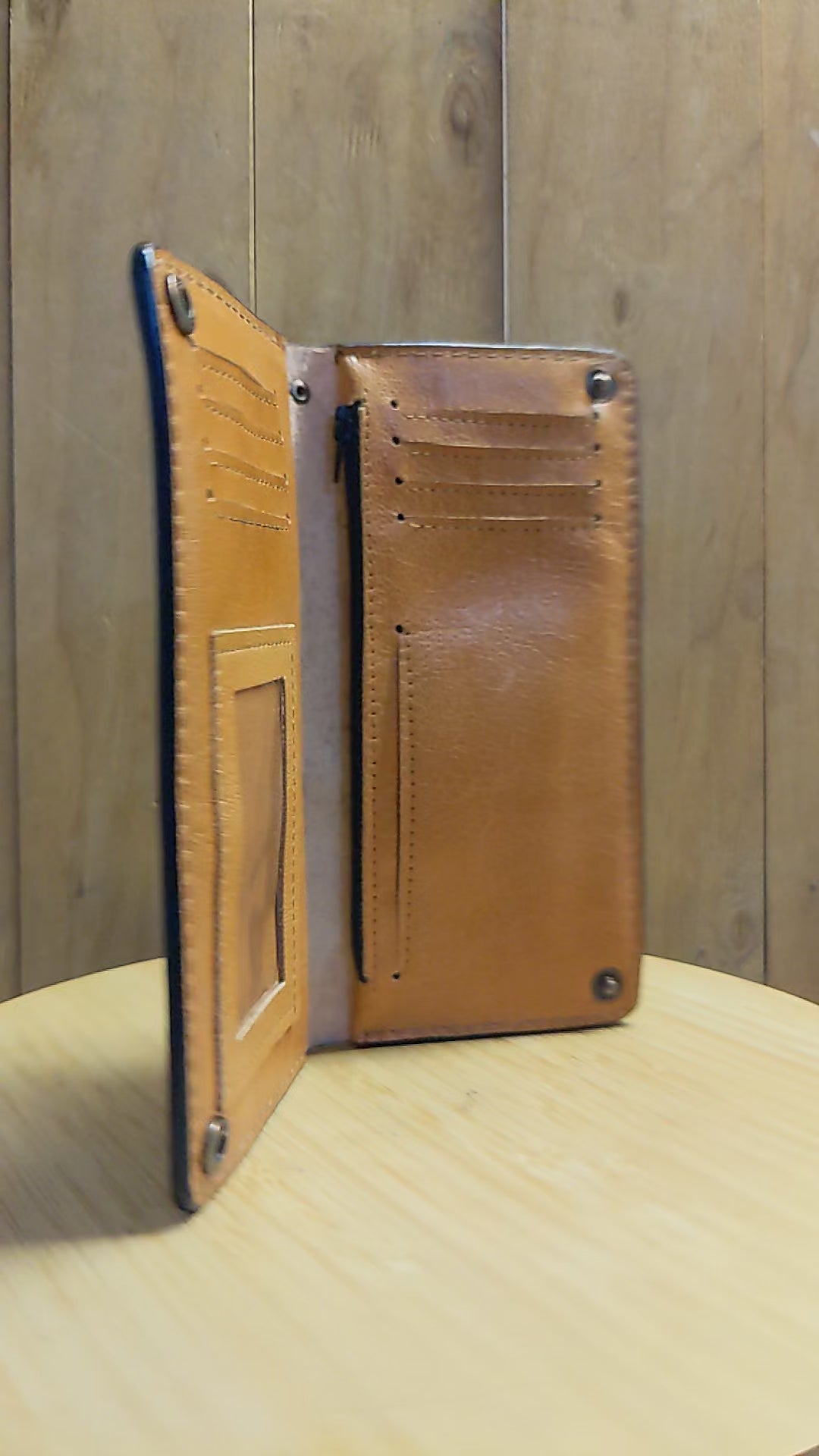 Introducing our exquisite handmade leather wallet, crafted from high-quality vegetable-tanned leather. This unique wallet features stunning hand-tooled and hand-painted designs, making it a true work of art.