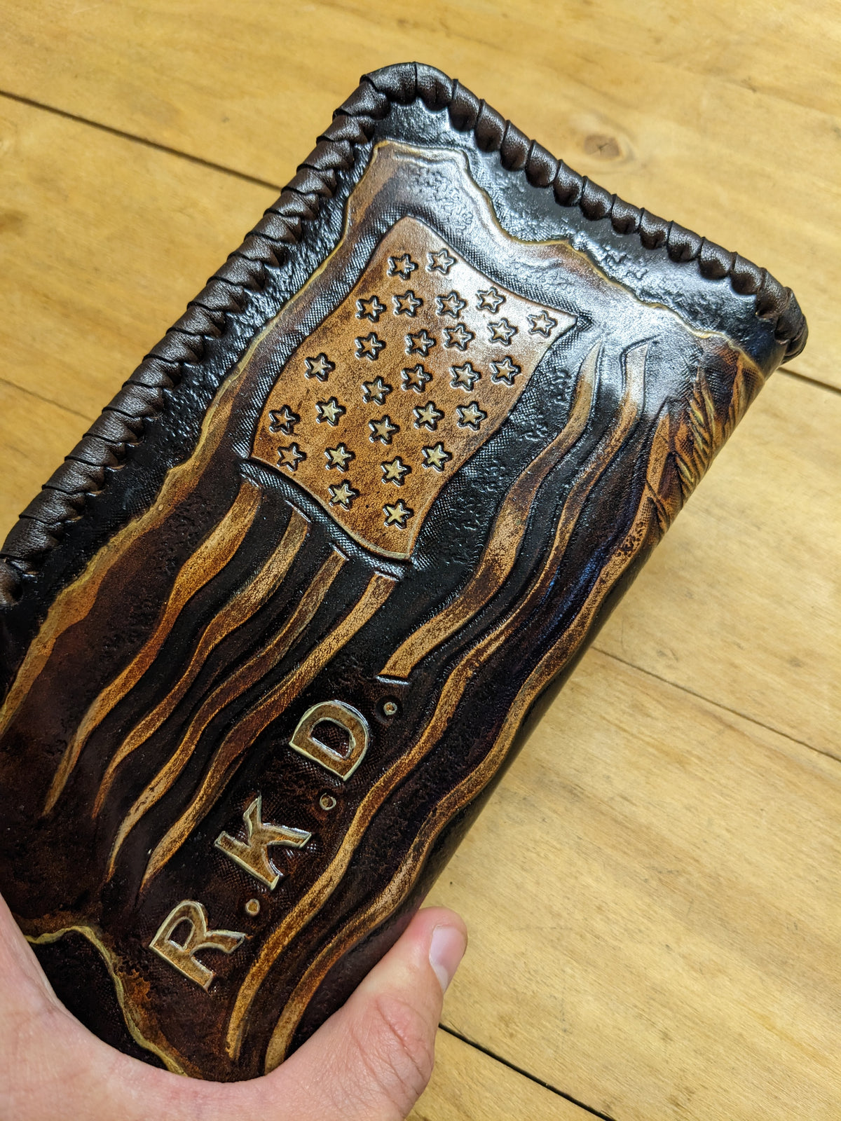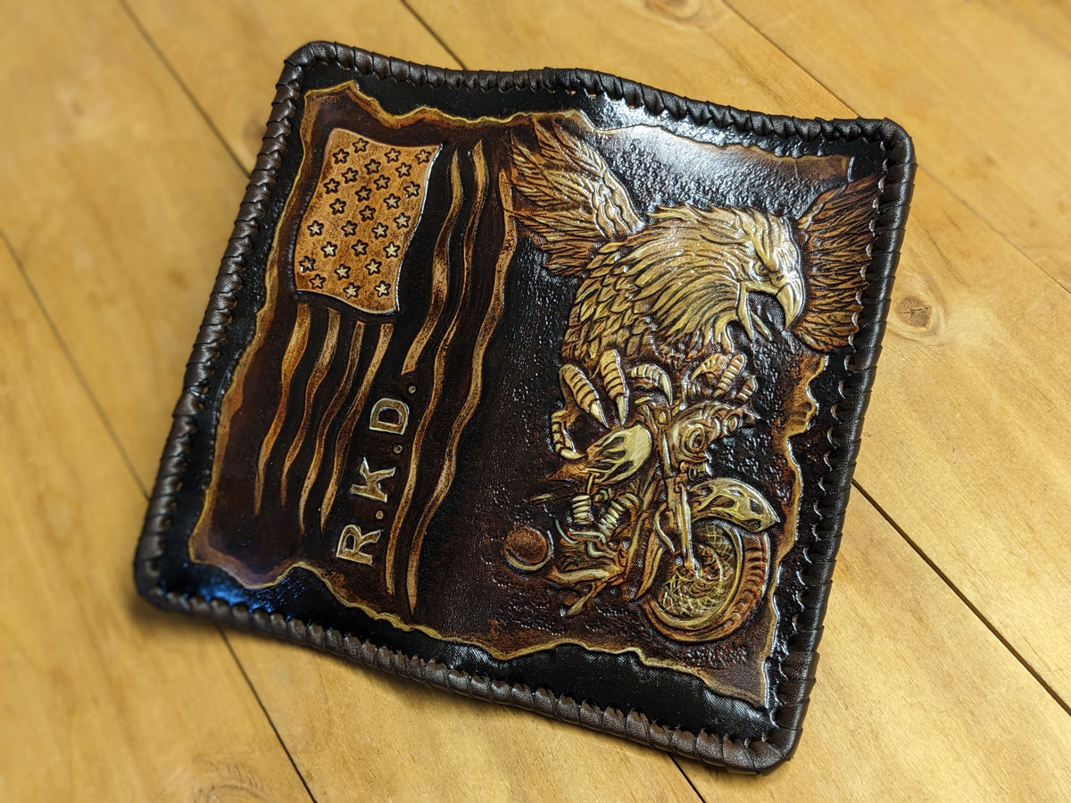 Handmade long leather biker wallet featuring an embossed design of the USA flag, a fierce bald eagle, and a classic Harley Davidson motorcycle. This patriotic travel clutch wallet celebrates freedom, power, and the open road with iconic American imagery. Crafted from genuine leather, it’s a bold statement piece for bikers, veterans, and motorcycle enthusiasts who ride with pride. A perfect gift for lovers of Harley culture and American heritage.