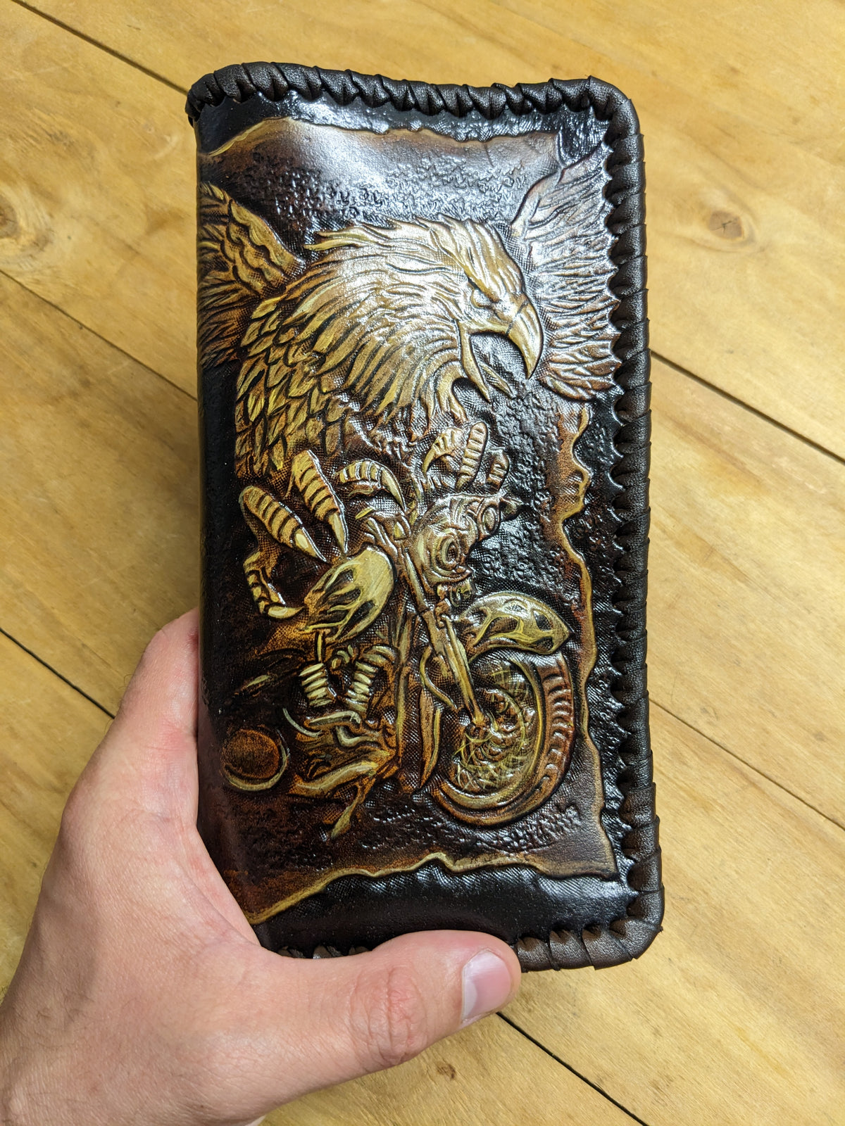 Introducing our exquisite handmade leather wallet, crafted from high-quality vegetable-tanned leather. This unique wallet features stunning hand-tooled and hand-painted designs, making it a true work of art.