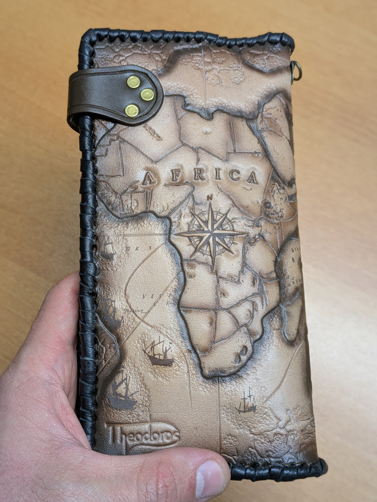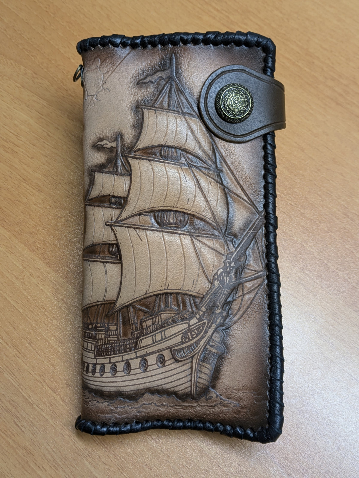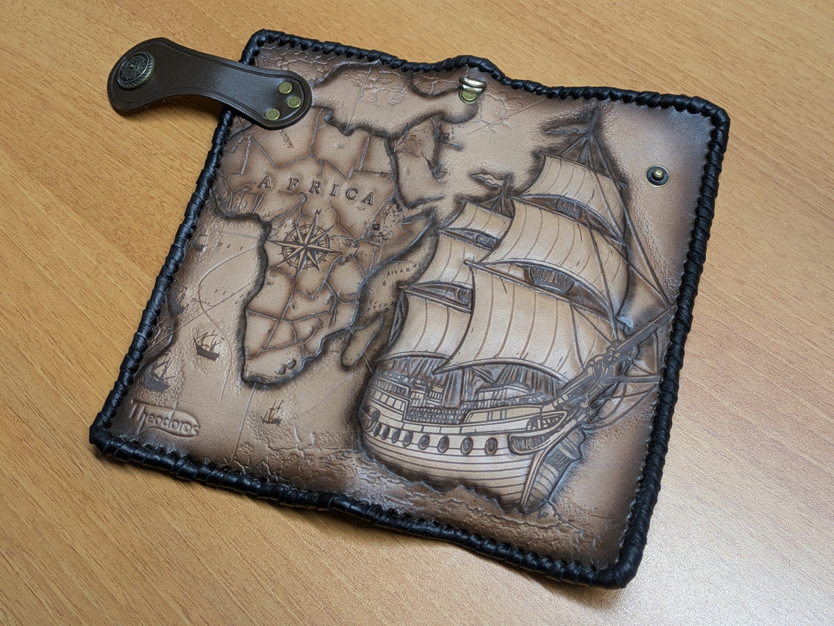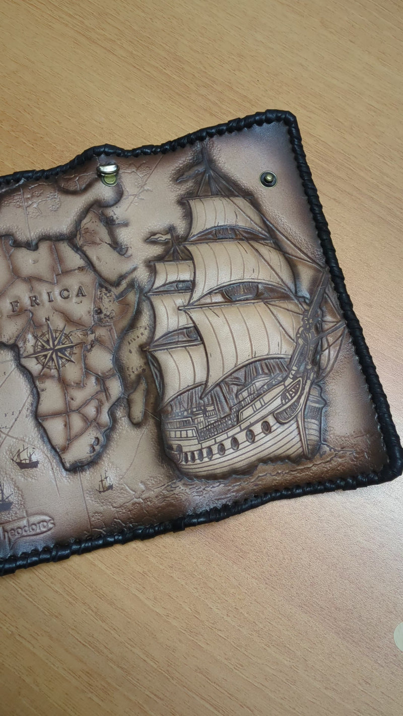 Handmade long leather travel wallet featuring an embossed design of a majestic frigate ship, vintage treasure map, and detailed compass rose. Inspired by age-old maritime adventures and pirate lore, this genuine leather clutch is perfect for explorers at heart. Whether you're a sailor, history lover, or seeker of hidden treasures, this wallet captures the spirit of the open sea and old-world navigation. A perfect gift for adventurers and nautical enthusiasts.