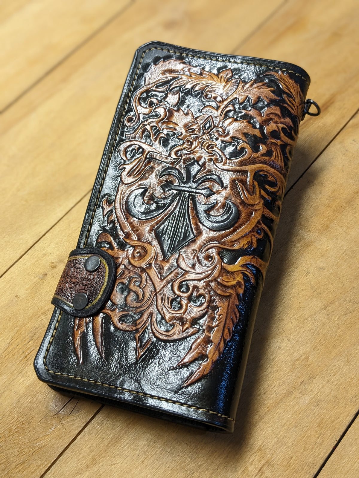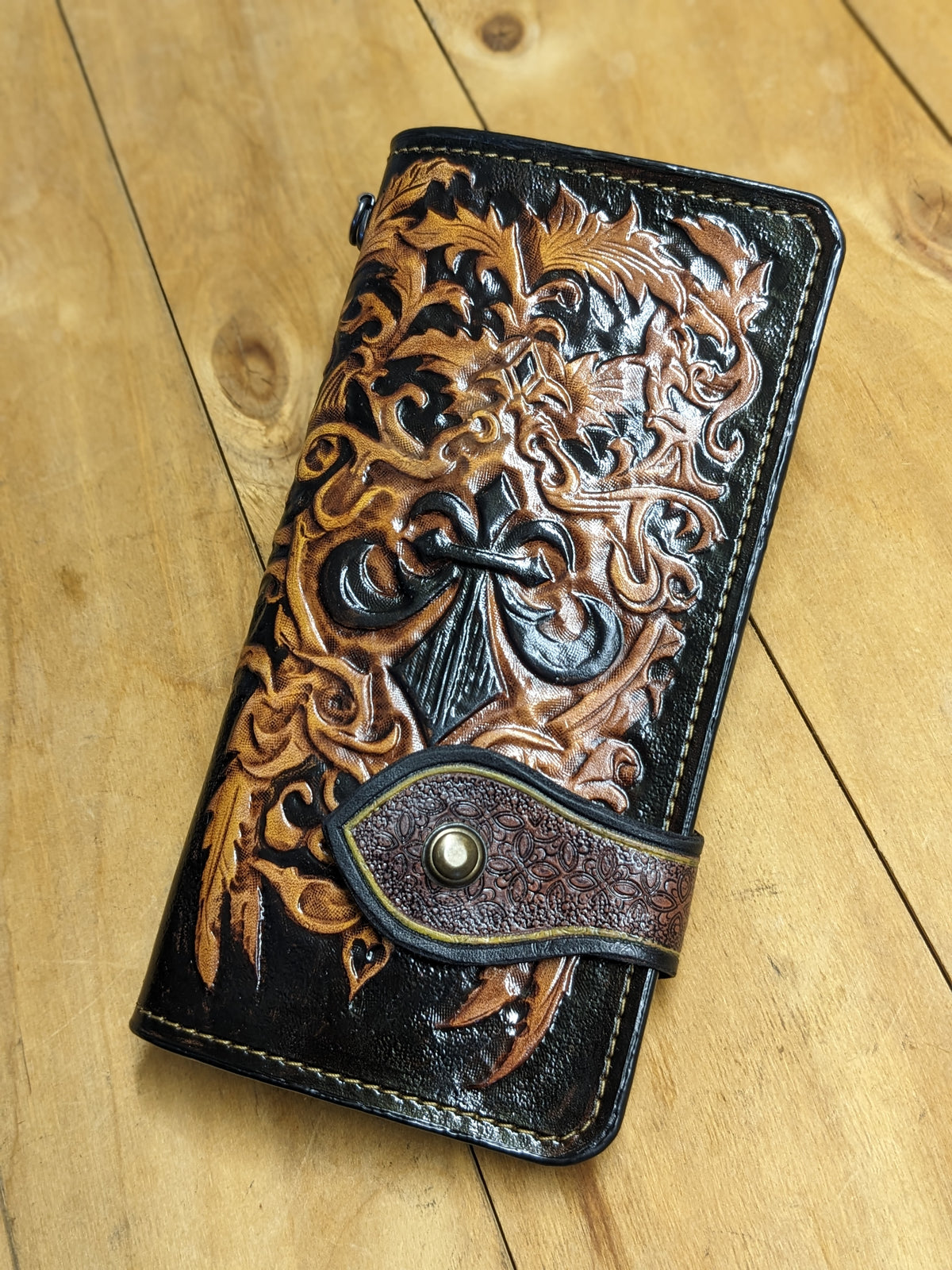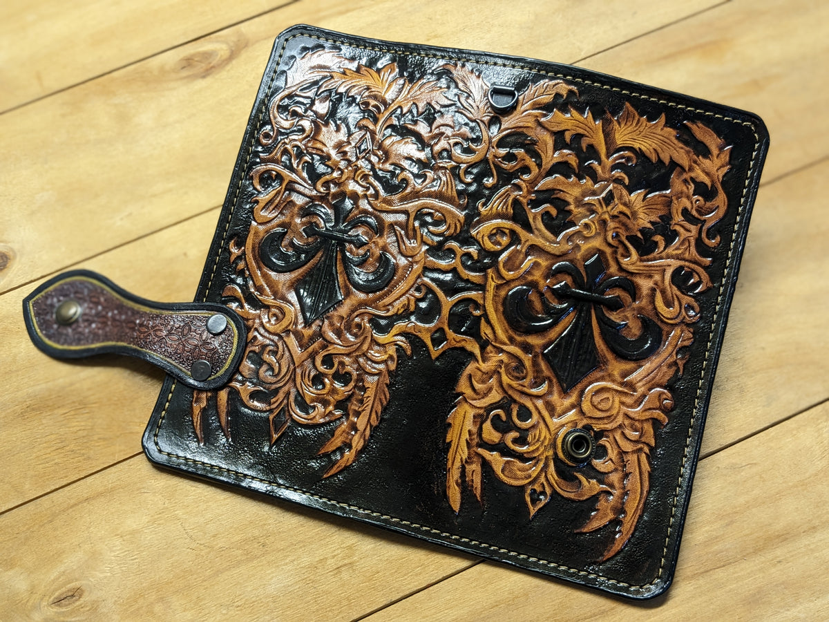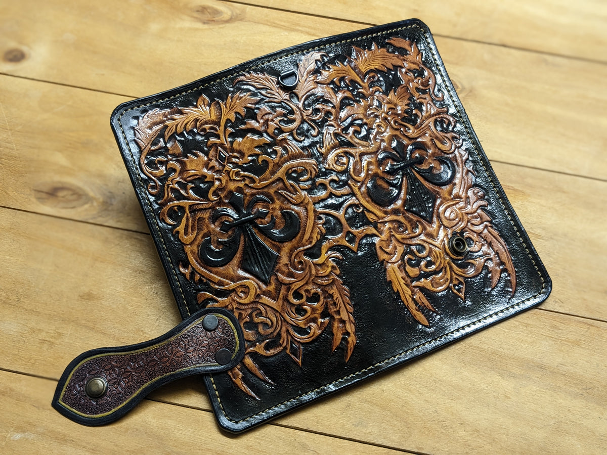 Introducing our exquisite handmade leather wallet, crafted from high-quality vegetable-tanned leather. This unique wallet features stunning hand-tooled and hand-painted designs, making it a true work of art.