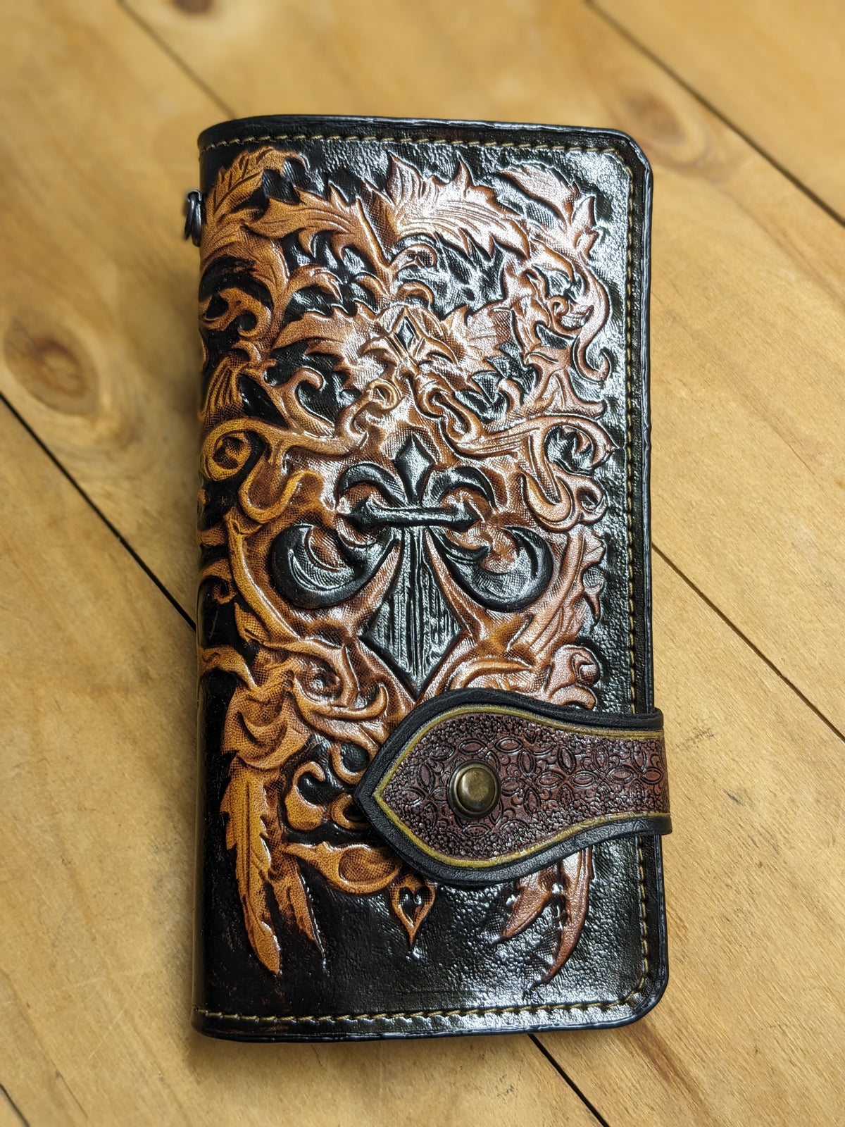 Handmade long leather biker wallet featuring an embossed Fleur-de-lis and Lilium (lily flower) integrated with traditional Sheridan-style floral tooling. Crafted from genuine leather, this elegant yet bold travel clutch wallet combines European symbolism with Western craftsmanship. The Fleur-de-lis, a historic emblem of nobility and purity, adds a regal touch to this rugged accessory. A refined gift for fans of floral design, French heritage, and classic leather artistry.