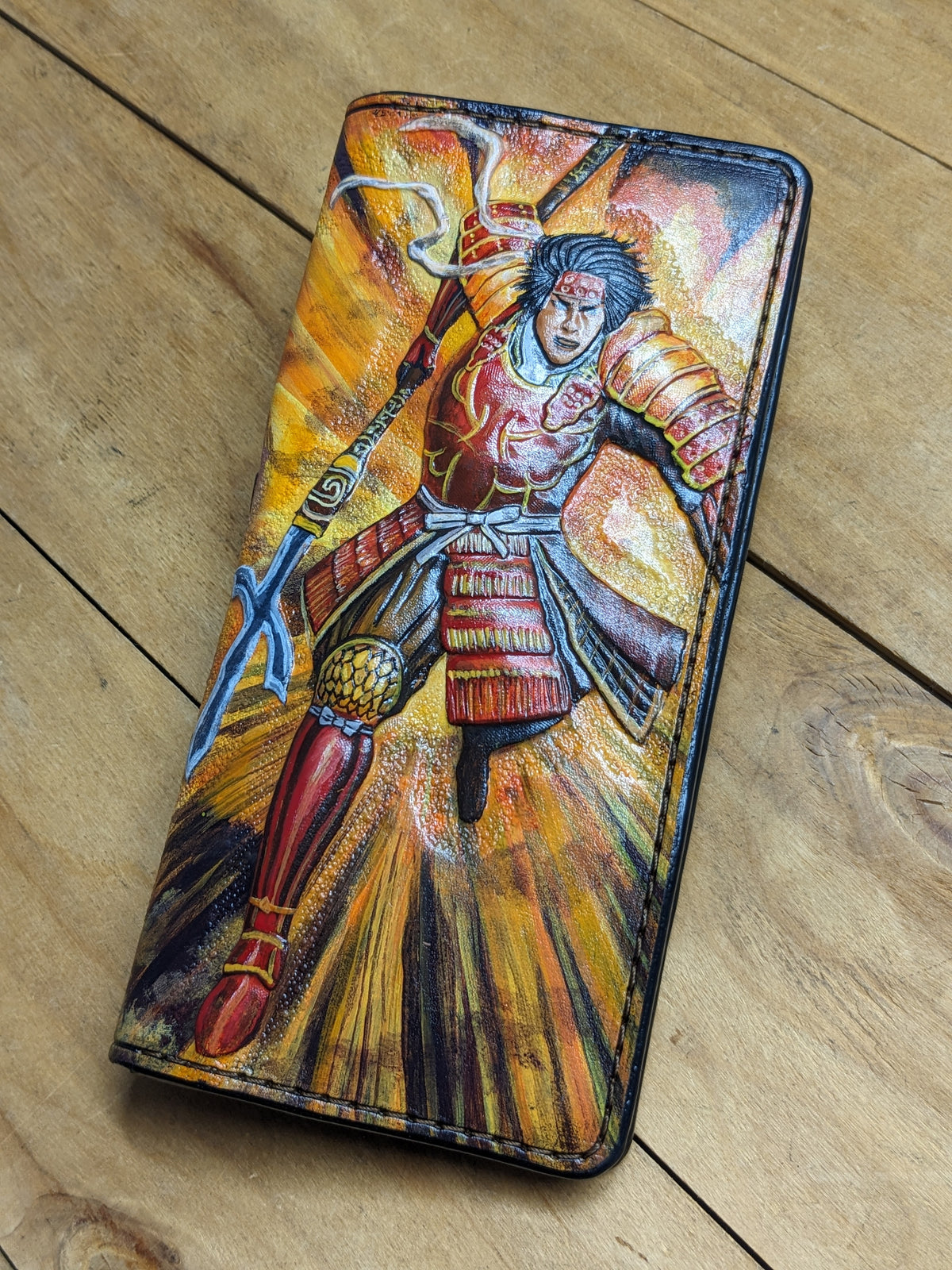 Handmade long leather biker wallet featuring an embossed design of legendary Samurai Yukimura Sanada wielding a traditional Japanese katana sword. Crafted from genuine leather, this bold travel clutch wallet pays tribute to one of Japan’s most revered warriors, known for his bravery, strategy, and honor during the Sengoku period. A striking gift for lovers of samurai culture, martial arts, and Japanese military history.