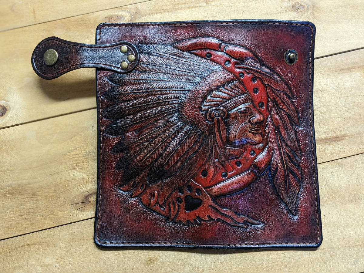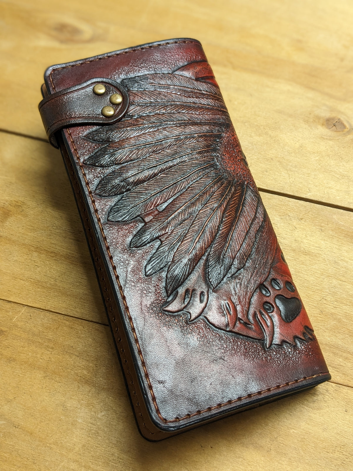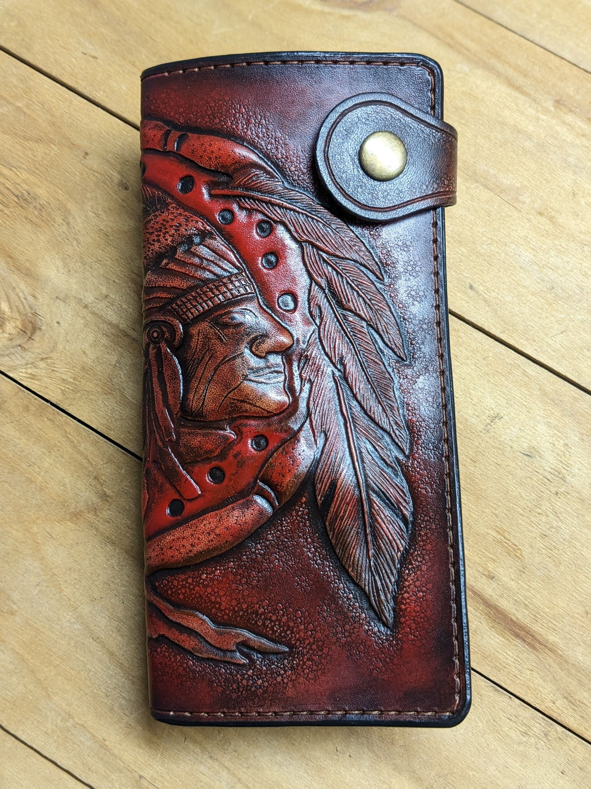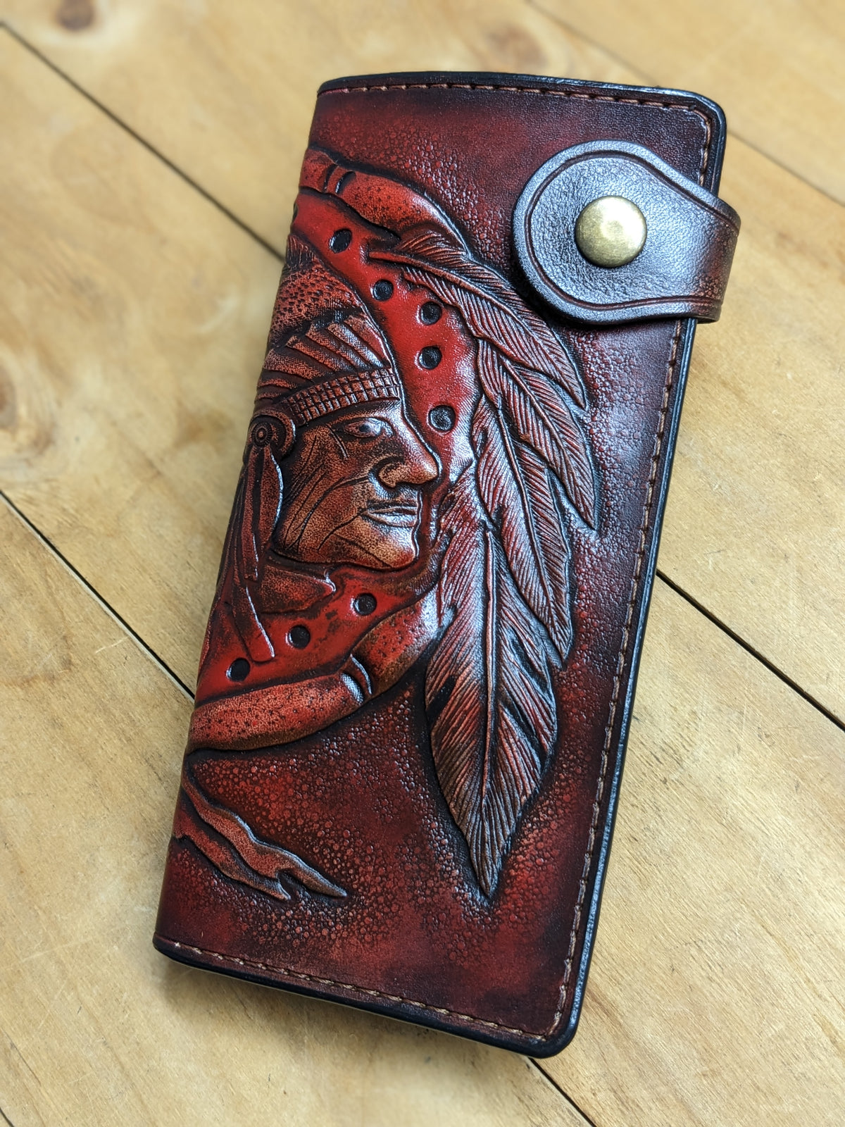 Handmade long leather biker wallet featuring an embossed design of a Native American Indian chief wearing a majestic warrior headdress. Crafted from genuine leather, this travel clutch wallet honors indigenous heritage, strength, and sacred tradition. Rich in detail and symbolism, it’s a meaningful piece for those who respect Native American culture, tribal art, and warrior spirit. A bold and respectful gift for collectors, history lovers, and free spirits.