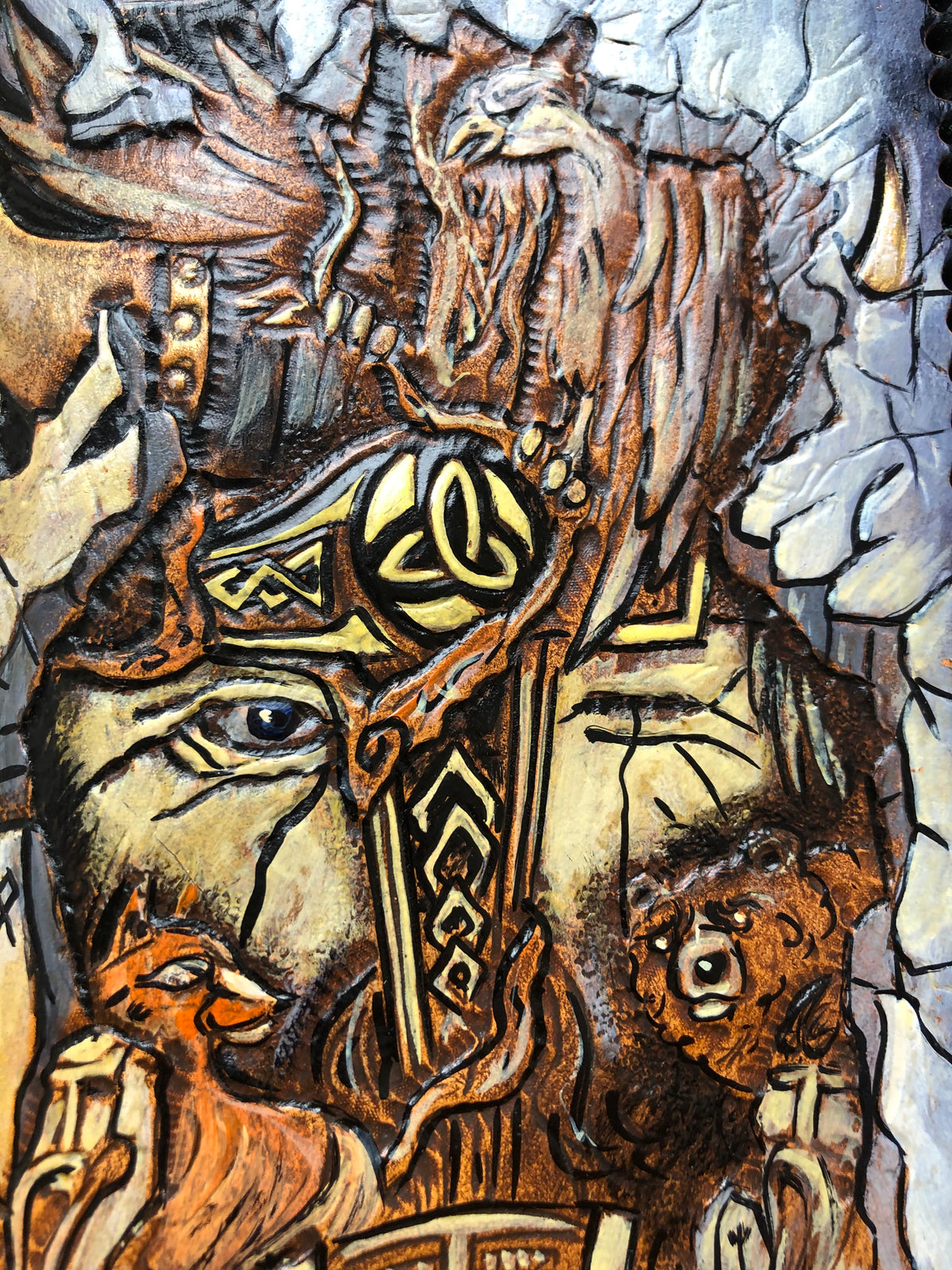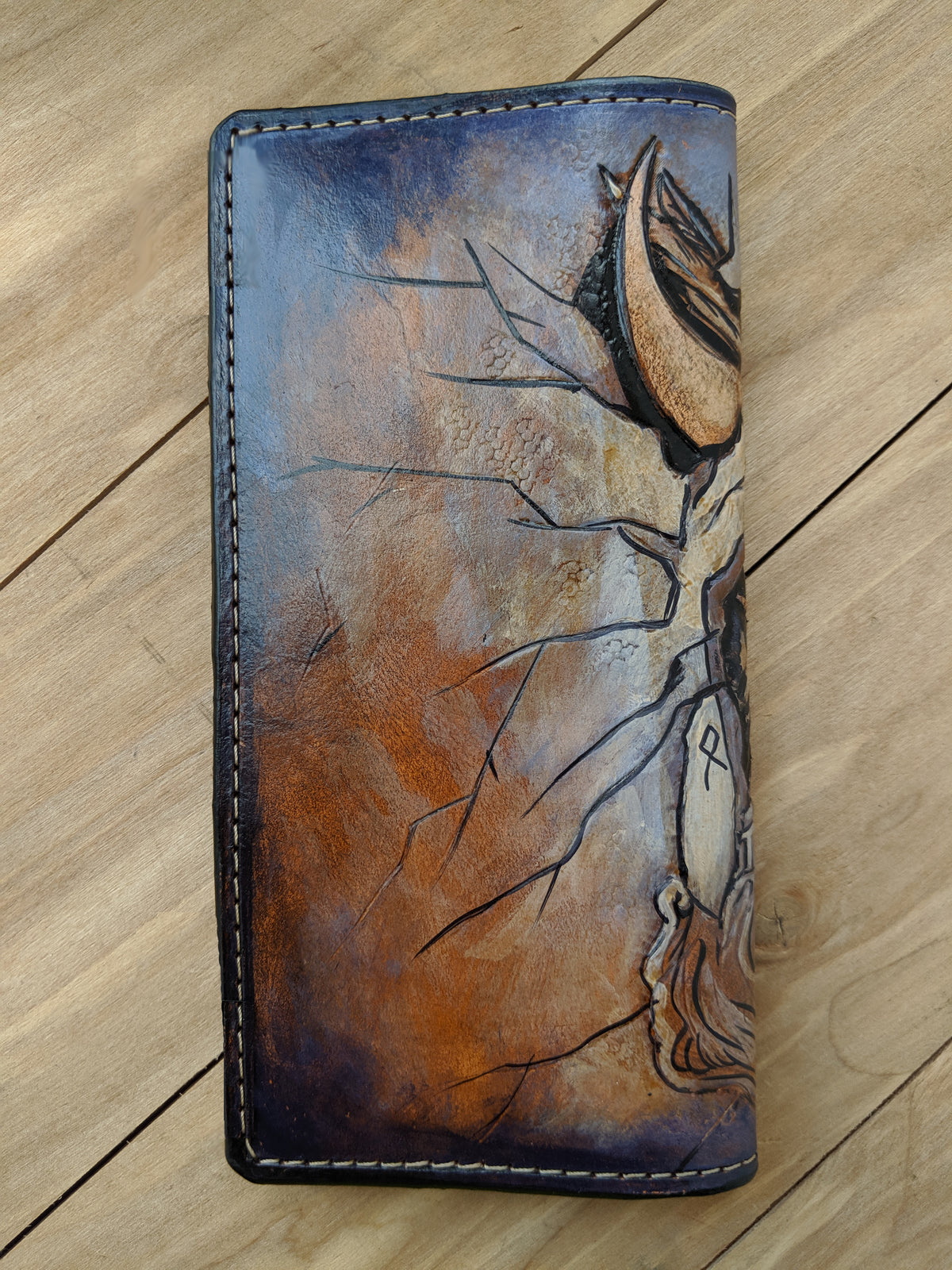 Introducing our exquisite handmade leather wallet, crafted from high-quality vegetable-tanned leather. This unique wallet features stunning hand-tooled and hand-painted designs, making it a true work of art.