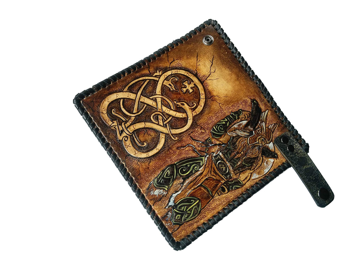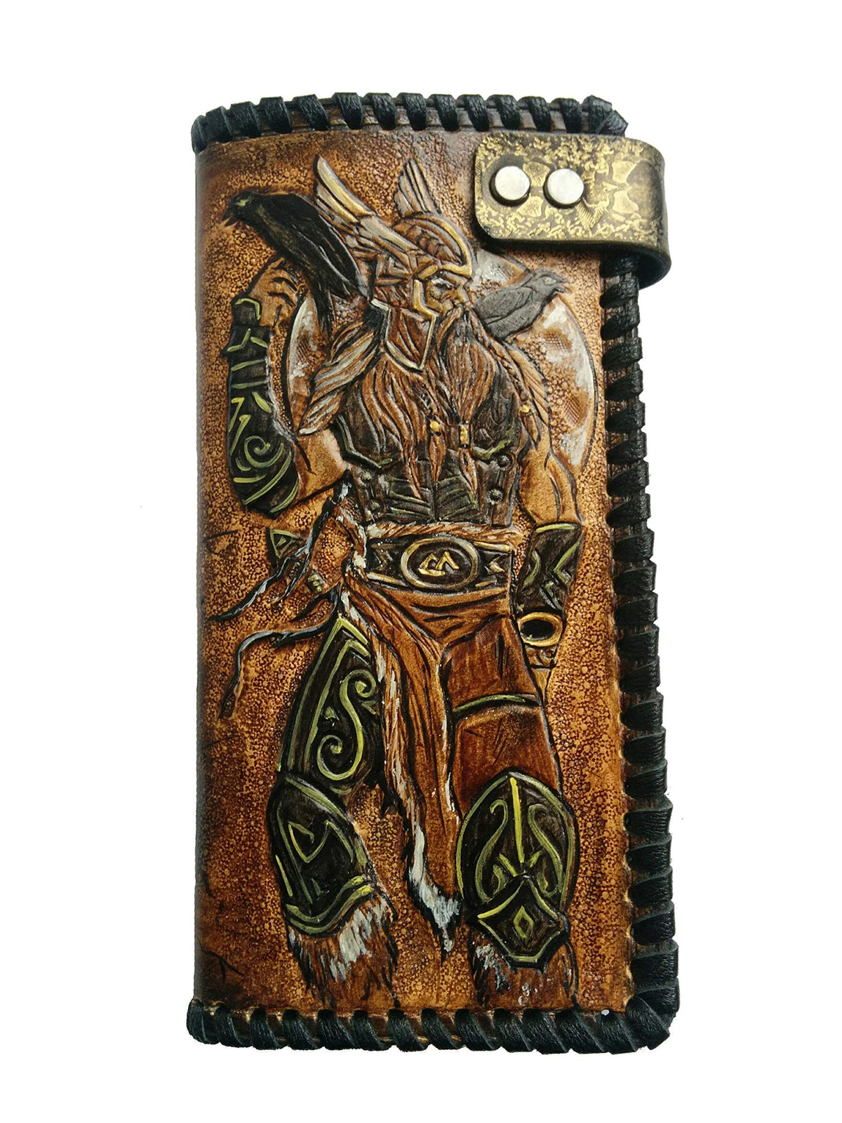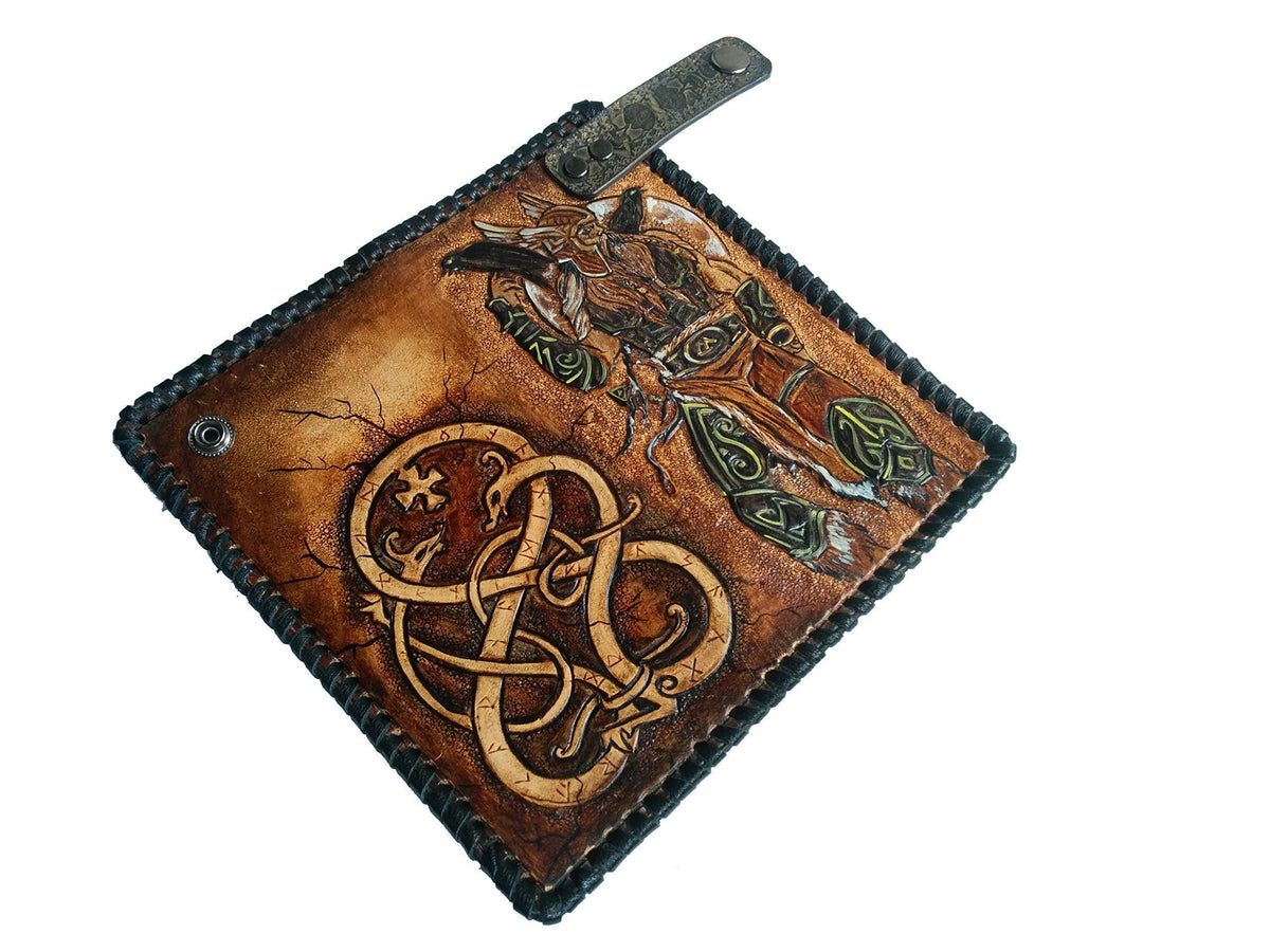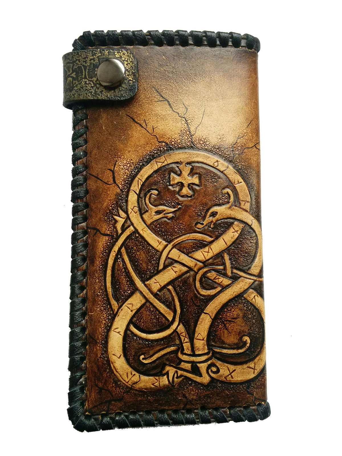 Handmade long leather biker wallet featuring an embossed design of Celtic knotwork serpents and Odin’s ravens, Huginn and Muninn—symbols of thought and memory in Norse mythology. Crafted from genuine leather, this travel clutch wallet unites Viking lore with Celtic artistry, representing wisdom, protection, and divine vision. A powerful gift for fans of Nordic culture, pagan symbolism, and lovers of ancient myth.