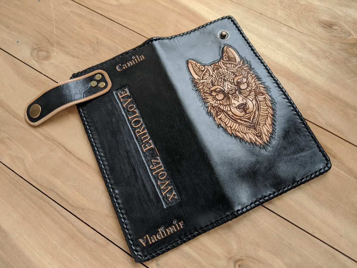 Handmade long leather biker wallet featuring an embossed grey wolf in striking Celtic knot tattoo style—a symbol of strength, instinct, and Norse wild spirit. Crafted from genuine leather, this travel clutch wallet blends Viking heritage with tribal art, celebrating the deep bond between man, beast, and myth. A perfect gift for lovers of wolves, Celtic and Norse mythology, and bold symbolic design.