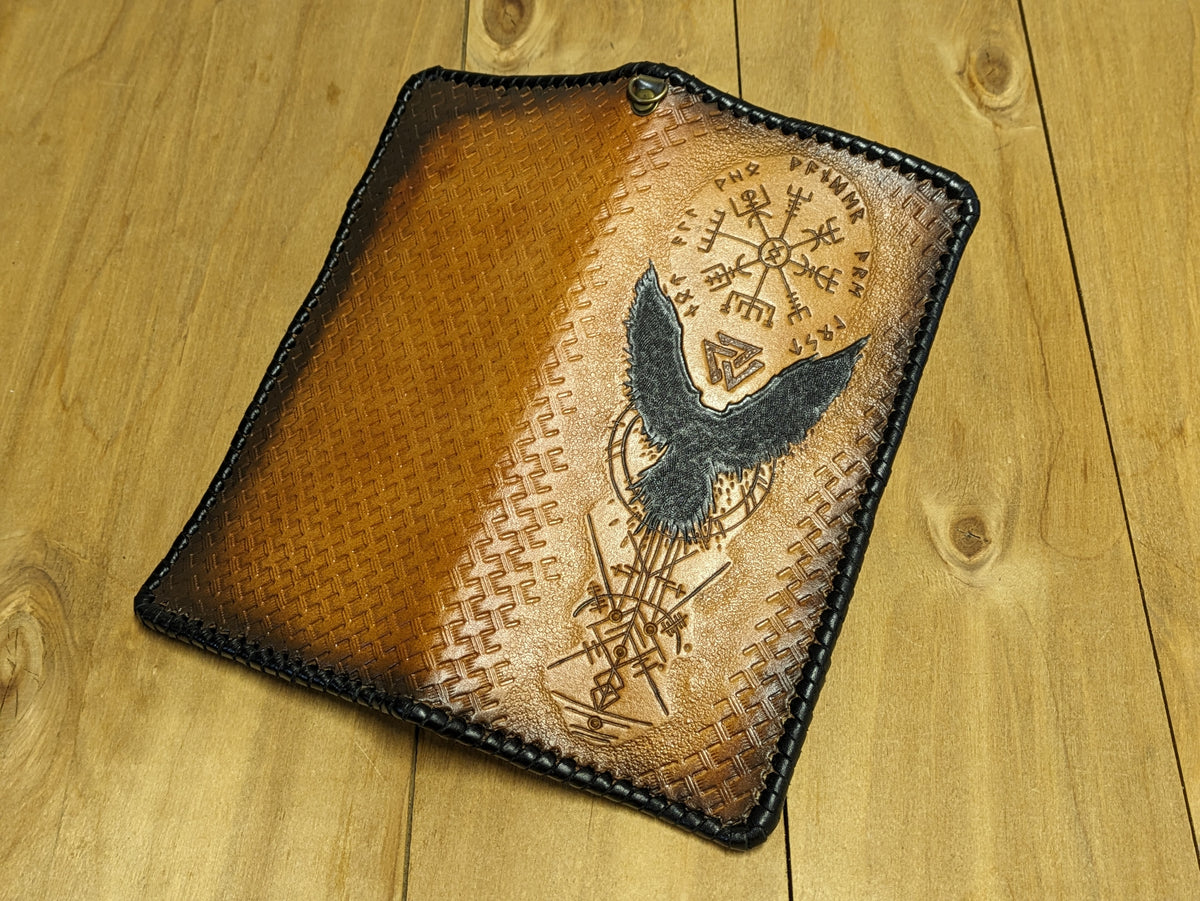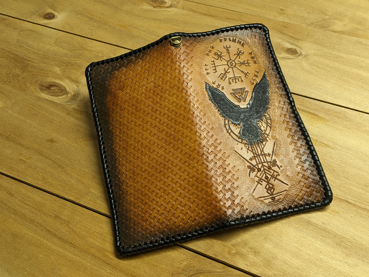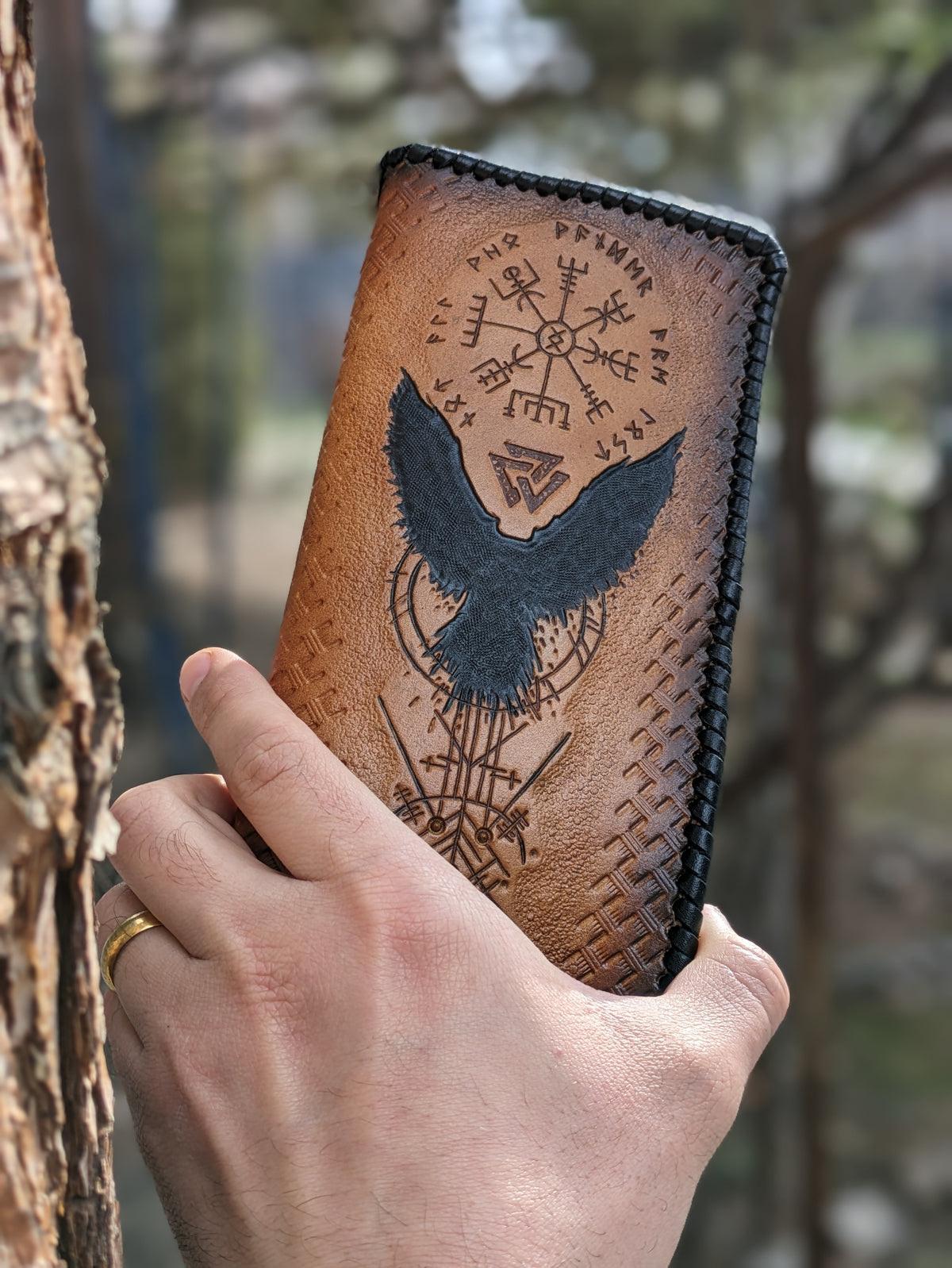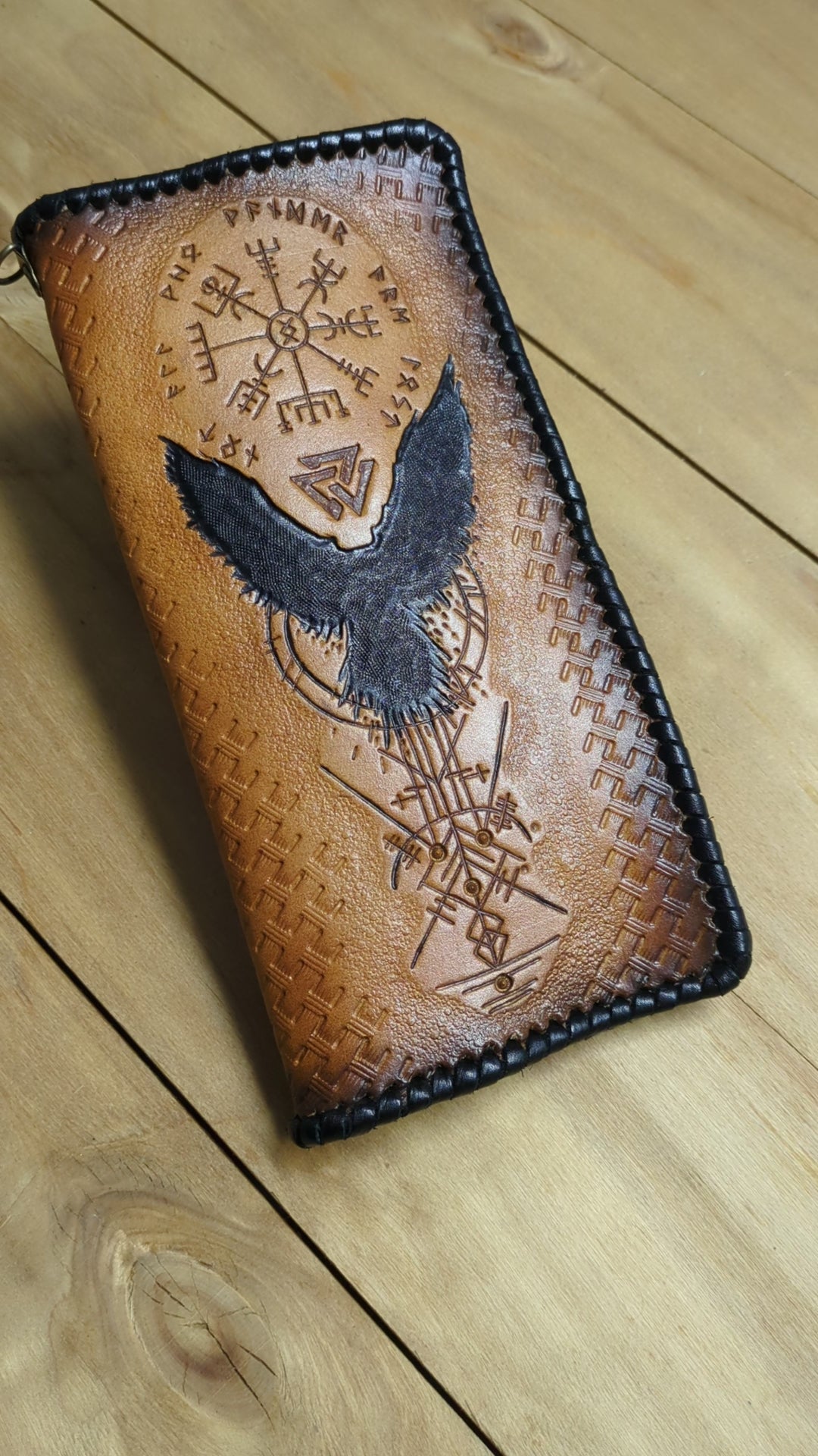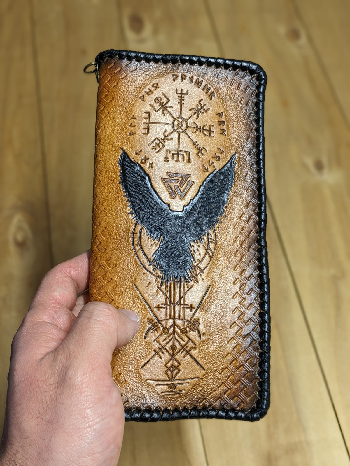 Handmade long leather biker wallet featuring powerful Norse symbols: the Vegvisir (Viking compass) for guidance, Odin’s raven, the Valknut symbol of Valhalla, and ancient runic inscriptions. Crafted from genuine leather, this travel clutch wallet is a tribute to Viking spirituality, warrior wisdom, and Norse mythology. A meaningful gift for fans of pagan heritage, Odin’s path, and seekers of symbolic protection and strength.