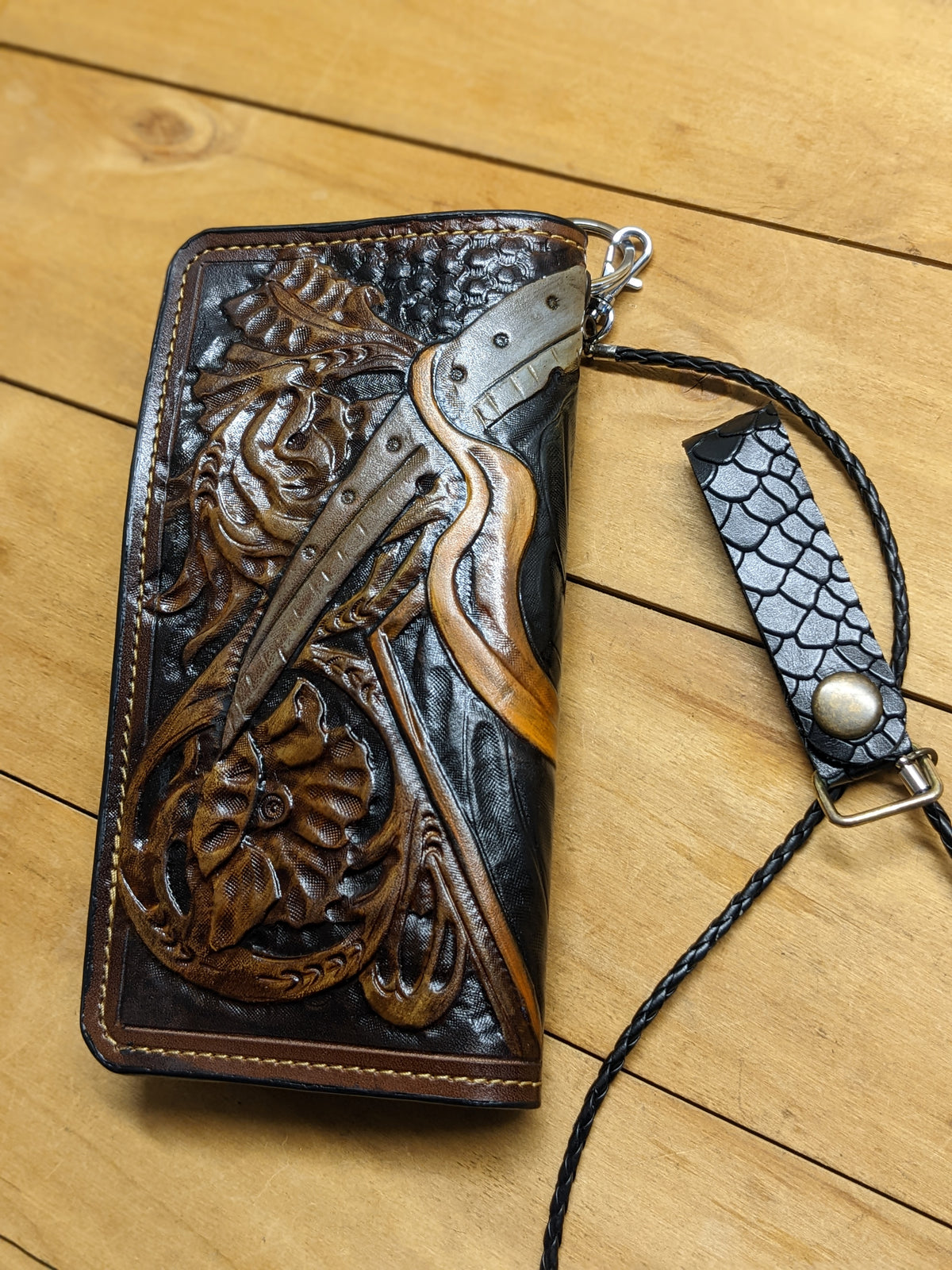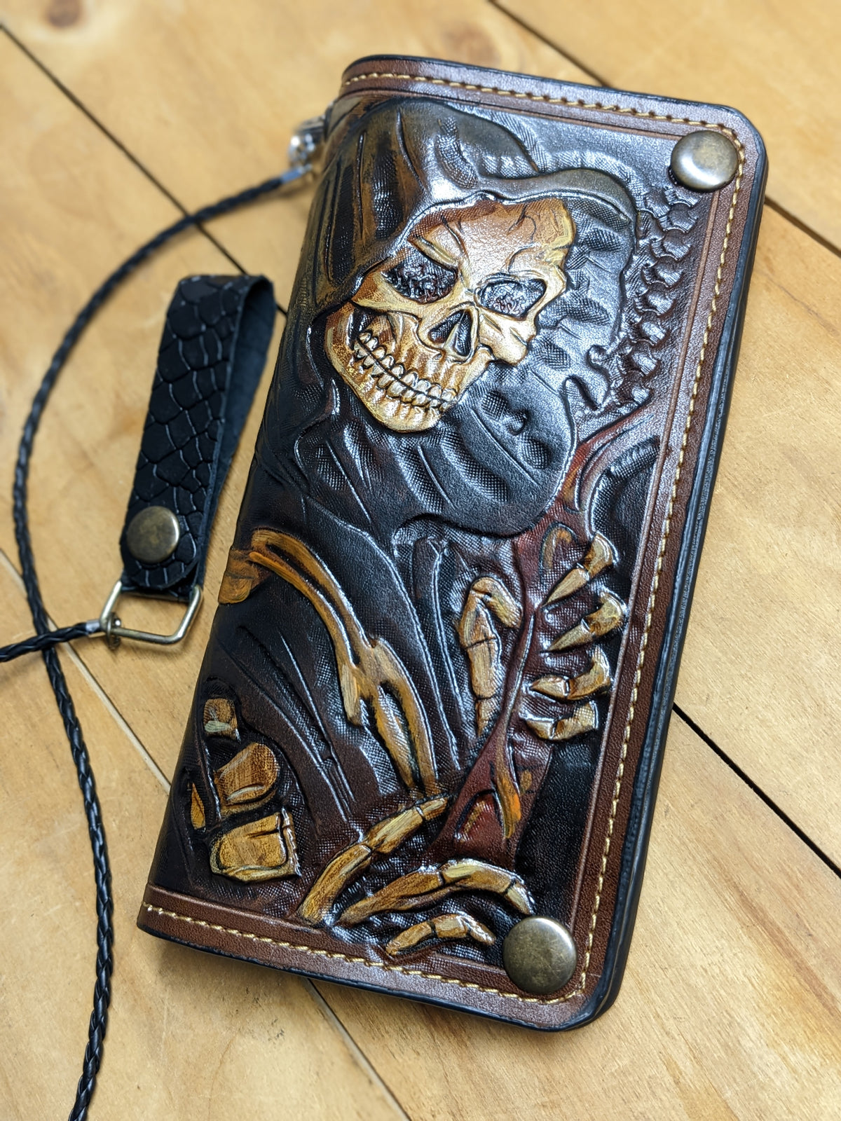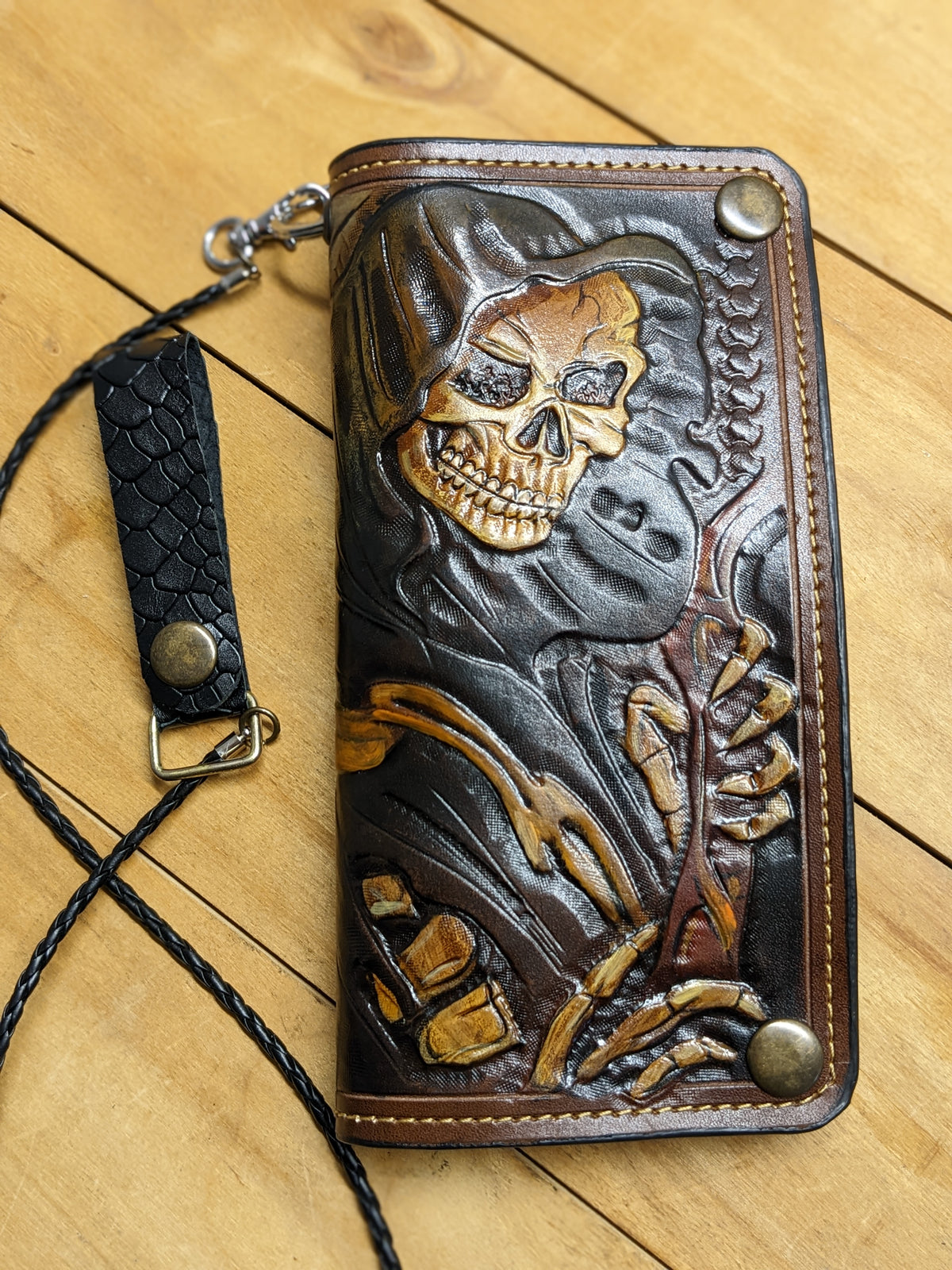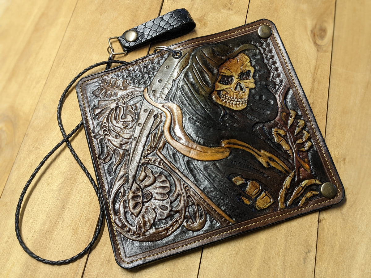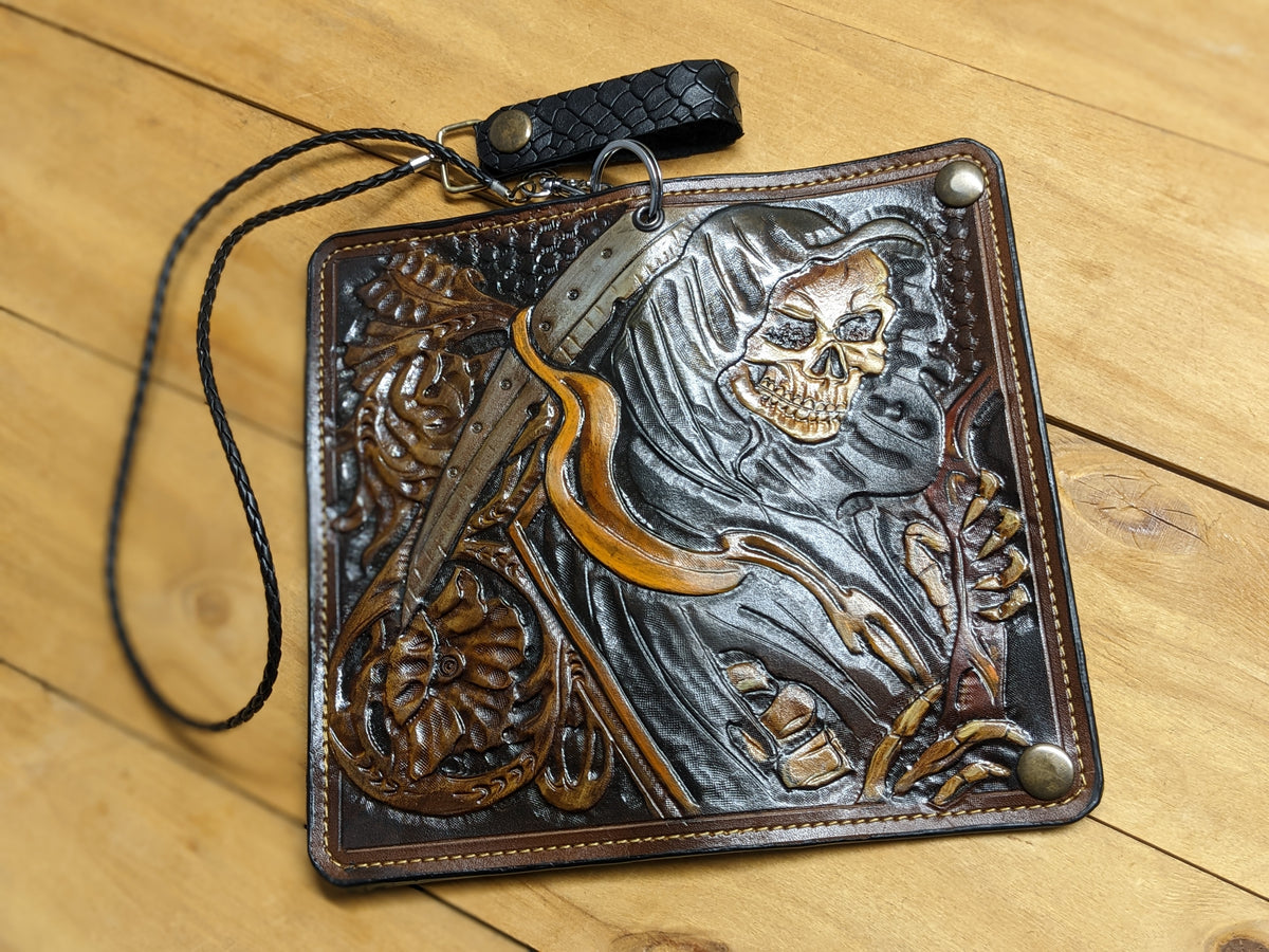 Handmade long leather biker wallet featuring an embossed grim skull, skeleton figure, and a haunting hourglass, symbolizing the passage of time and the inevitability of fate. Crafted from genuine leather, this dark and powerful travel clutch wallet captures gothic mystery and biker spirit. A bold and meaningful gift for fans of skull art, gothic horror, heavy metal, and riders who live on the edge.