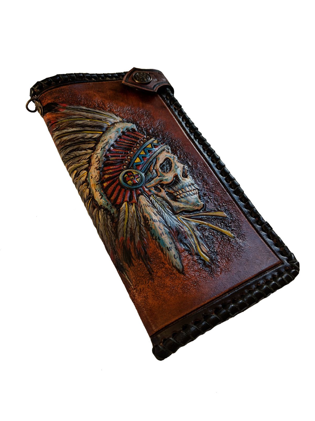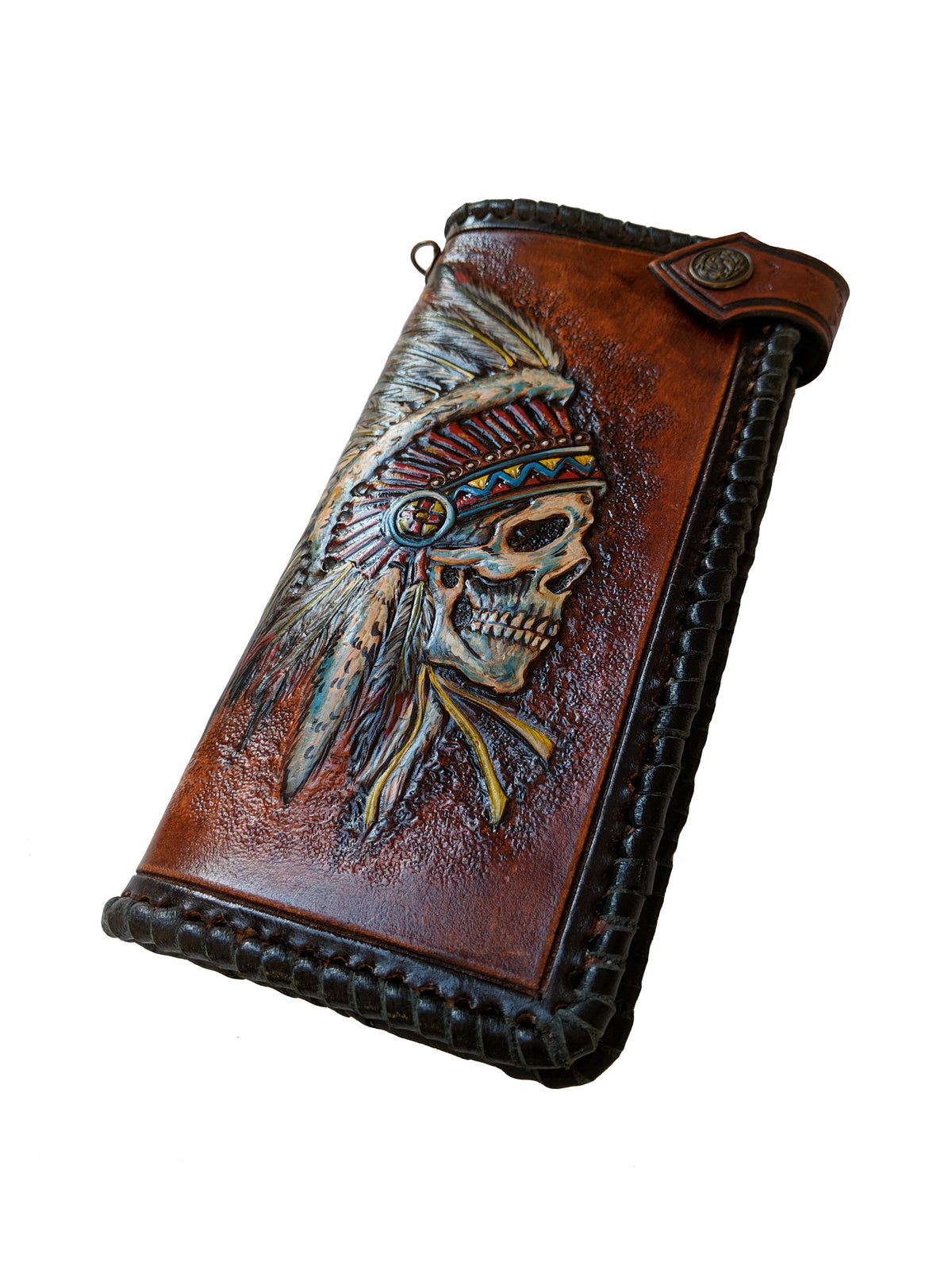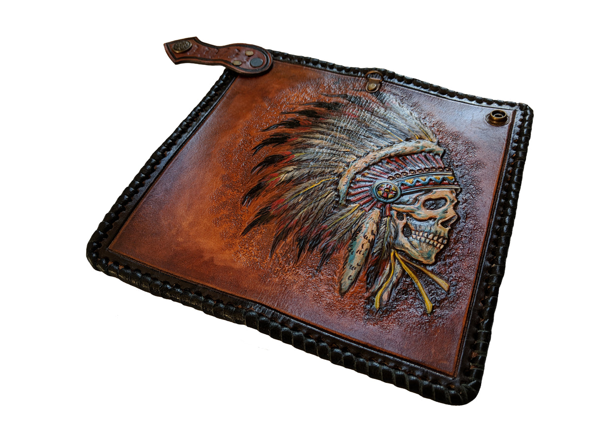 Handmade long leather biker wallet featuring an embossed Apache Native American chief skull with a full feathered war headdress. Crafted from genuine leather, this travel clutch wallet symbolizes warrior spirit, ancestral pride, and cultural power. Rich in tribal detail and bold Western flair, it’s the perfect gift for admirers of Native American heritage, spiritual symbolism, and rugged artistic style.