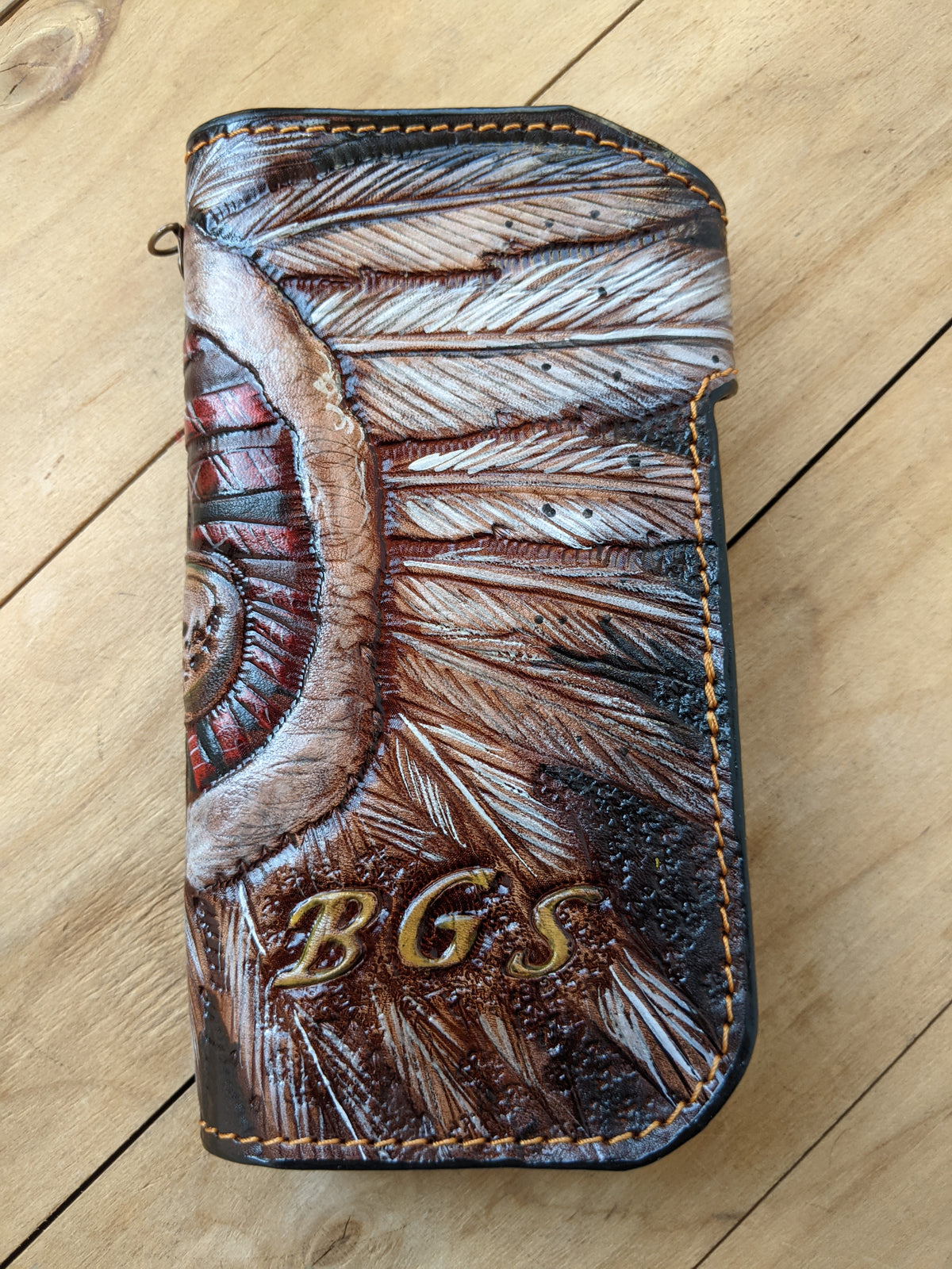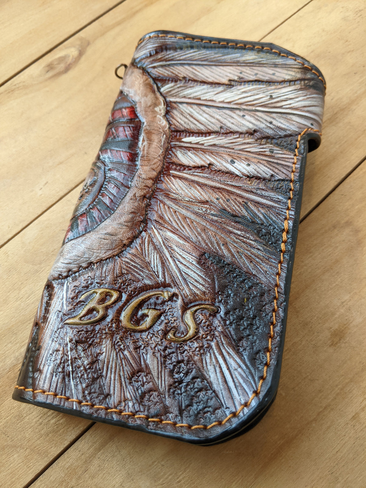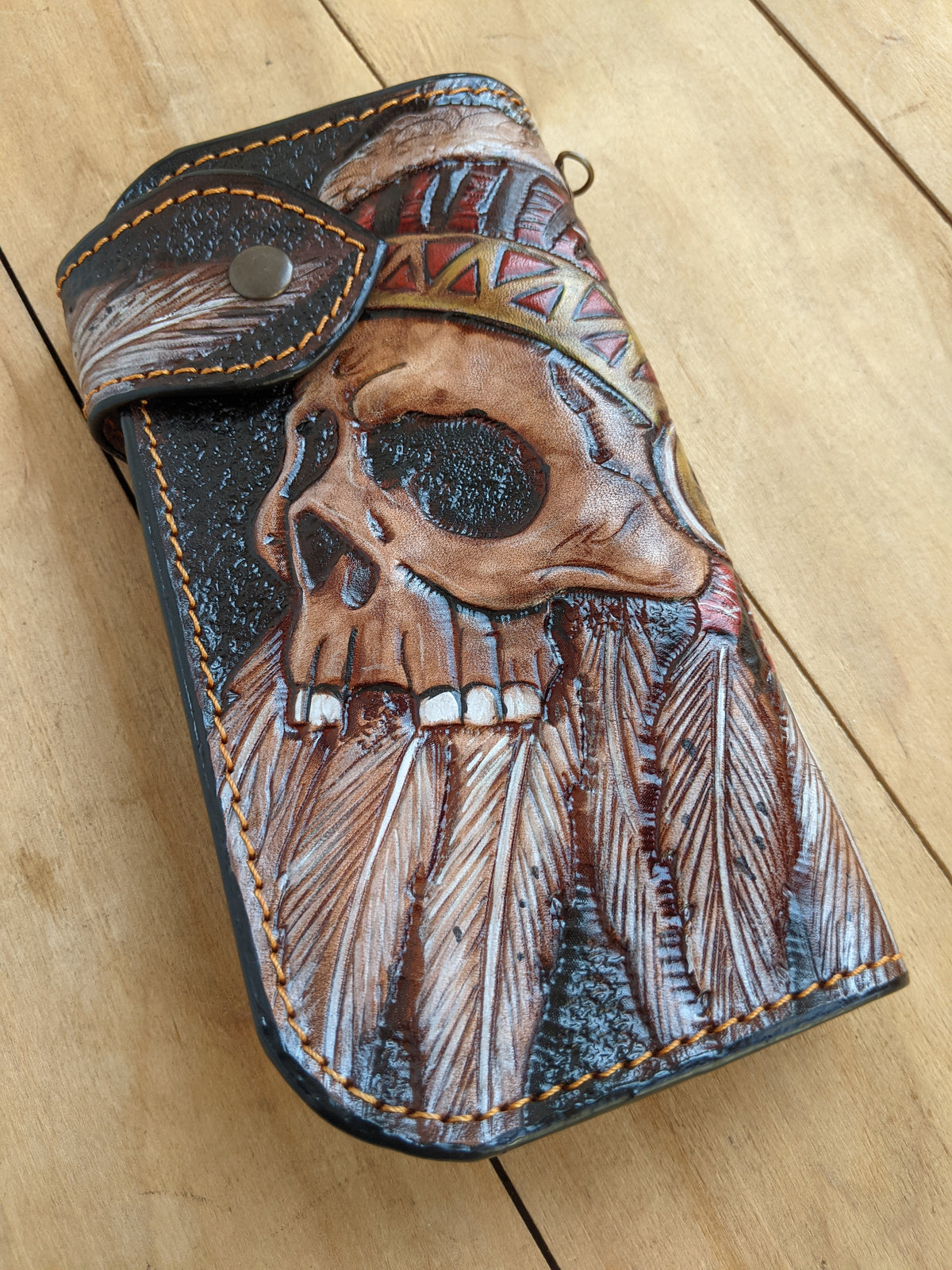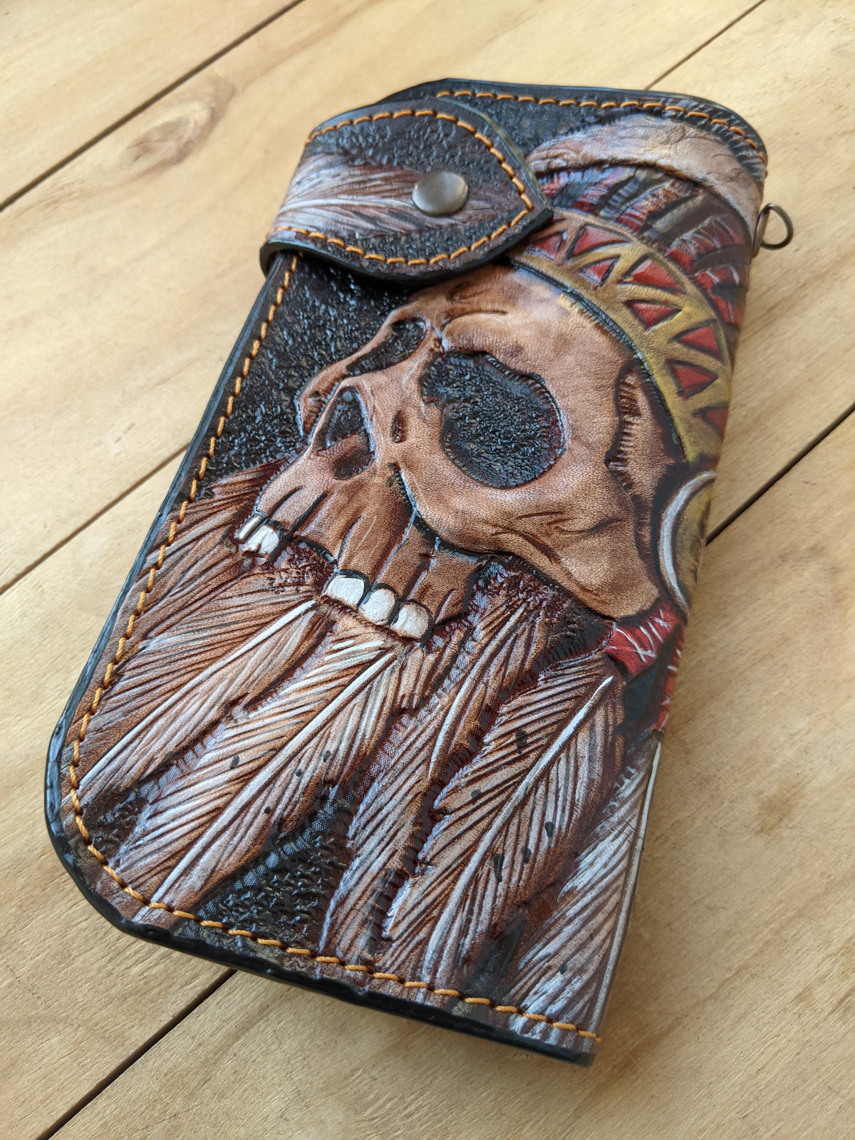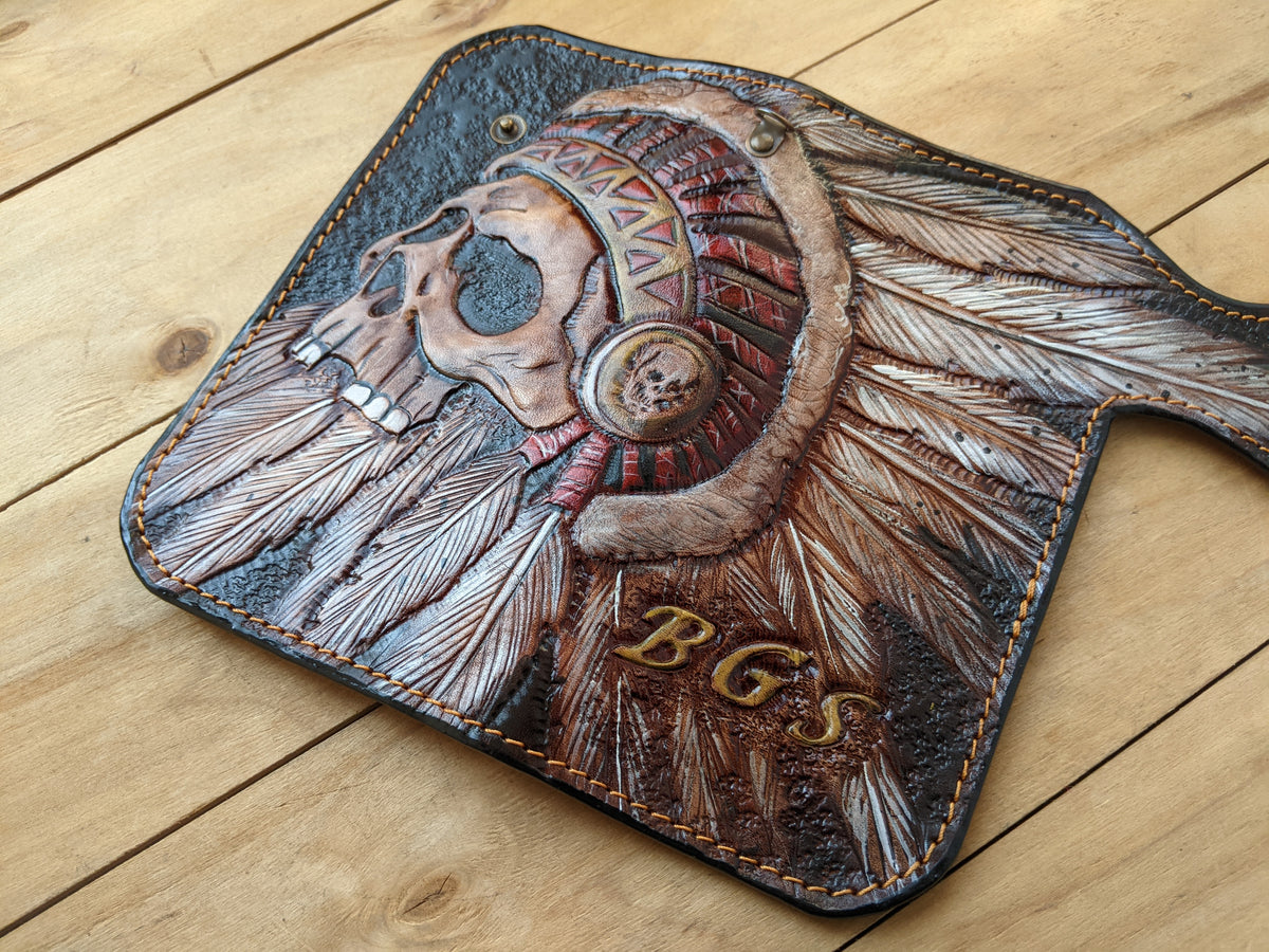 Handmade long leather biker wallet featuring an embossed Apache Native American chief skull wearing a detailed feathered war headdress. Crafted from genuine leather, this bold travel clutch wallet honors the warrior spirit, cultural pride, and legacy of Native American heritage. With strong Western styling and symbolic design, it’s a powerful gift for admirers of tribal art, spiritual symbolism, and indigenous culture.