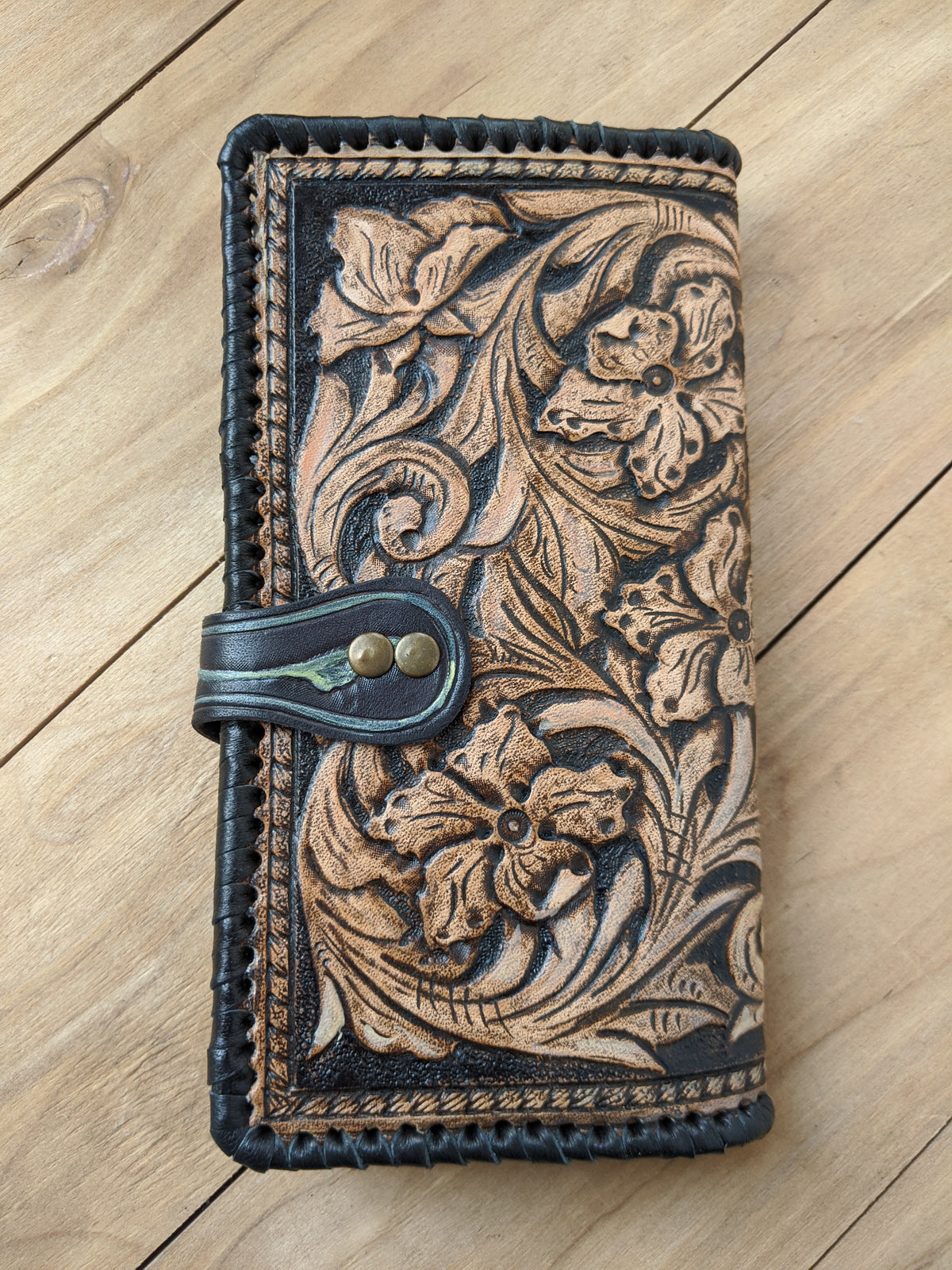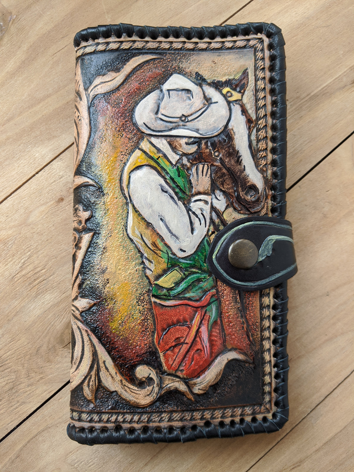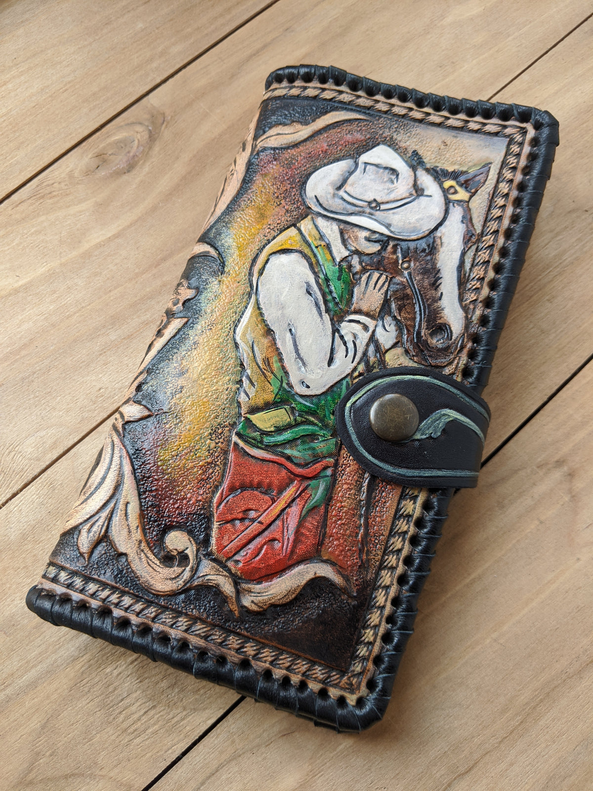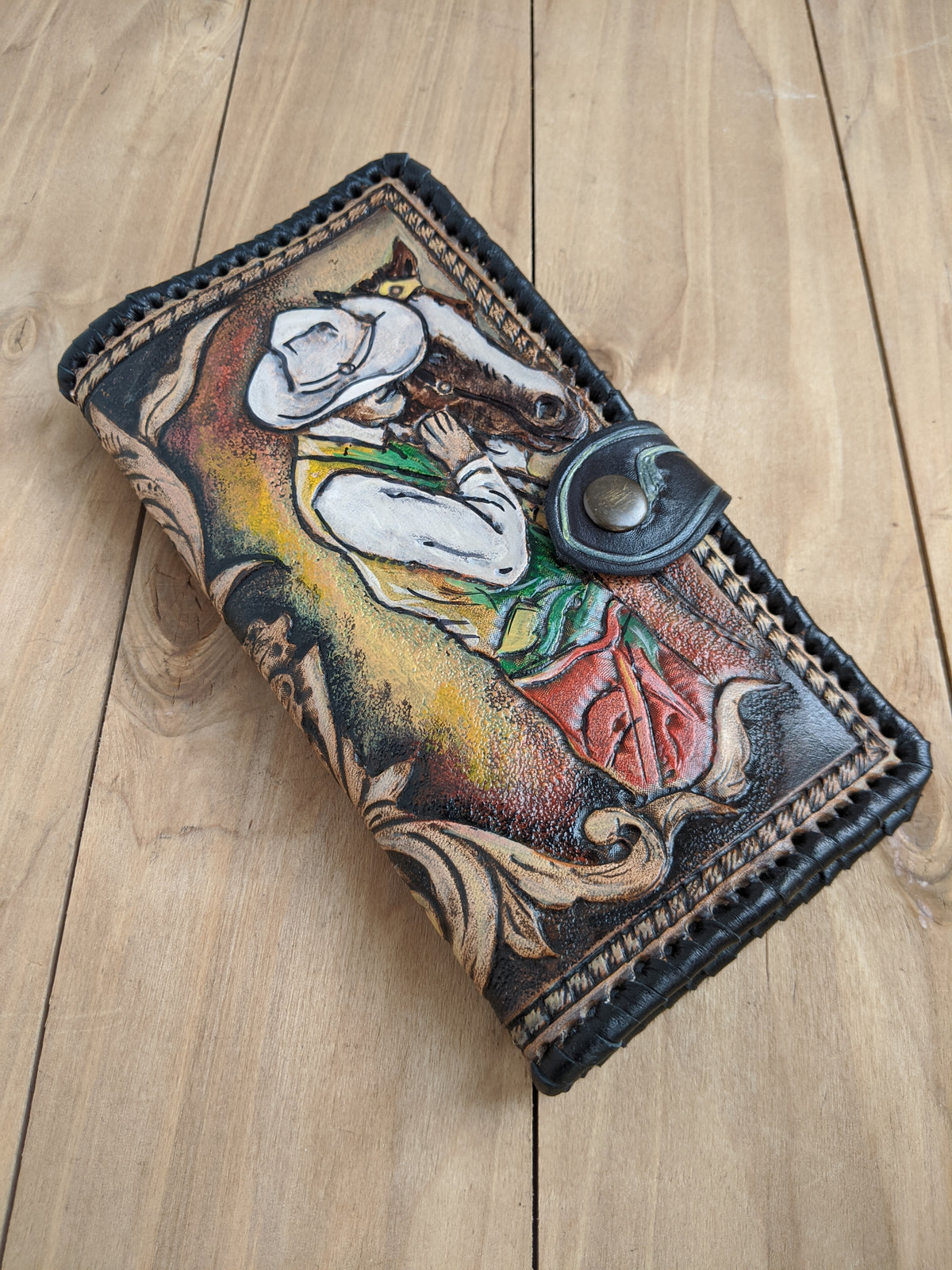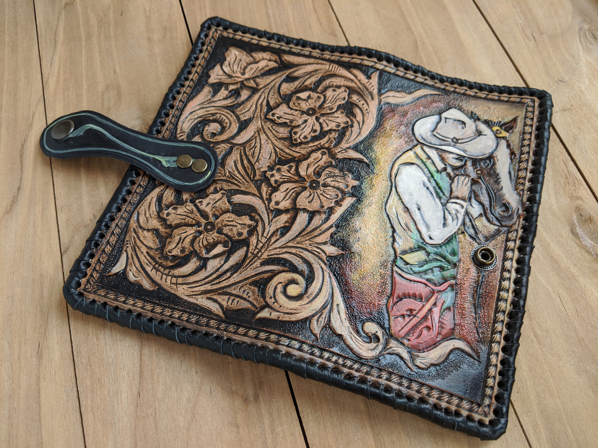 Handmade long leather biker wallet featuring an embossed Western rodeo cowboy on horseback surrounded by elegant Boho floral Sheridan-style patterns. Crafted from genuine leather, this travel clutch wallet blends rugged Western tradition with artistic floral detail. A perfect gift for rodeo fans, horse lovers, cowgirls, cowboys, and those who appreciate Bohemian Western charm.