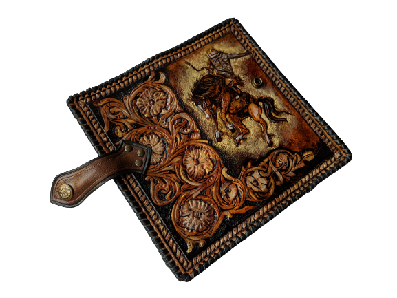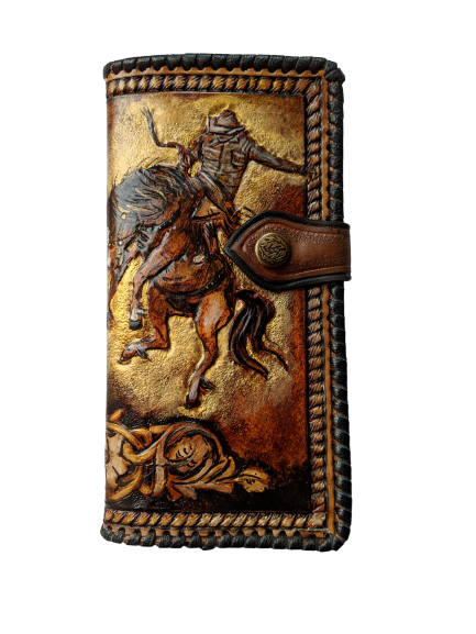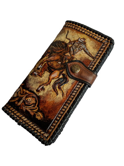 Handmade long leather biker wallet featuring an embossed Western rodeo cowboy on horseback surrounded by elegant Boho floral Sheridan-style patterns. Crafted from genuine leather, this travel clutch wallet blends rugged Western tradition with artistic floral detail. A perfect gift for rodeo fans, horse lovers, cowgirls, cowboys, and those who appreciate Bohemian Western charm.