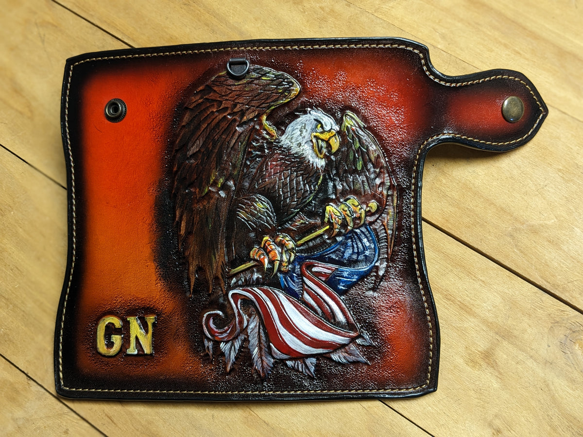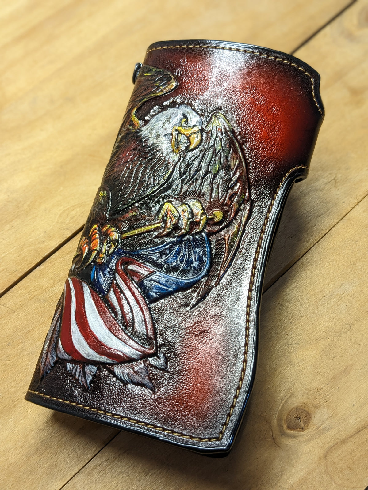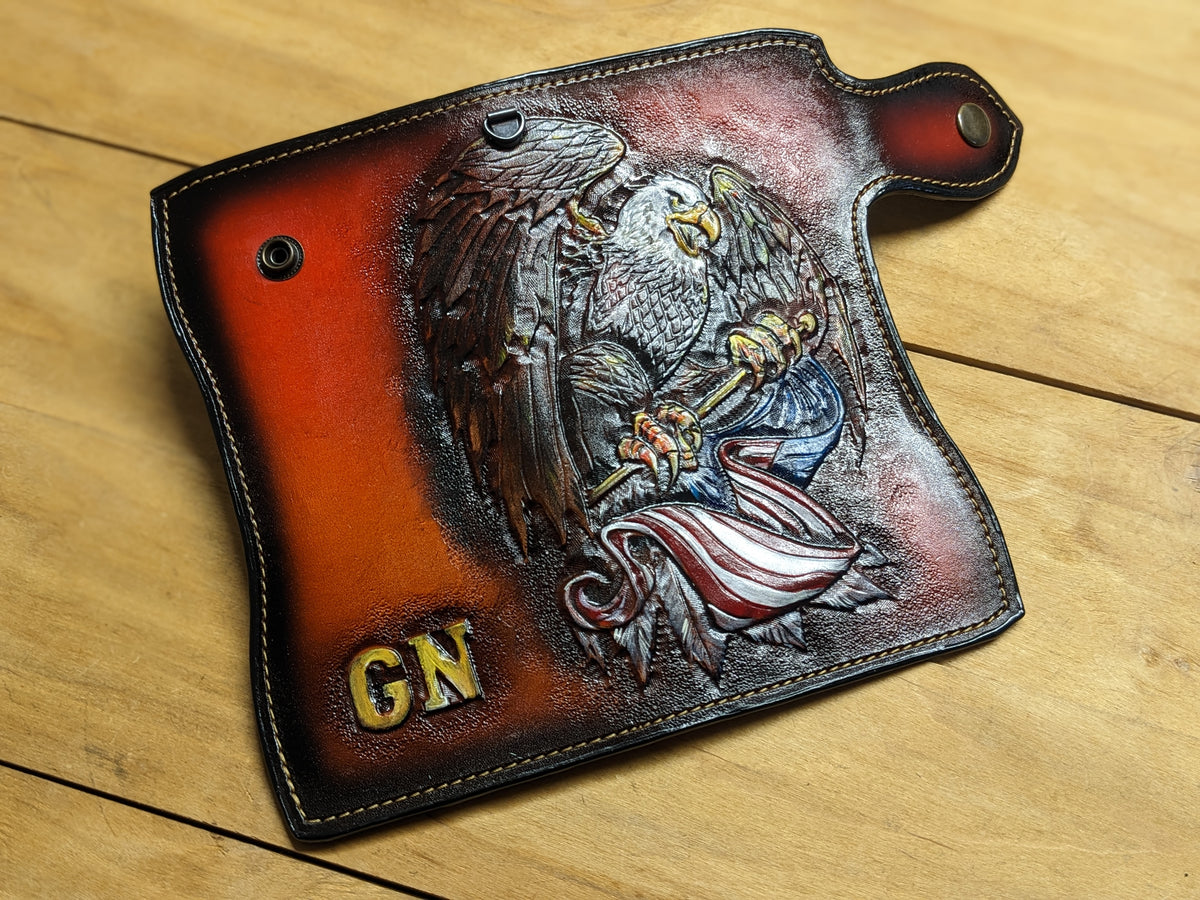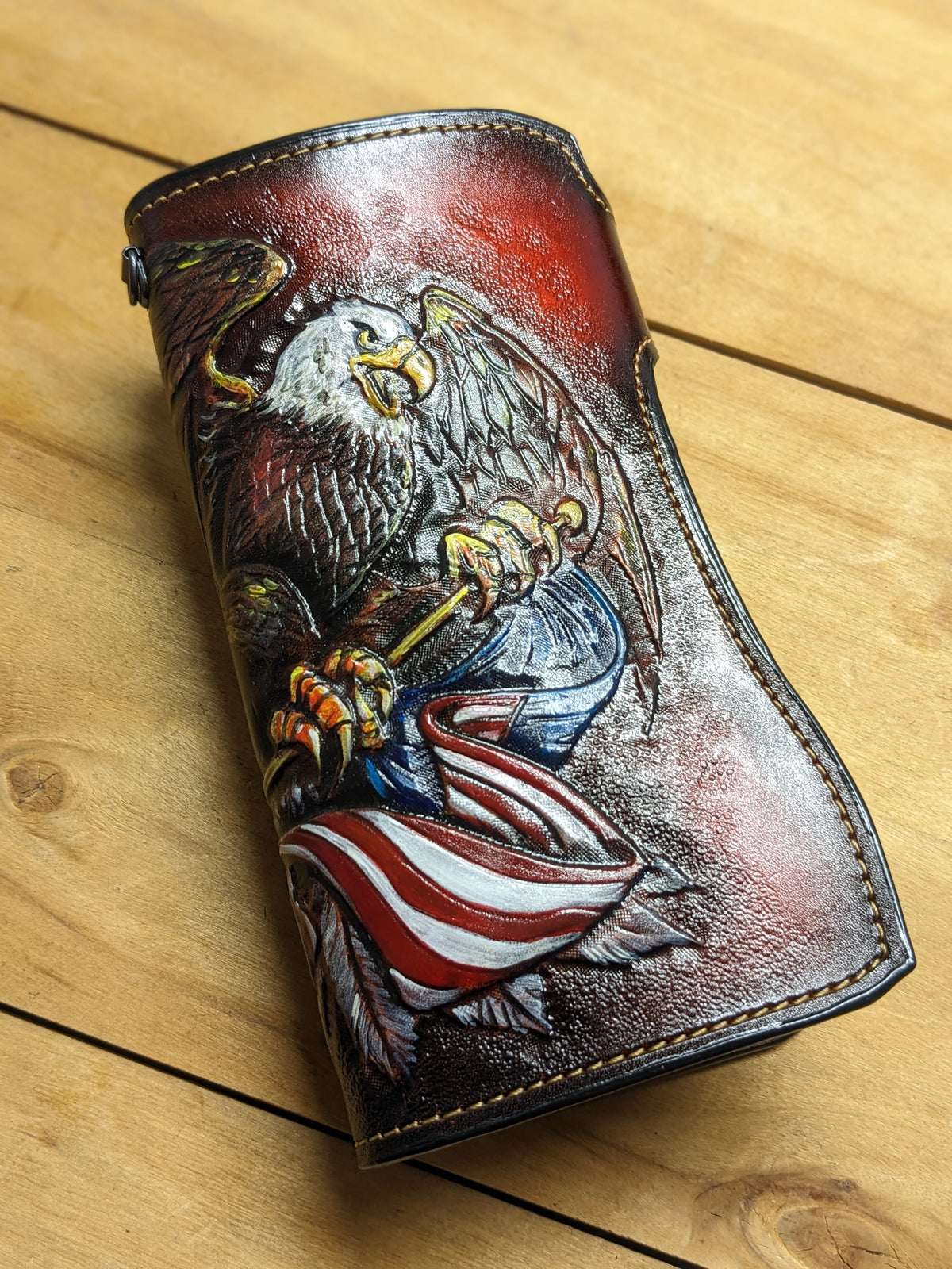 Handmade long leather biker wallet featuring an embossed American flag and majestic bald eagle, symbolizing strength, freedom, and patriotism. Crafted from genuine leather, this bold travel clutch wallet honors the spirit of the U.S. military, veterans, and all who stand for liberty. A proud and meaningful gift for service members, patriots, veterans, bikers, and lovers of American heritage.