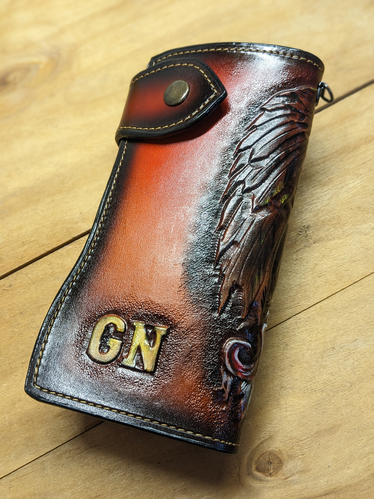 Introducing our exquisite handmade leather wallet, crafted from high-quality vegetable-tanned leather. This unique wallet features stunning hand-tooled and hand-painted designs, making it a true work of art.