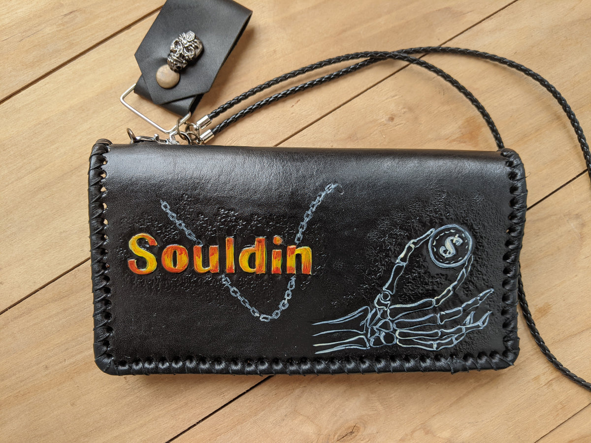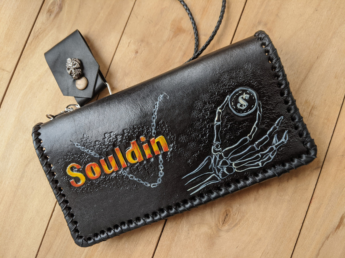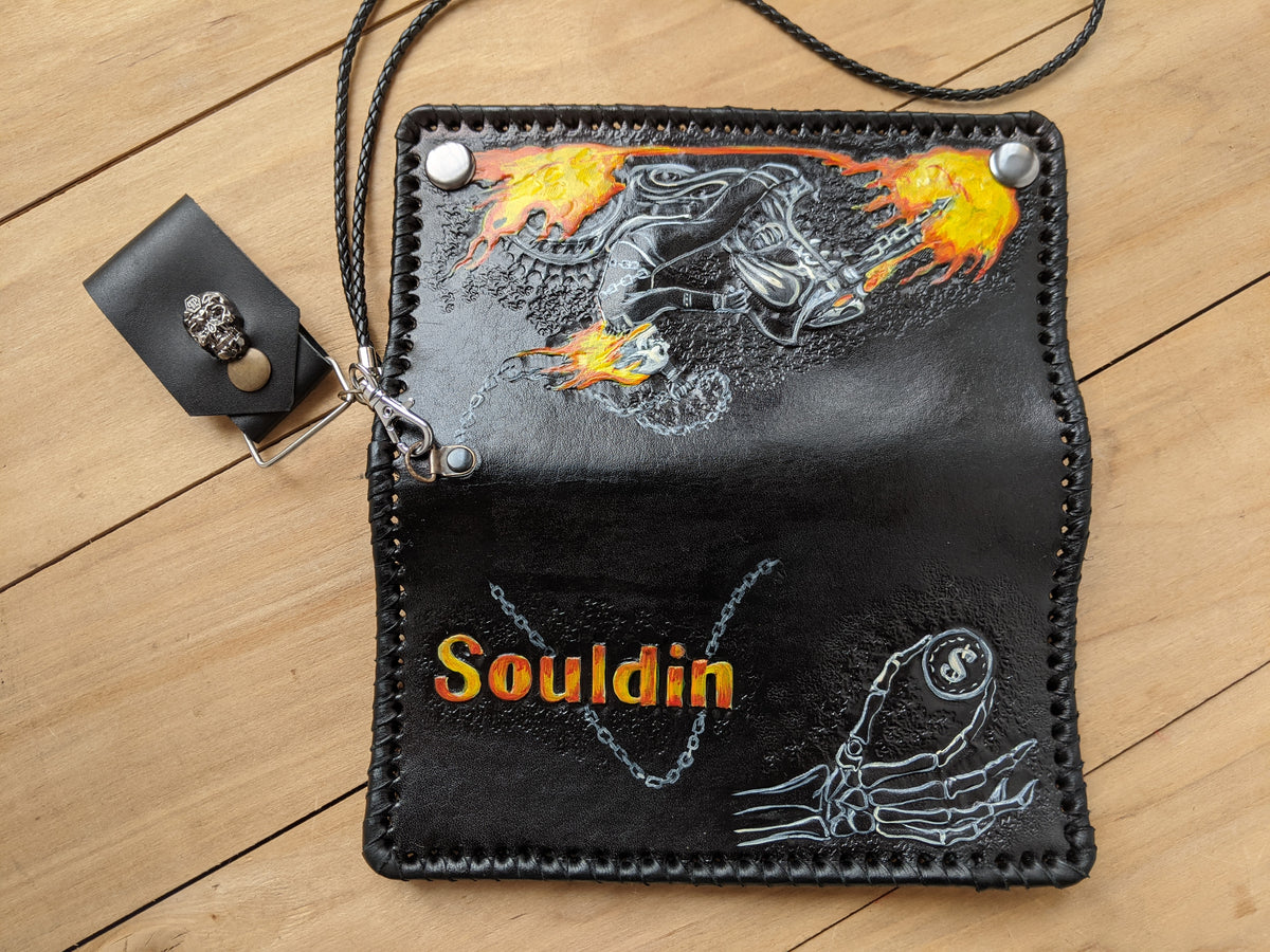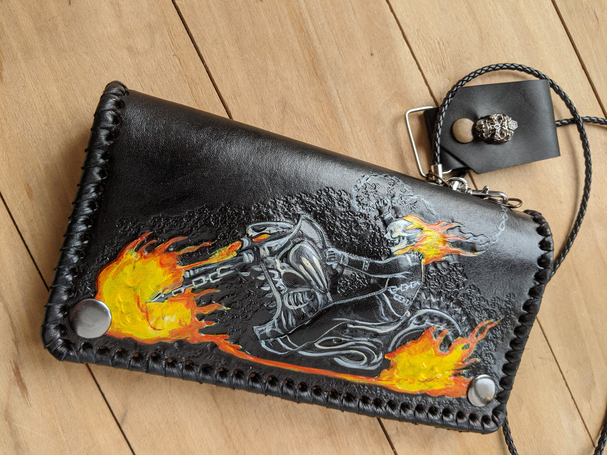 Handmade long leather biker chain wallet featuring an intense embossed design inspired by Ghost Rider—complete with a flaming skull, motorcycle, and fiery spirit of vengeance. Crafted from genuine leather and fitted with a sturdy chain, this travel clutch wallet is perfect for fans of dark comics, supernatural antiheroes, and rebellious road warriors. A fierce gift for bikers, Marvel fans, skull art lovers, and riders with a taste for fire and fury.